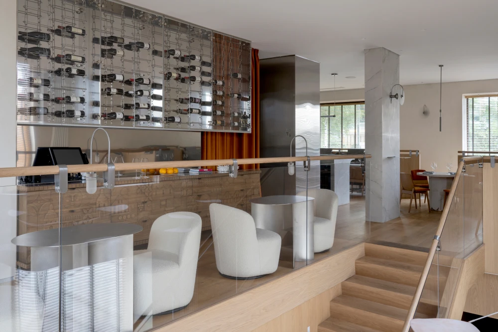 «Мы начали работу с абсолютно пустого семиметрового бетонного объема — с чистого листа. Главные парадные двери были разделены на два самостоятельных входа: один — гостевой, другой — для персонала, ведущий в технические помещения и кухню. На первом уровне удалось выделить зоны для welcome-бара и вип-зала. Центром композиции стала парадная лестница, ведущая на второй этаж. Здесь разместились основная посадка, главный бар, винное хранение и санузлы».