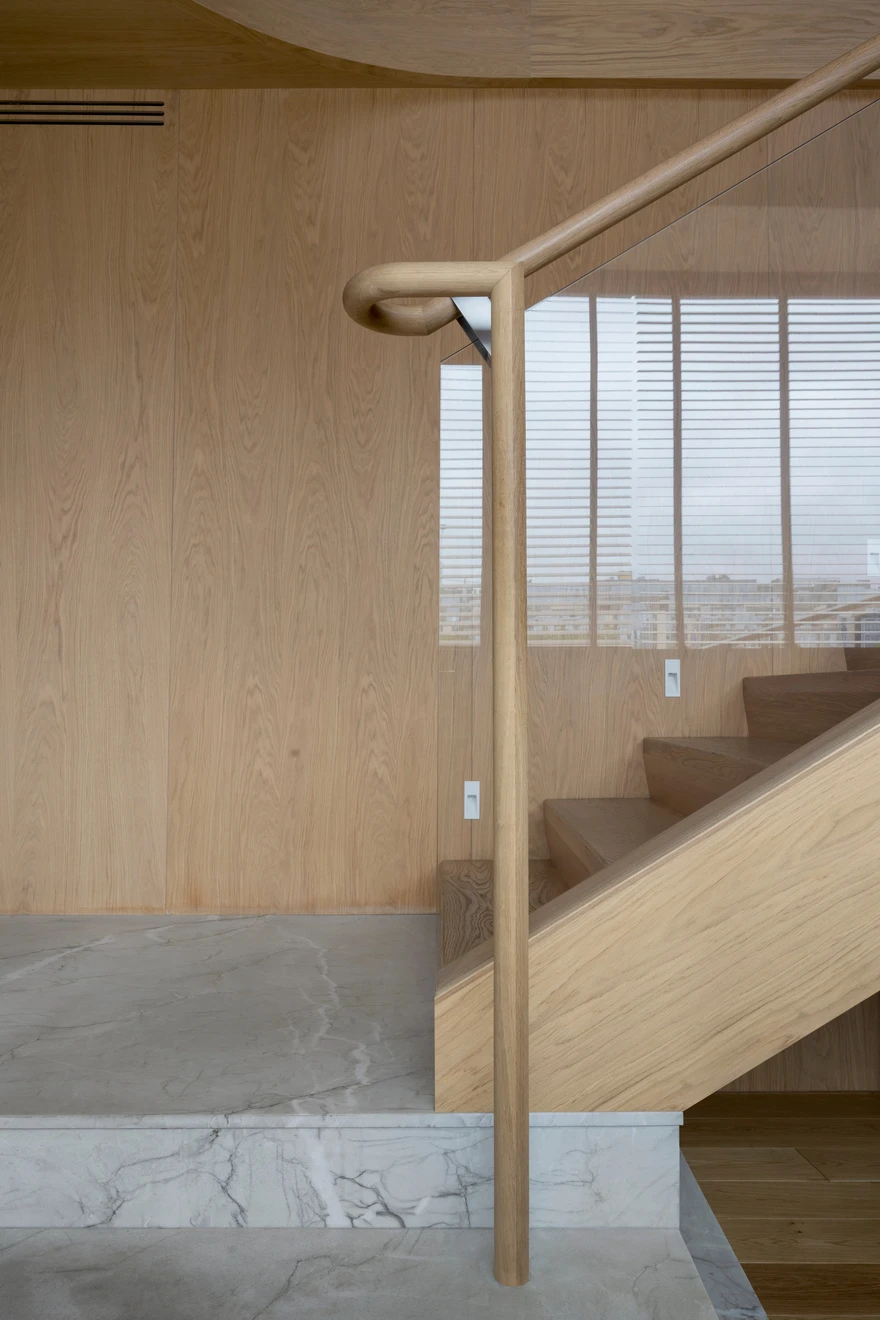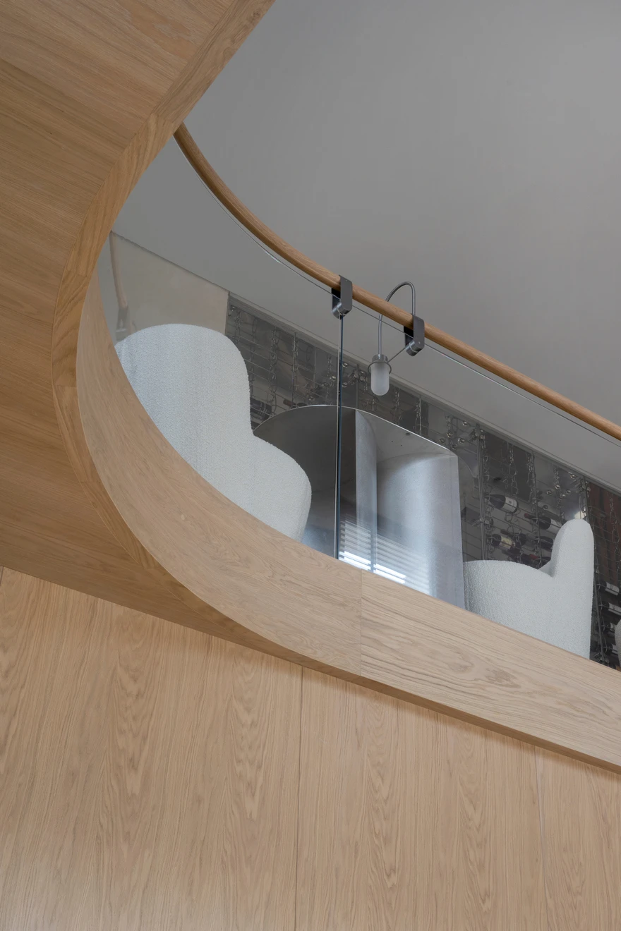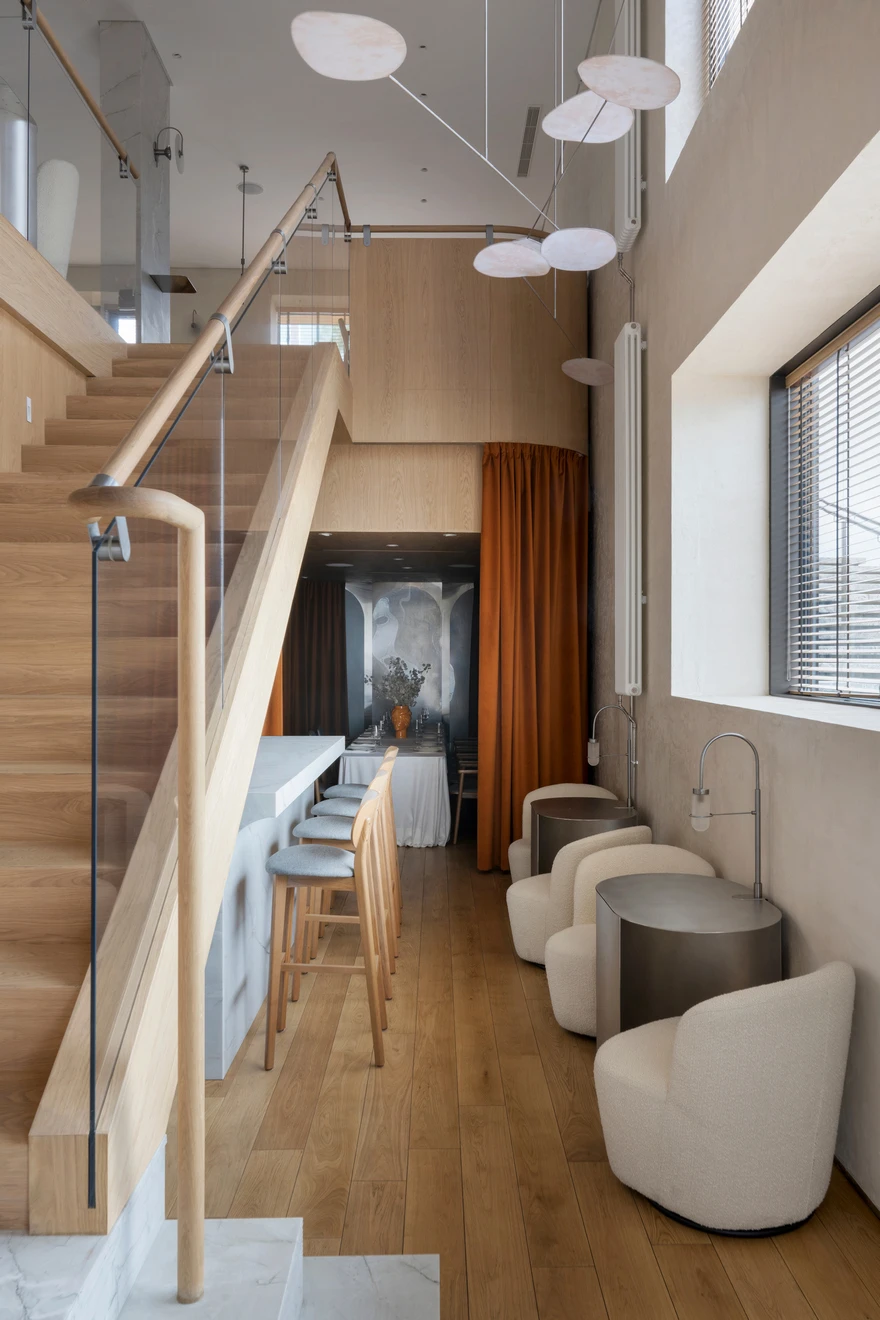 В отделке лестницы использовались бразильский кварцит с фрезеровкой и массив дуба. Именно дерево стало одним из основных материалов в проекте. «Теплый дуб в отделке пола и стеновых панелей, плотные терракотовые драпировки отсылают к образам знойного климата, глины и земли. В то время как прохладный жемчужный камень, нержавеющая сталь и подвесные декоративные мобильные композиции, вдохновленные перламутровыми плодами растения лунник, символизируют женское начало, луну и утонченную поэтику света. Так в интерьере рождается диалог противоположностей — солнечного и лунного, земного и воздушного, рационального и чувственного, — создающий эмоциональную атмосферу, в которой Средиземноморье звучит не буквально, а на уровне ощущений».