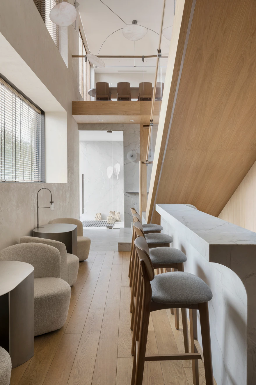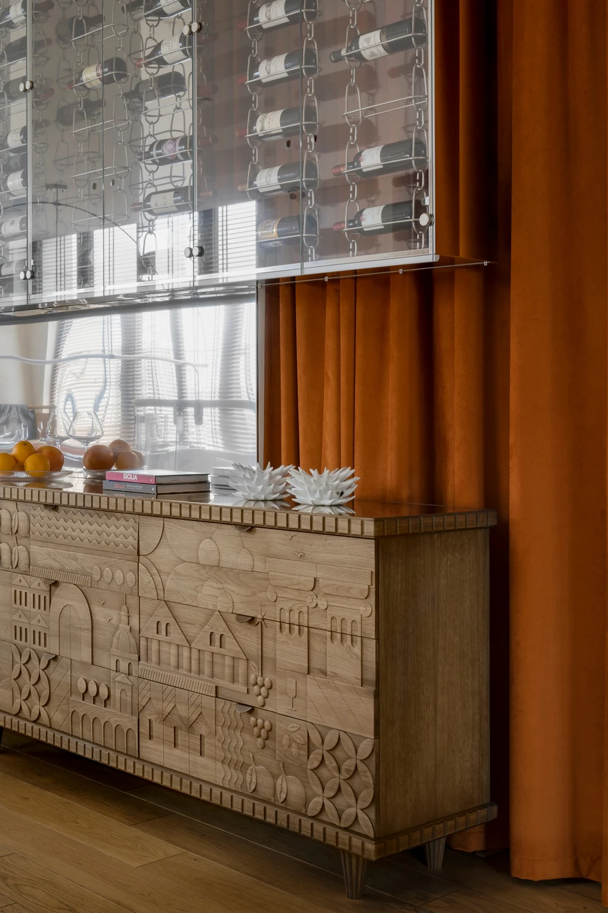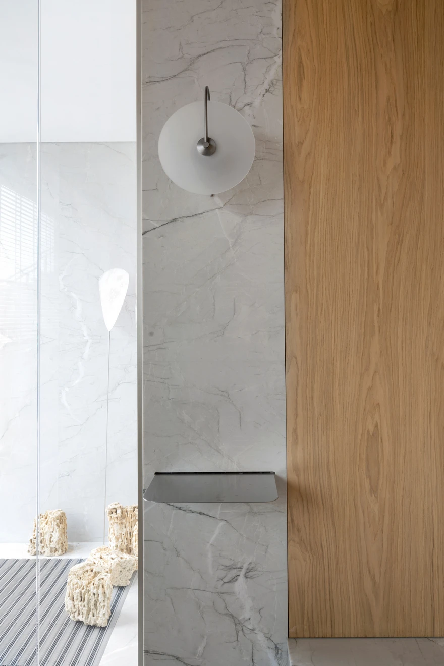 В отделке лестницы использовались бразильский кварцит с фрезеровкой и массив дуба. Именно дерево стало одним из основных материалов в проекте. «Теплый дуб в отделке пола и стеновых панелей, плотные терракотовые драпировки отсылают к образам знойного климата, глины и земли. В то время как прохладный жемчужный камень, нержавеющая сталь и подвесные декоративные мобильные композиции, вдохновленные перламутровыми плодами растения лунник, символизируют женское начало, луну и утонченную поэтику света. Так в интерьере рождается диалог противоположностей — солнечного и лунного, земного и воздушного, рационального и чувственного, — создающий эмоциональную атмосферу, в которой Средиземноморье звучит не буквально, а на уровне ощущений».