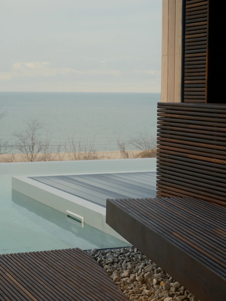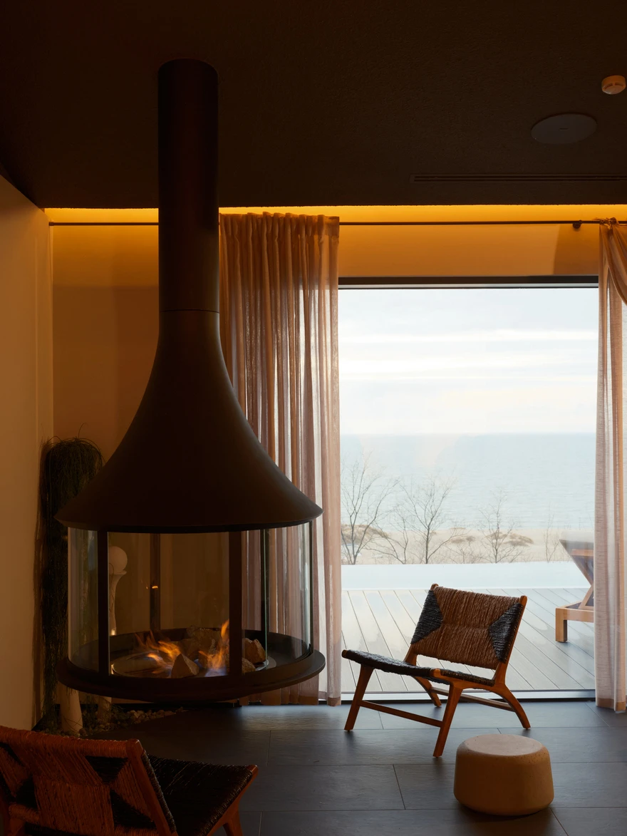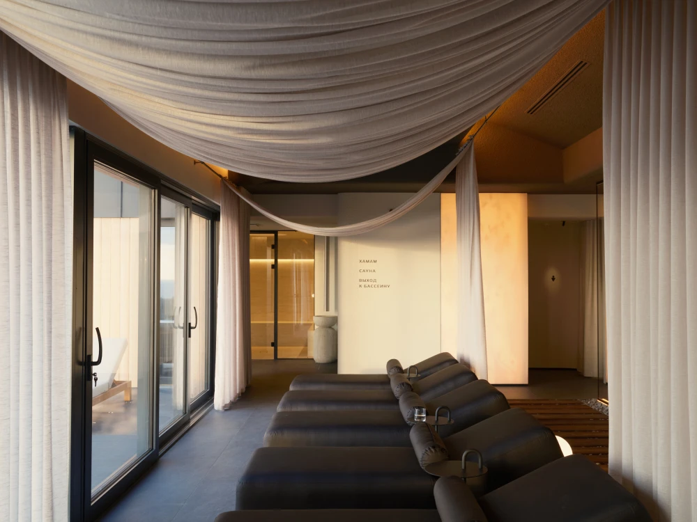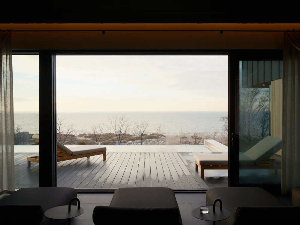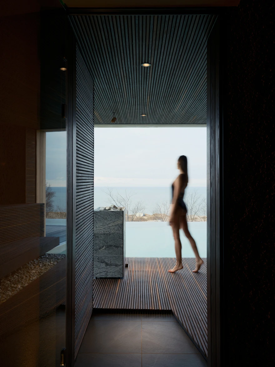 Спа-комплекс полностью ориентирован на побережье Балтийского моря, поэтому основой концепции стали видовые зоны с панорамными окнами от пола до потолка. Особенно впечатляющие виды открываются из окон двух парных и открытого инфинити-бассейна, который подогревают до 33-35 градусов в холодное время года. Спа-зона также включает хаммам, чашу с постоянной подачей снега, открытые душевые и блок санузлов. А центральную линию общего пространства занимает зона отдыха с шезлонгами, плавно переходящая в зону открытой кухни.