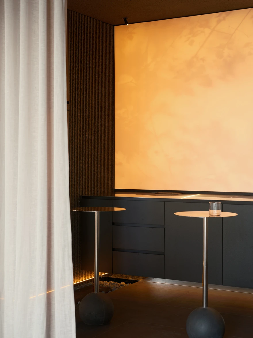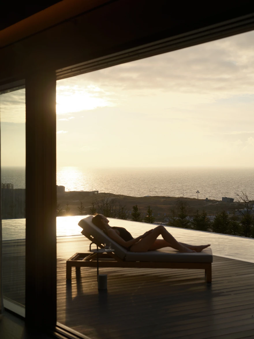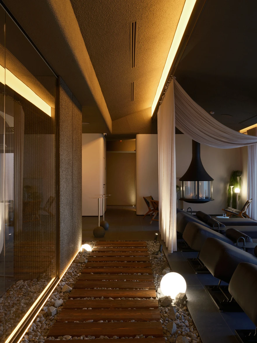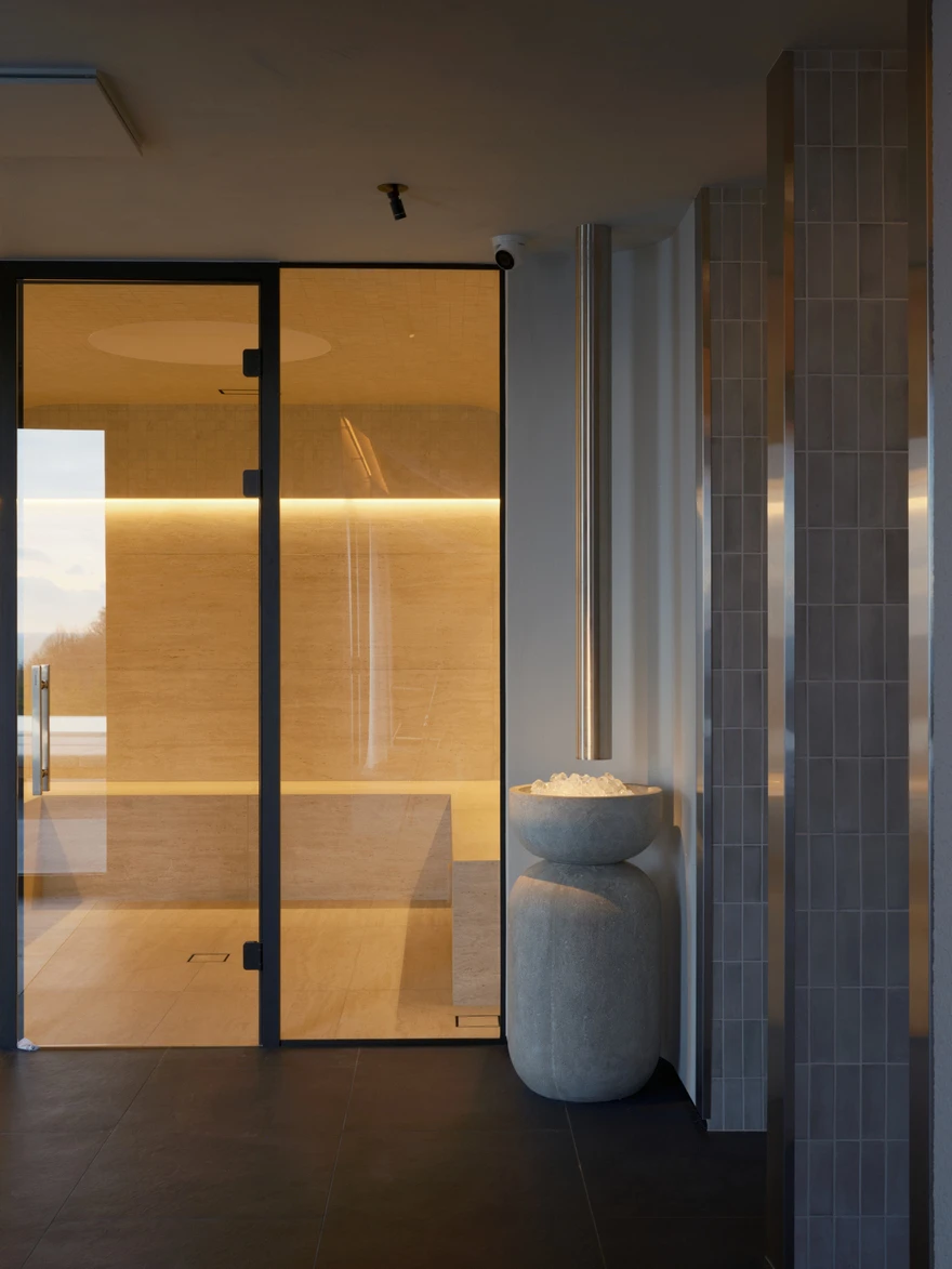 Спа-комплекс полностью ориентирован на побережье Балтийского моря, поэтому основой концепции стали видовые зоны с панорамными окнами от пола до потолка. Особенно впечатляющие виды открываются из окон двух парных и открытого инфинити-бассейна, который подогревают до 33-35 градусов в холодное время года. Спа-зона также включает хаммам, чашу с постоянной подачей снега, открытые душевые и блок санузлов. А центральную линию общего пространства занимает зона отдыха с шезлонгами, плавно переходящая в зону открытой кухни.