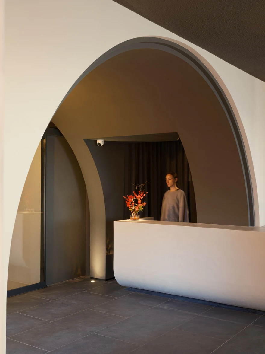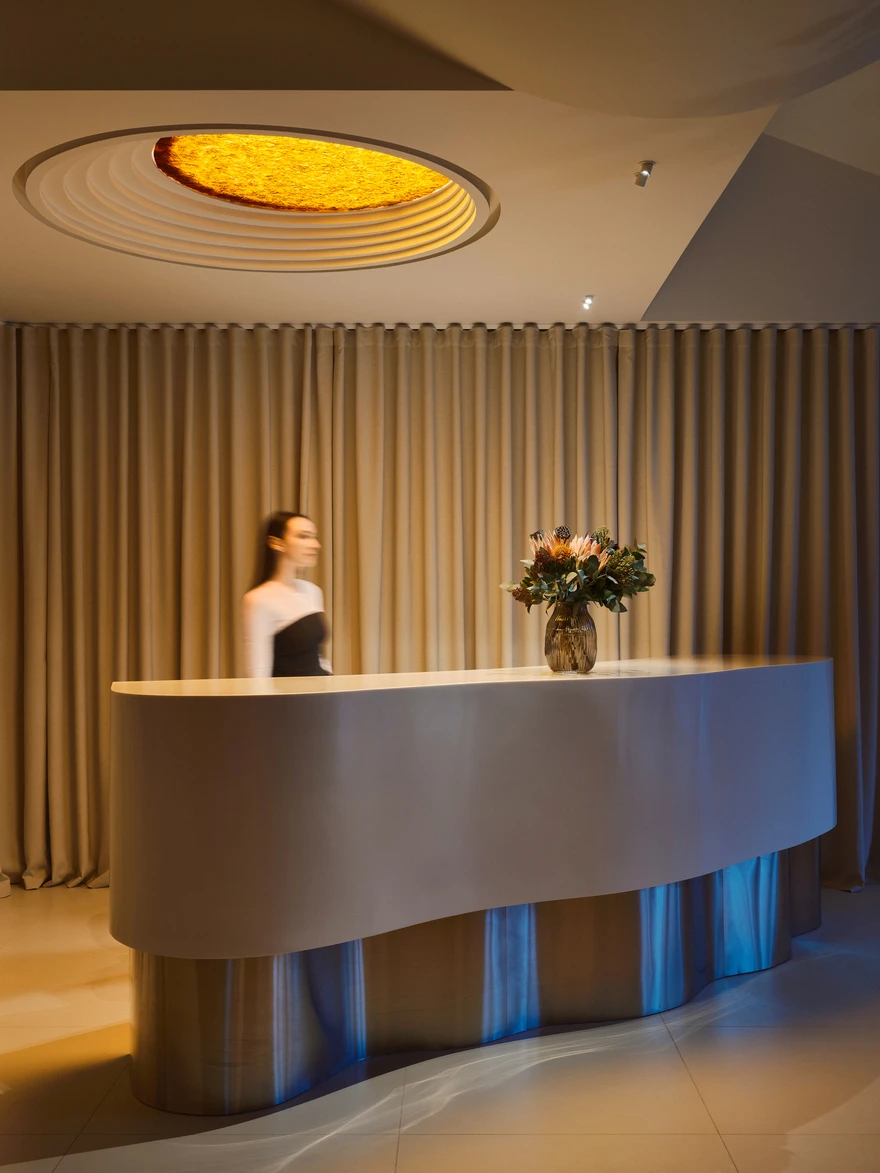 «В процессе работы над нашими проектами мы часто черпаем вдохновение в окружающей нас действительности, и этот проект не стал исключением! — говорят архитекторы. — Именно от этого в концепции всего комплекса появляется обилие мягких форм и плавных линий. Например, формы стоек администратора, диванов, сложных конструкций кроватей и один из важнейших элементов — волнообразный потолок, который своей формой провожает гостя к номерам и соединяет зону отеля и спа-комплекса».