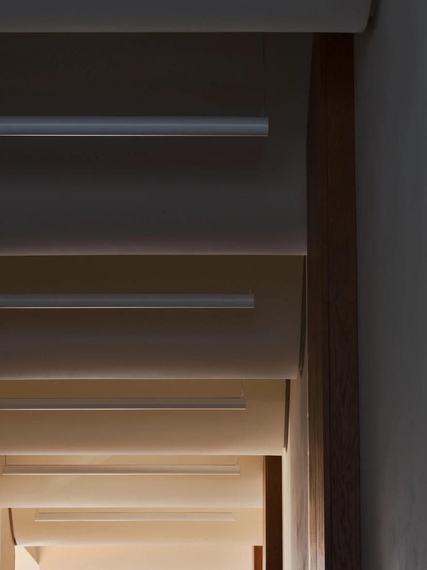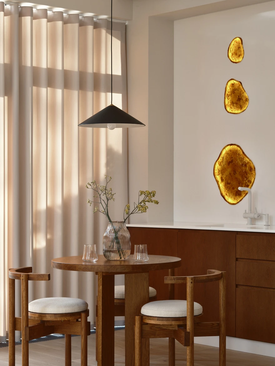 Большой кусок янтаря, излучающий теплый свет, напоминают и светильники, украшающие зону кухни в каждом номере отеля. Все они изготовлены по технологии фьюзинг из переработанных винных бутылок на местной мануфактуре. Еще один необычный элемент пространства, созданный по чертежам архитекторов, можно увидеть на ресепшене. Сложный геометричный объем, врезанный в потолок и скрывающий за собой светящееся полотно, покрыт 50-килограммовым куском стекла, которое напоминает и янтарь, и сахарную корочку десерта крем-брюле.