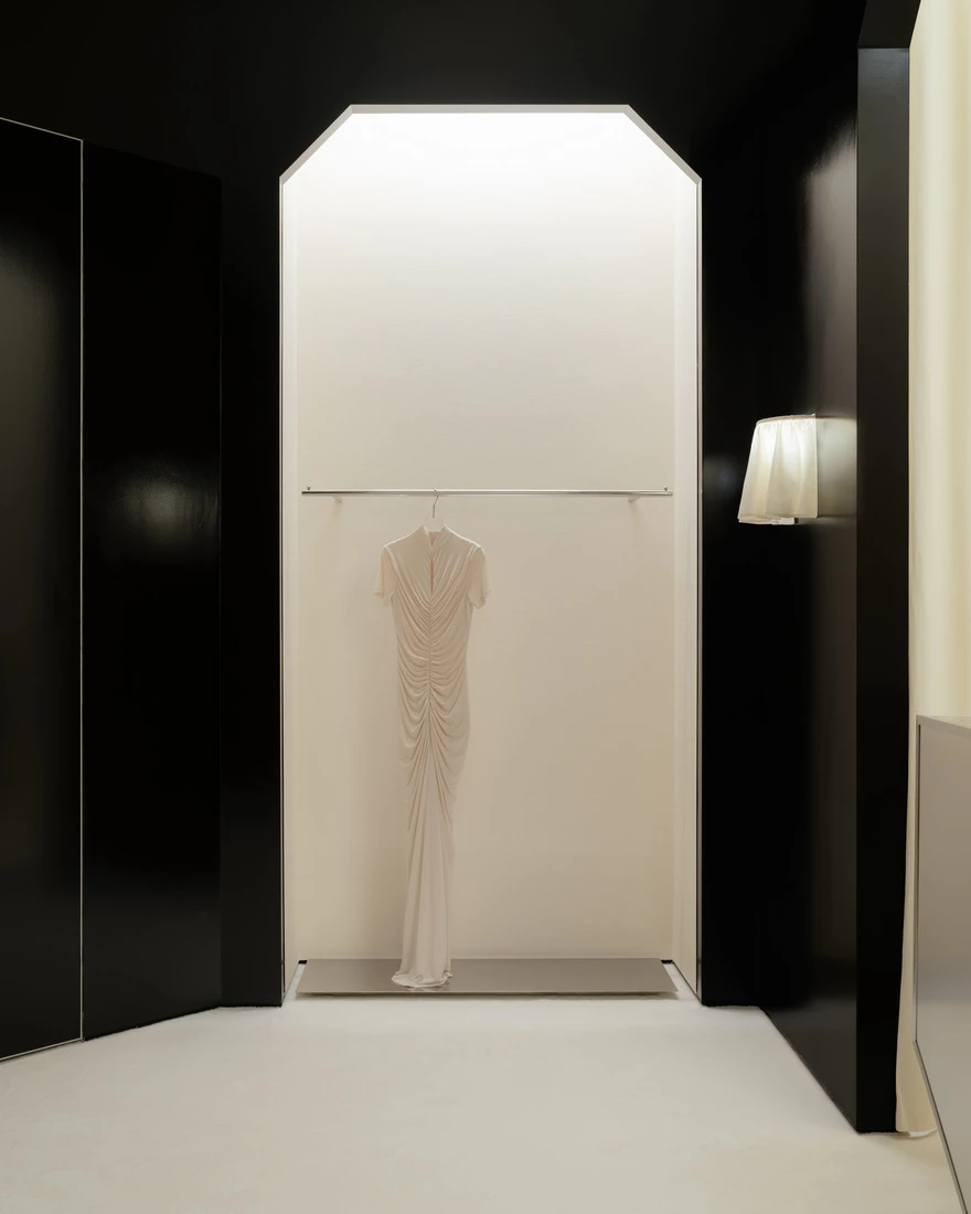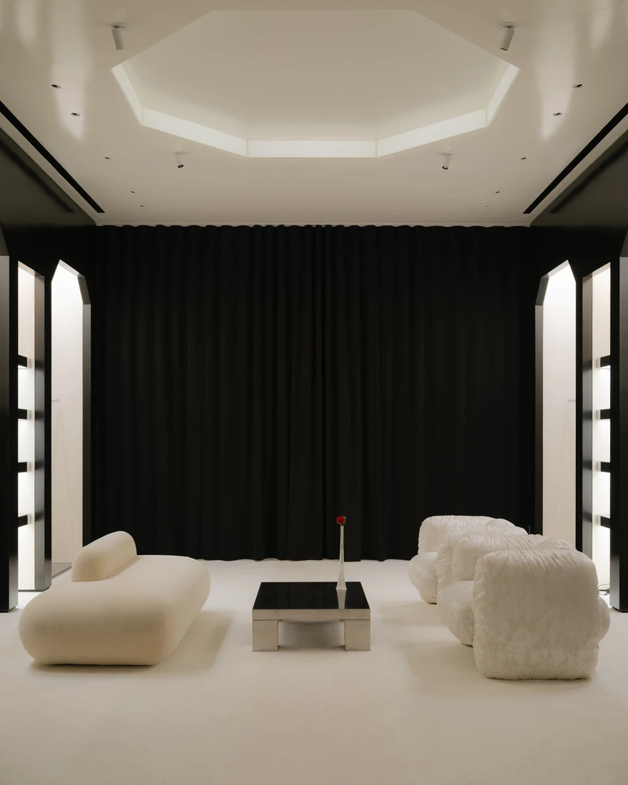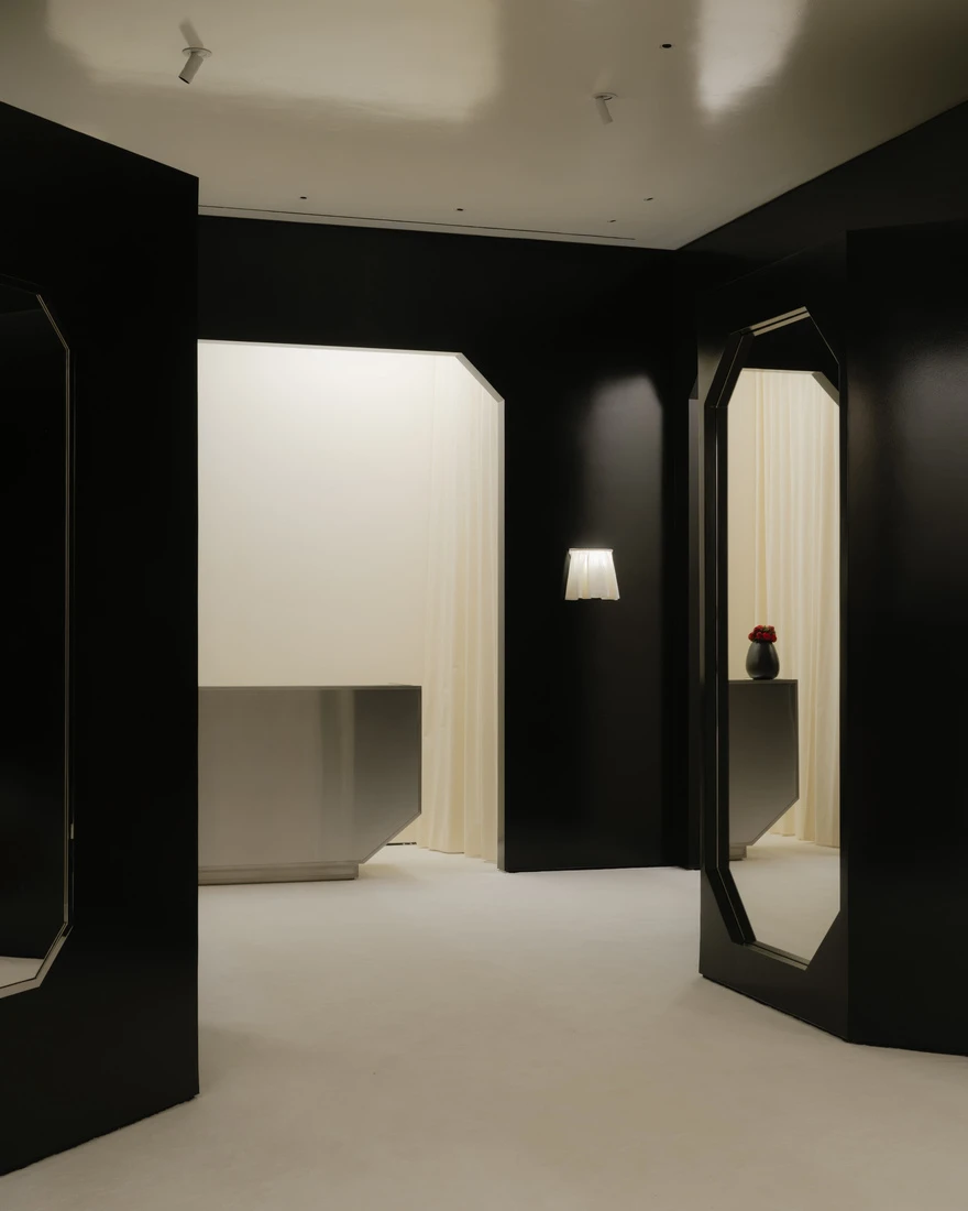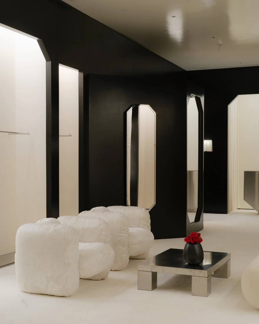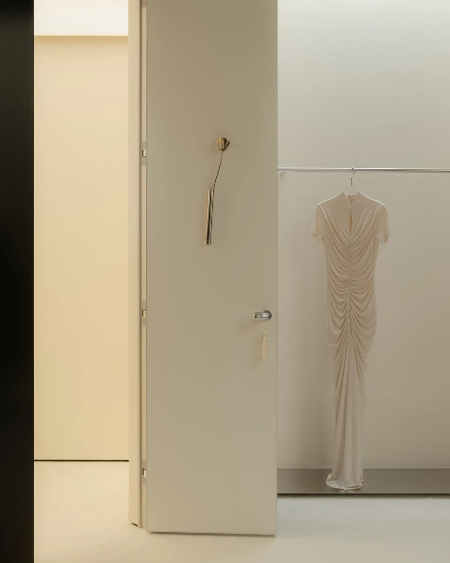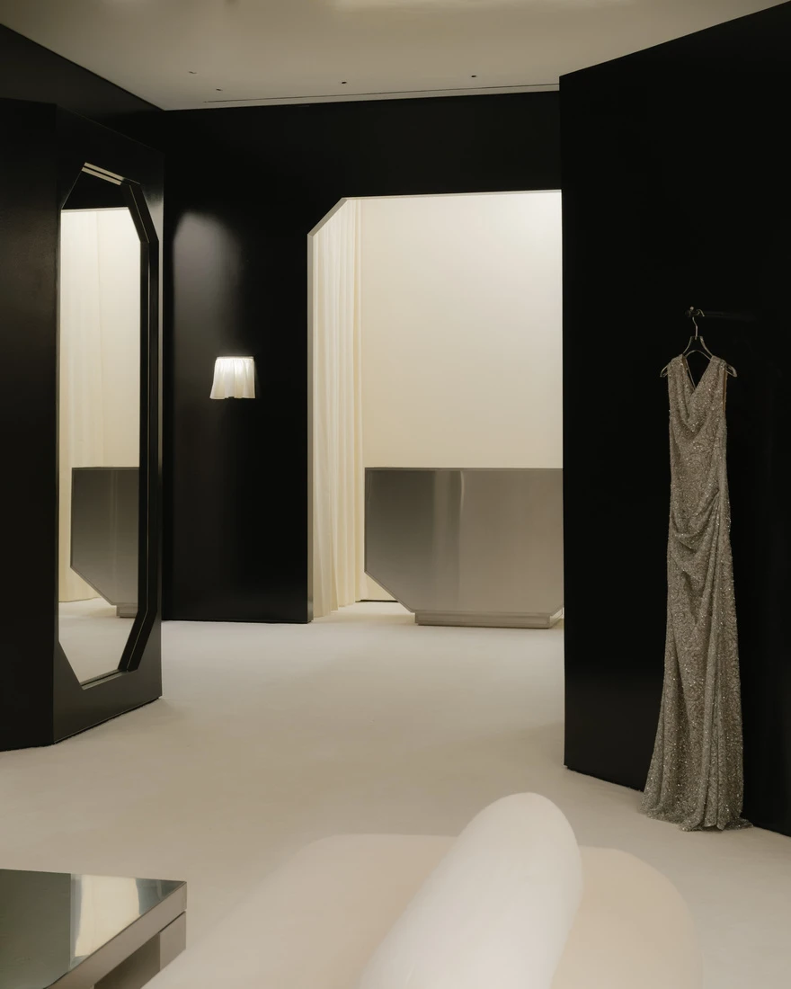 Особое внимание уделено комфорту посетителей. В центре пространства организована мягкая зона отдыха, а примерочные расположены в отдаленной приватной части бутика. В каждой из них установлена система ручной настройки освещения: гости могут отрегулировать яркость и температуру света, чтобы понять, как наряд будет смотреться в реалистичных условиях — в разное время суток и с разным освещением.