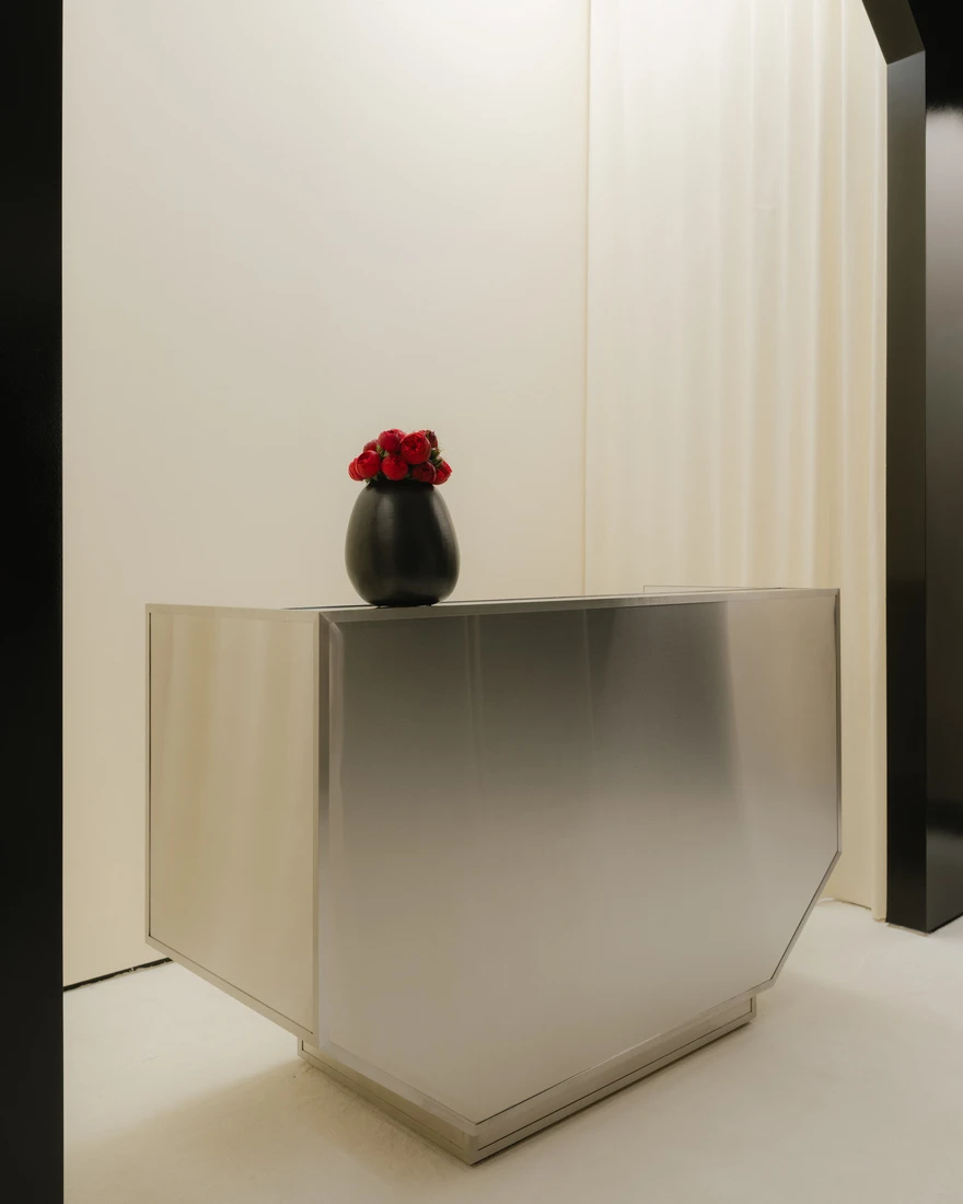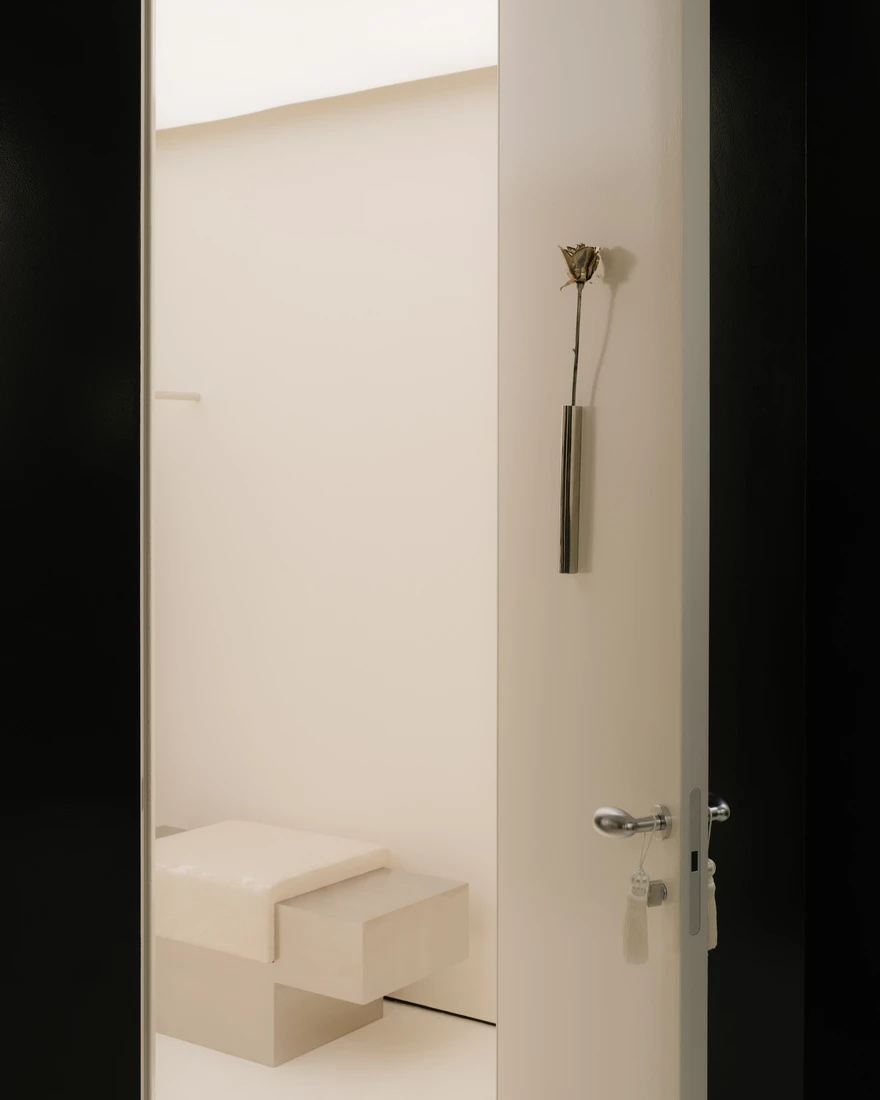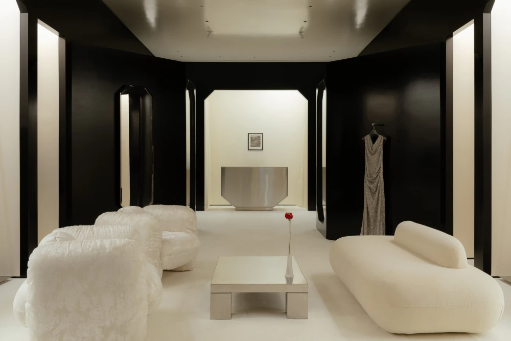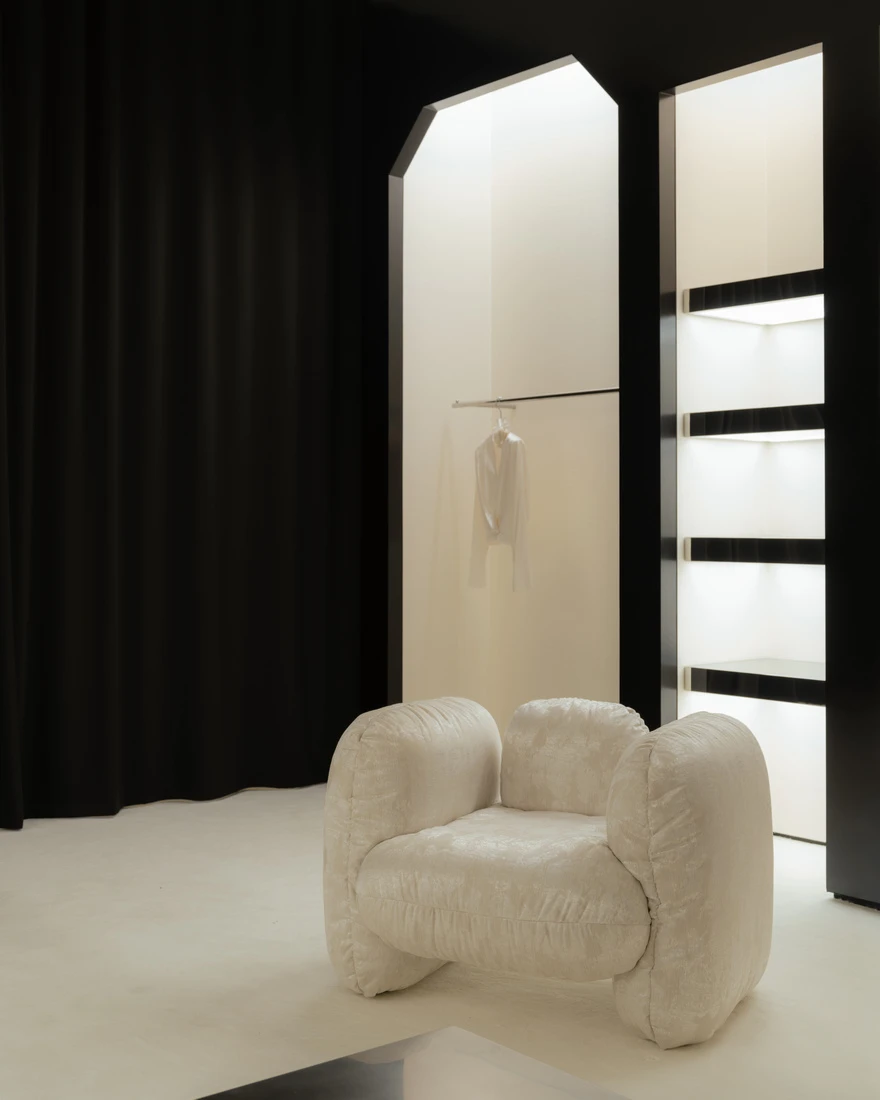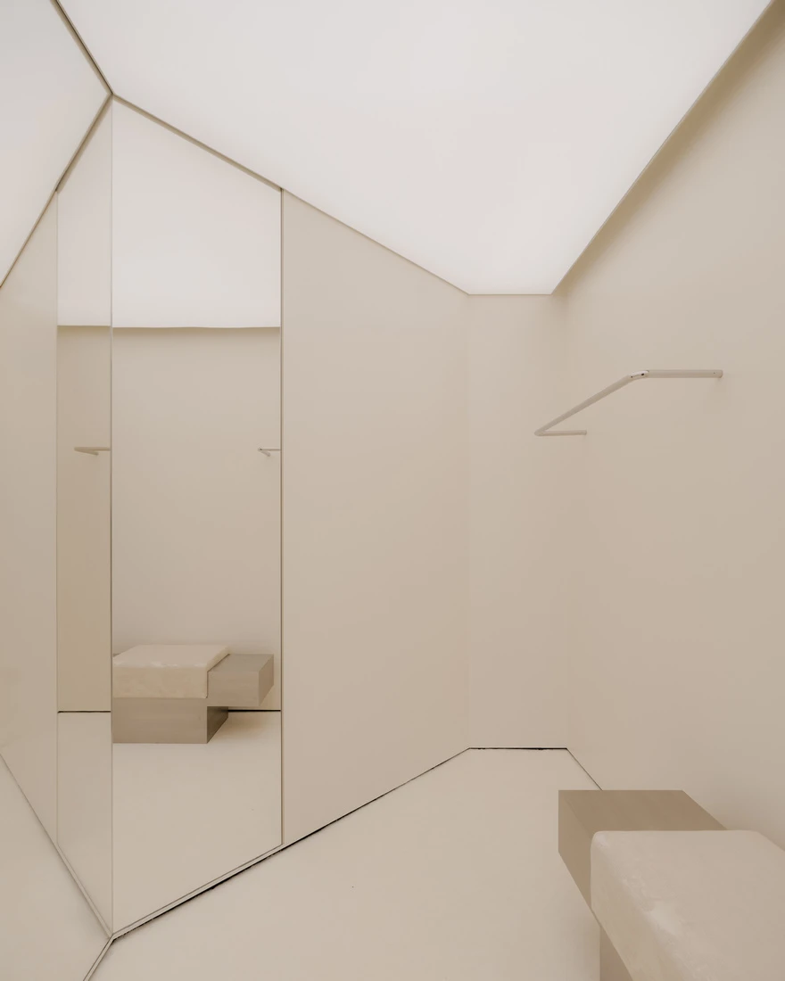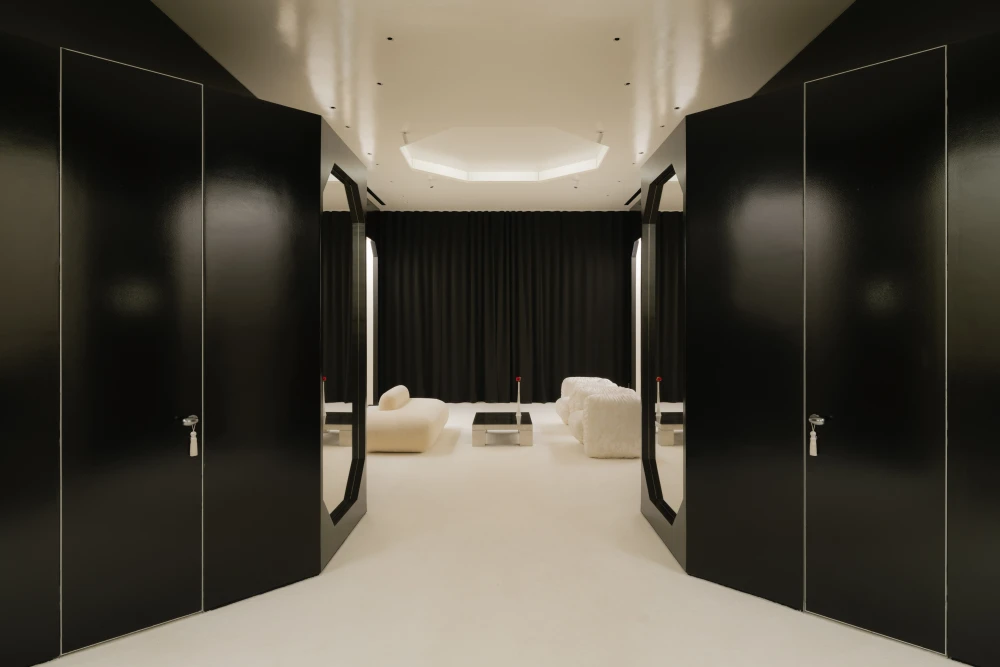 Особое внимание уделено комфорту посетителей. В центре пространства организована мягкая зона отдыха, а примерочные расположены в отдаленной приватной части бутика. В каждой из них установлена система ручной настройки освещения: гости могут отрегулировать яркость и температуру света, чтобы понять, как наряд будет смотреться в реалистичных условиях — в разное время суток и с разным освещением.