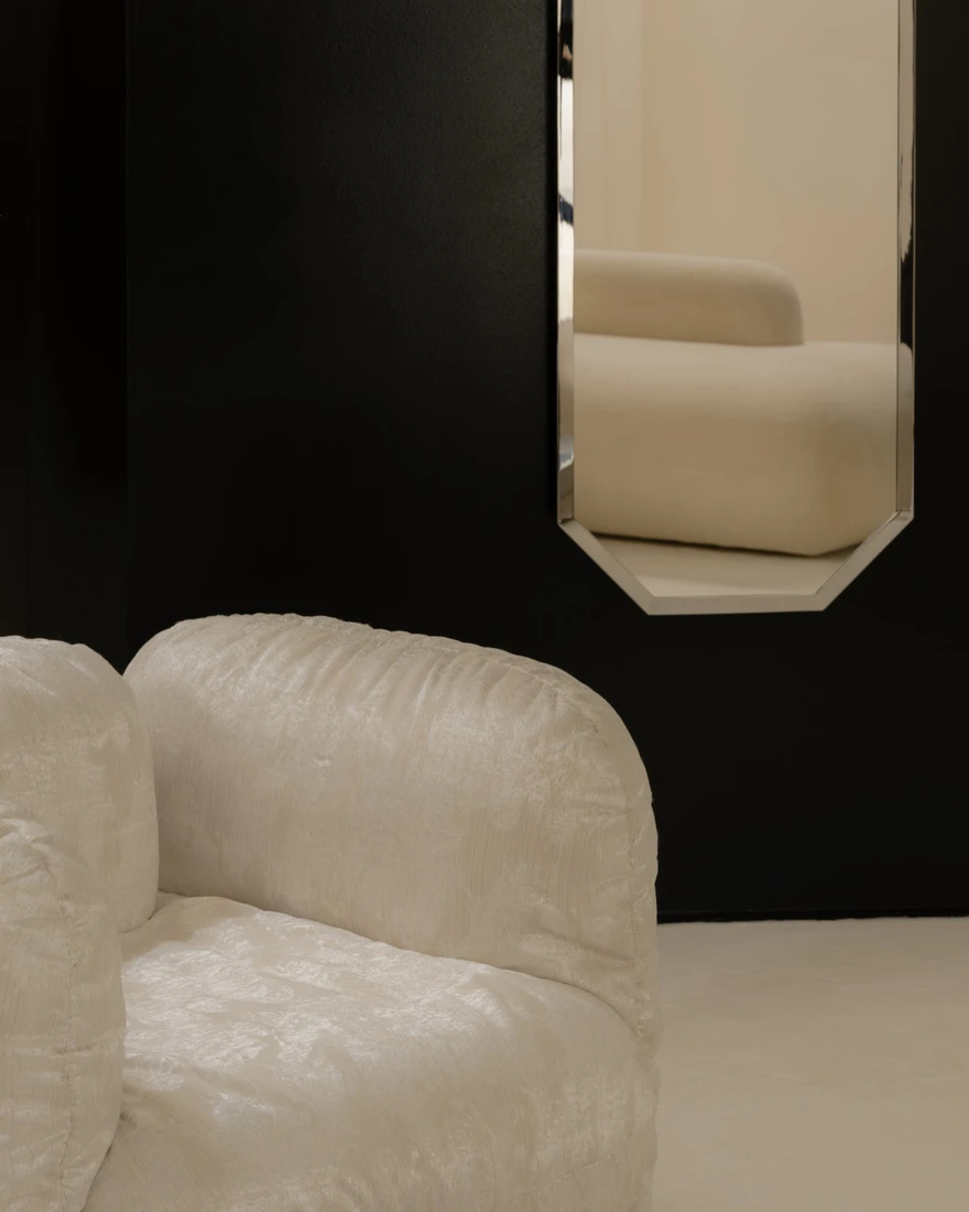 Все элементы интерьера — кассовая стойка, рейлы, бра, стол, пуфы в примерочной — были разработаны специально для этого проекта по эскизам дизайнеров. Диванная группа из коллекции EdxxKat впервые была представлена в цветочном принте и отделке из меха.