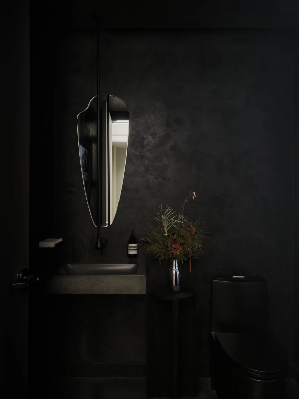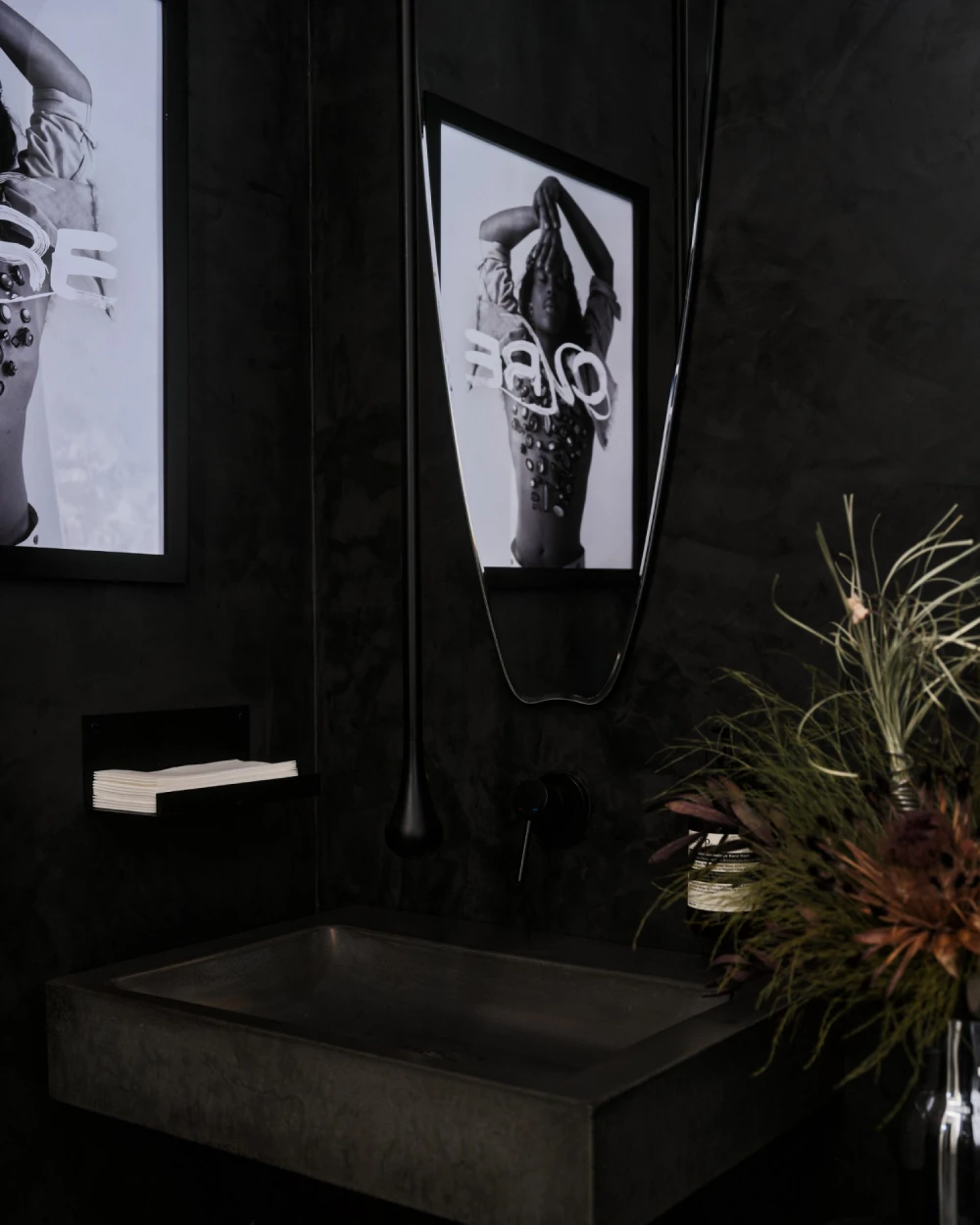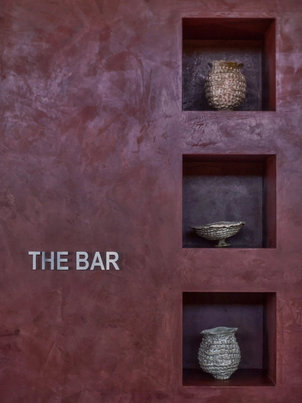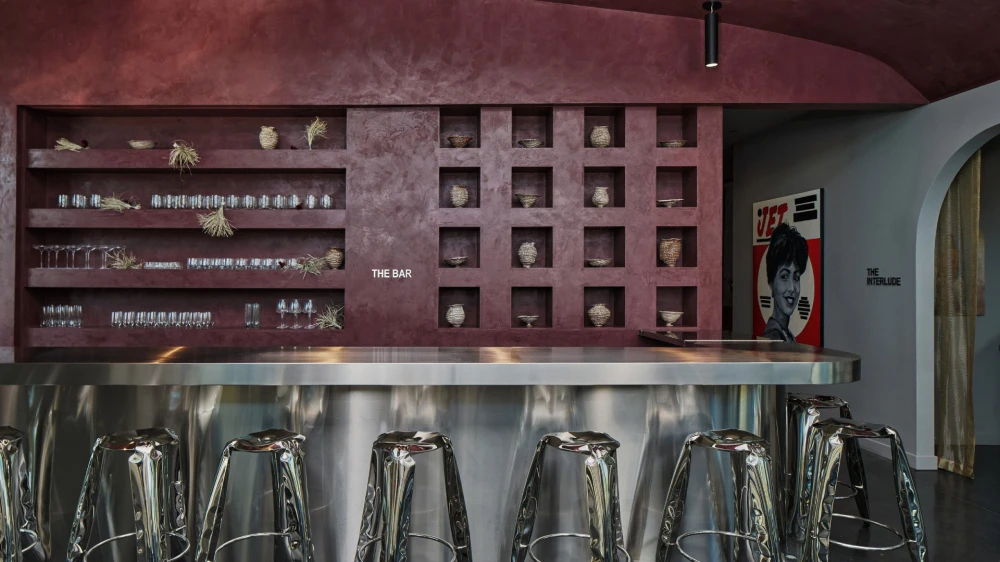 Для оформления пространства, где «сочетаются функциональность и артистизм», Робинсон пригласила дизайнера Тиффани Томпсон из Duett Interiors. По словам авторов проекта, концепция интерьера основана на комбинации минималистичной стилистики, присущей современным галереям, и богатства фактур. Дуальность подчеркивает и цветовой контраст насыщенного оттенка бургунди и прохладных светло-серых тонов. Глянцевый пол и барная стойка отражают металлические табуреты Zieta Studio с «дутым» силуэтом — за счет этого пространству придается дополнительный объем.