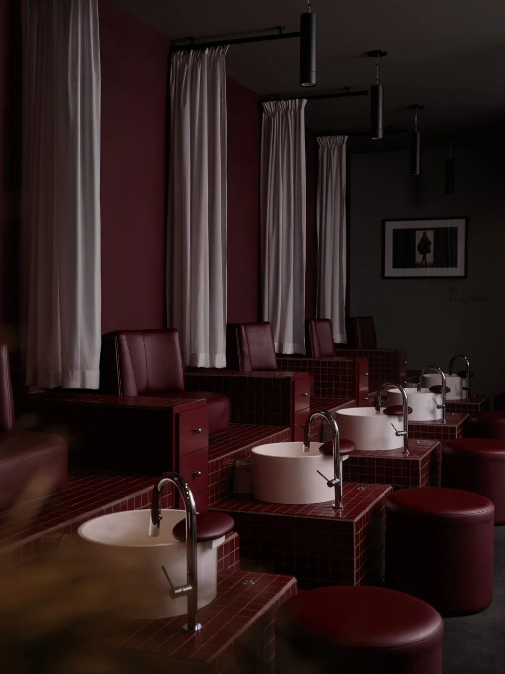 В зоне ожидания разместили полки с журналами и книгами по дизайну и искусству. Арочная ниша, где расположены умывальники, дополнена светильником с противовесом от Ladies & Gentlemen Studio — он выглядит словно динамический арт-объект внутри галерейного пространства. Функции галереи Cure Nailhouse тоже выполняет: в салоне представлены работы начинающих и признанных художников, посвященные красоте. Здесь каждый квартал проходят арт-салоны, публичные мастер-классы и небольшие выставки, которые объединяют представителей индустрии красоты, моды и современного искусства. Команда проекта подчеркивает, что эти инициативы созданы для поддержки культурной преемственности, радикального самовыражения и творческого эксперимента.