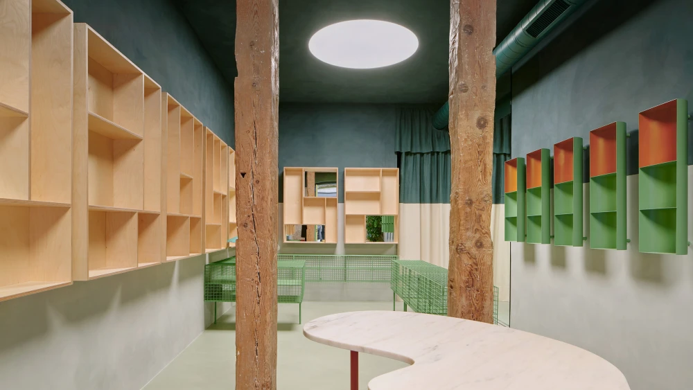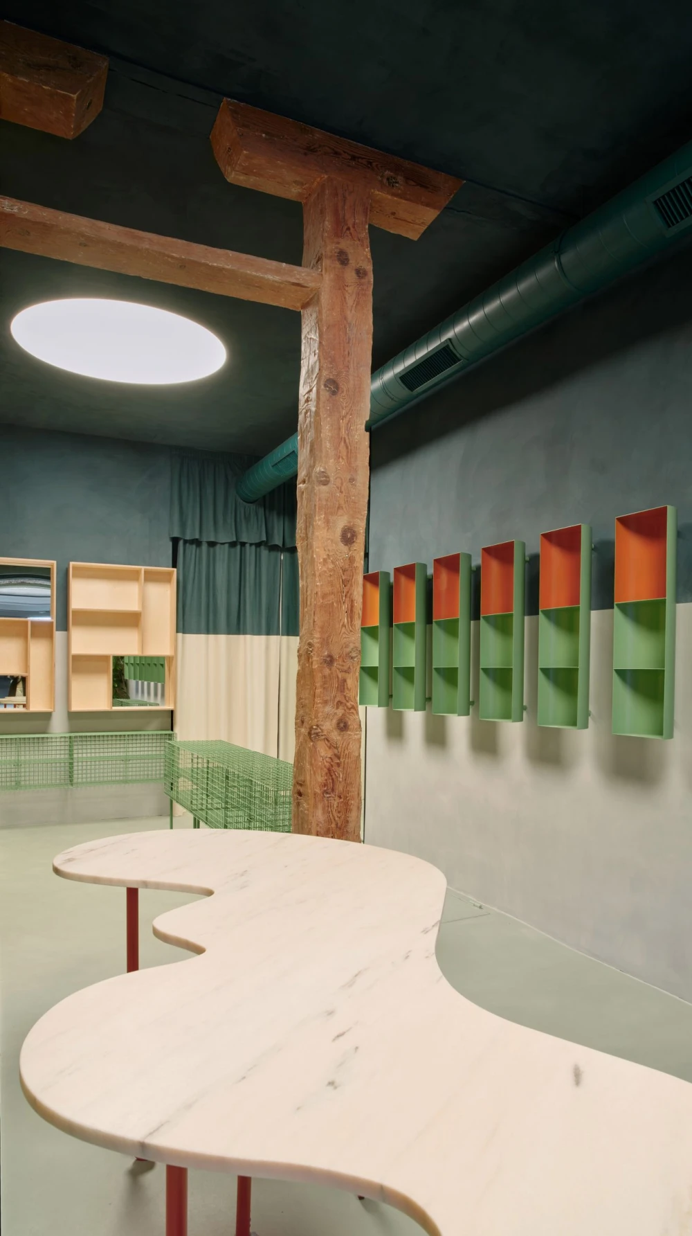 Изначально на месте бутика находился шоурум напольных покрытий. Под старой отделкой команда обнаружила деревянные колонны, которые решили оставить открытыми. «Колонны помогают структурировать вытянутое пространство, выполняя функцию большой двери, и создают интересный диалог фактур с другими элементами», — добавляют в студии. При выборе отделки дизайнеры сделали ставку на игру противоположностей. Стены покрыты фактурной лаврово-зеленой известковой краской, которая контрастирует с гладкой поверхностью микроцементного пола.
