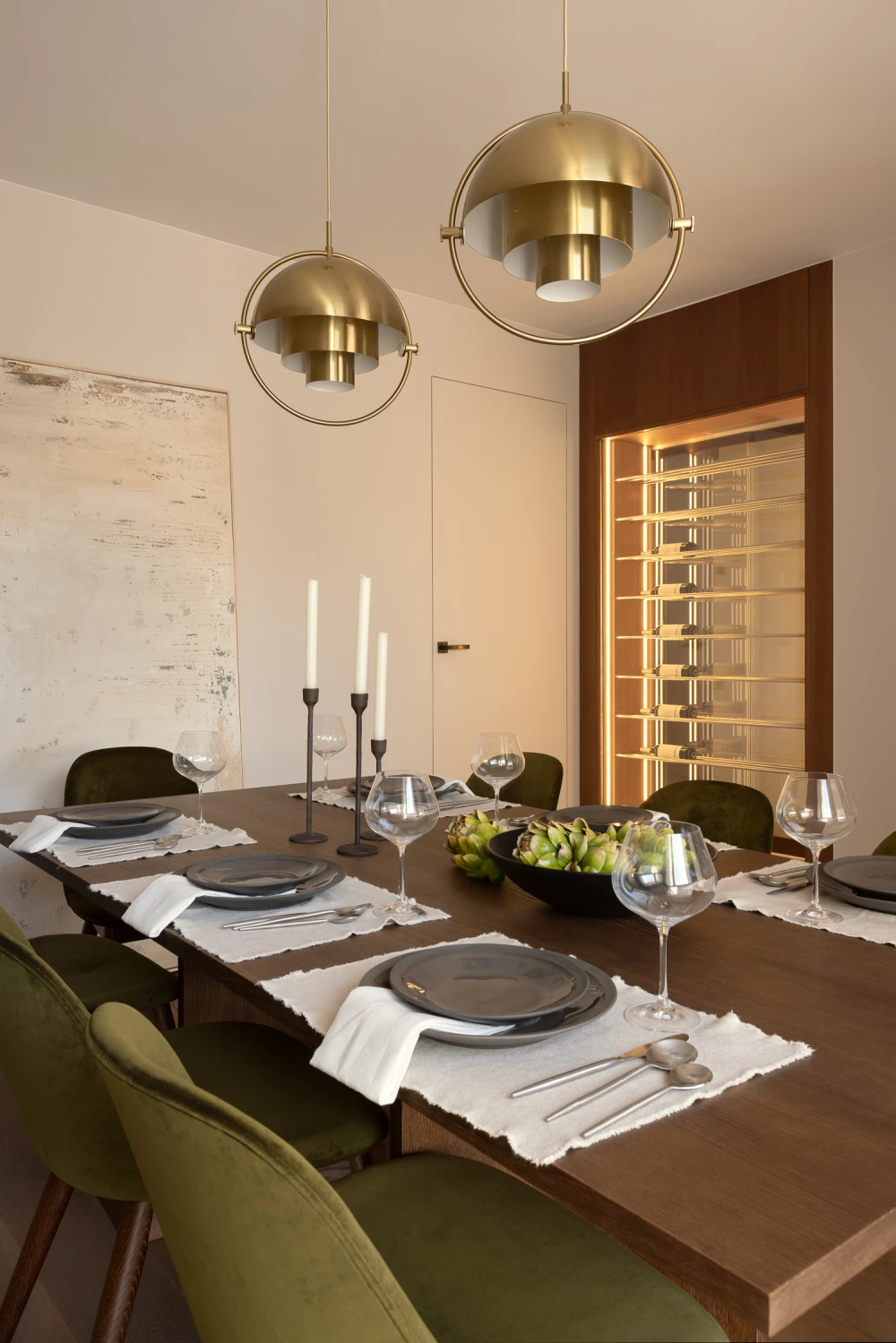 Поддержали концепцию предметы скандинавского дизайна. В гостиной появились зеленые шерстяные кресла от & Tradition, ставшие мостиком между японской и северной эстетикой, в спальне — кожаное кресло Hay, создающее интересную игру фактур, в сочетании со стальными столиками от Audo Copenhagen. «Главным героем технологической части стал винный шкаф, который был изготовлен по нашим эскизам. Разместившийся между кухней и столовой, он помог объединить две зоны. Доступ к шкафу организован со стороны кухни, а со стороны столовой он выглядит как галерея винных бутылок, которая вечером загорается теплым светом».