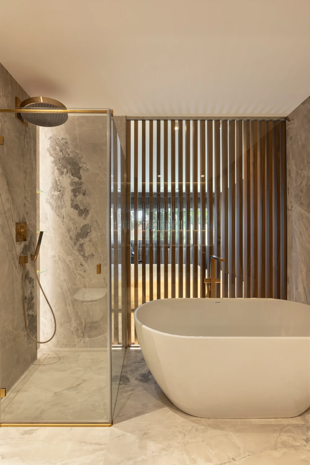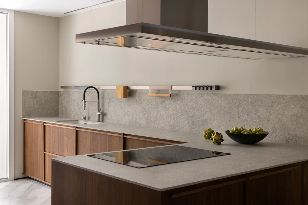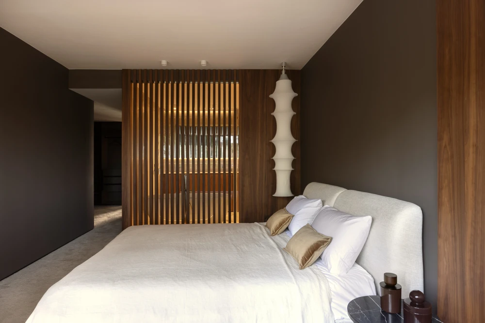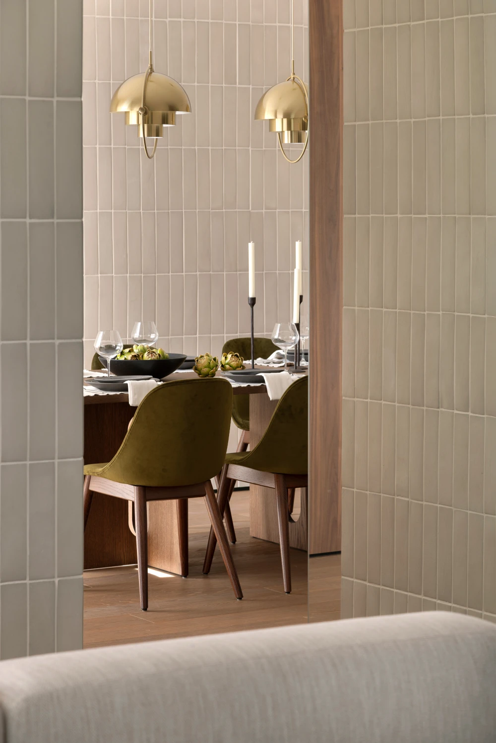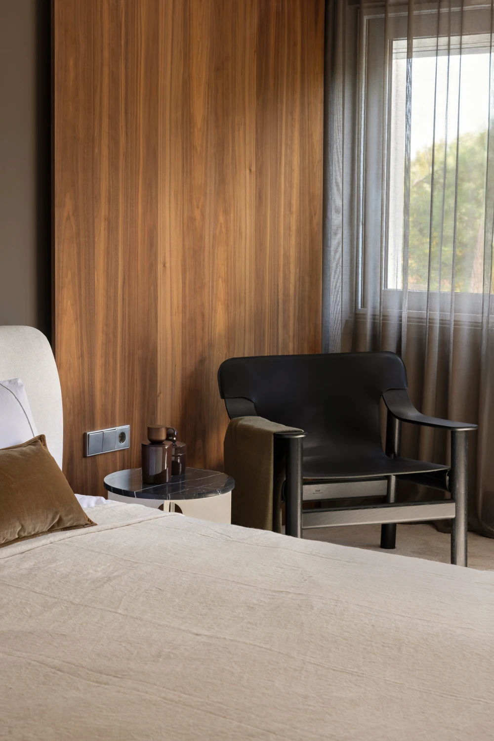 Цветовую гамму выбрали спокойную, сделав акцент на текстуры. В основе палитры — бетон и американский орех, которые окружают сложные оттенки зеленого, серого, шоколадного, создающие ощущение глубины и спокойствия. «Одним из самых смелых решений стала цементная плитка ручной работы в столовой и вокруг камина. Сначала заказчики относились к идее настороженно, казалось, что материал будет холодным. Но в сочетании с бархатными стульями, панелями из американского ореха и видом на сосны он проявил свой характер — спокойный, земной, естественный. Дерево мы, кстати, выбирали лично на фабрике под Барселоной, где много лет изготавливают шахматные доски для Международной шахматной федерации, включая те, что были в сериале «Ход королевы».