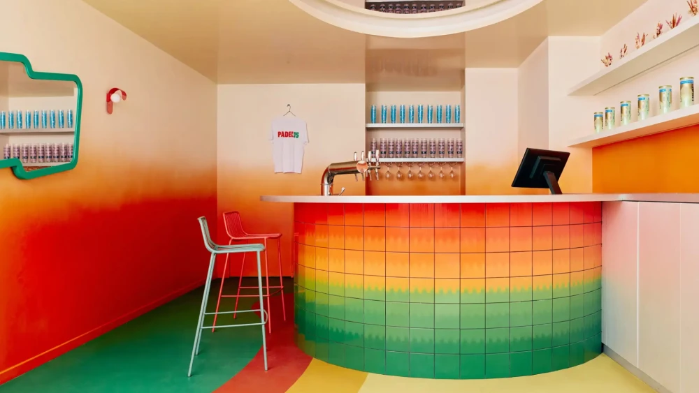 Тема движения продолжается в напольной графике. Пол покрывает сложная «картография» из зеленых, желтых и оранжевых оттенков, выстроенная по нелинейному рисунку. Этот узор напрямую отсылает к траектории полета мяча в паделе, незаметно направляя взгляд и перемещение посетителей по пространству. Интерьер работает не только визуально, но и функционально — как продолжение самой игры. Композиционным ядром проекта стала округлая барная стойка с фасадом из плитки: он также оформлен вертикальным градиентом от глубокого зеленого к яркому оранжевому. Этот элемент студия называет «хроматической скульптурой», функционирующей одновременно как сервисная зона и как визуальный якорь.