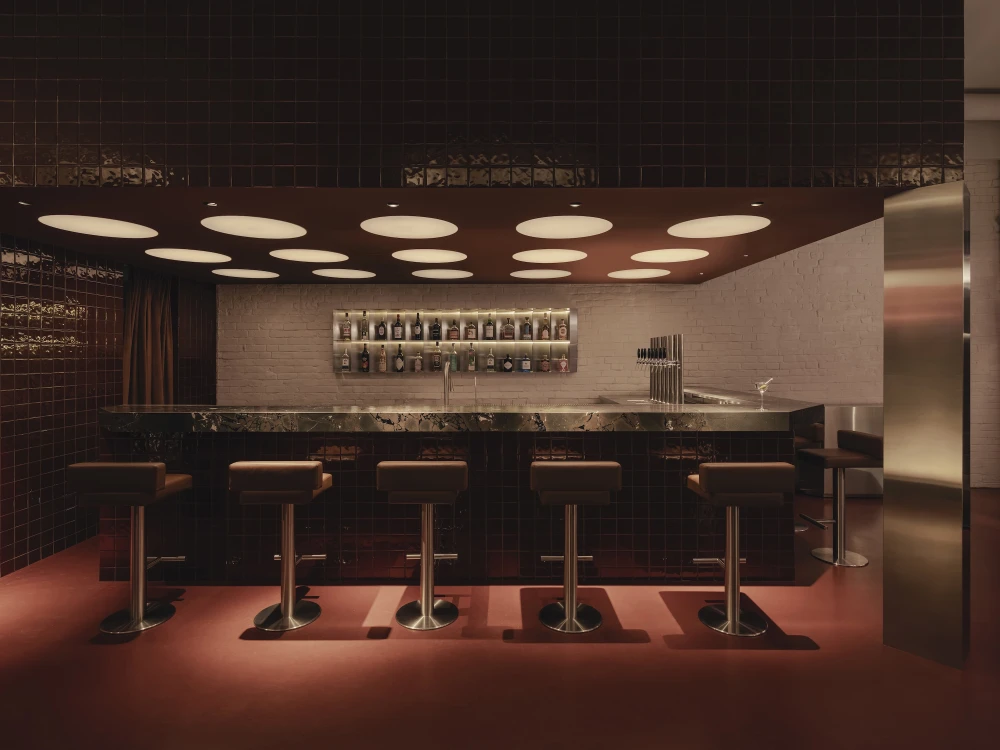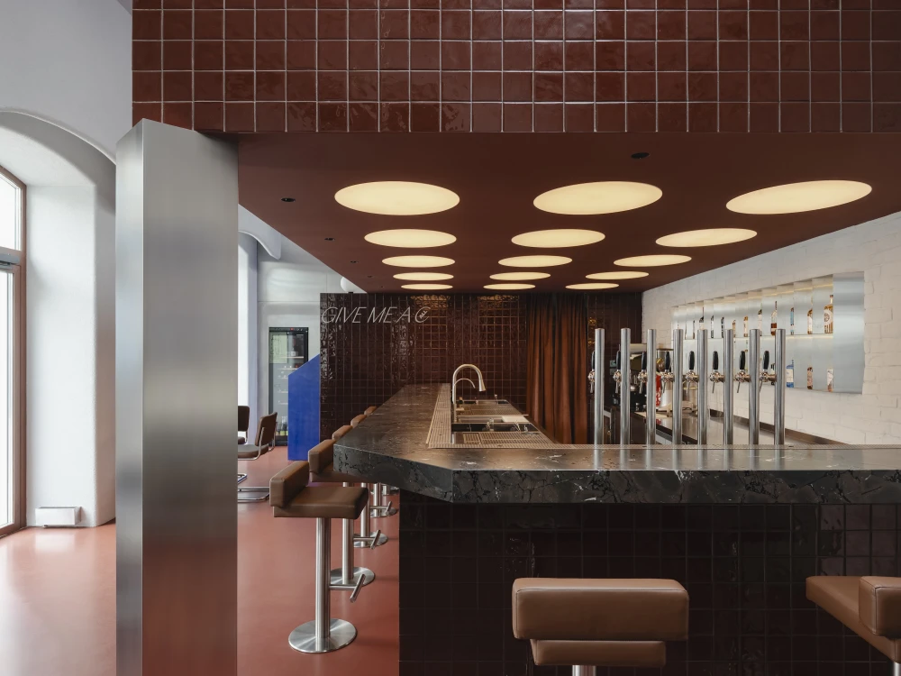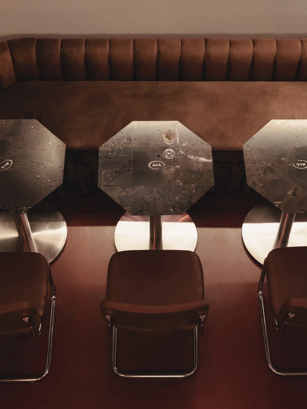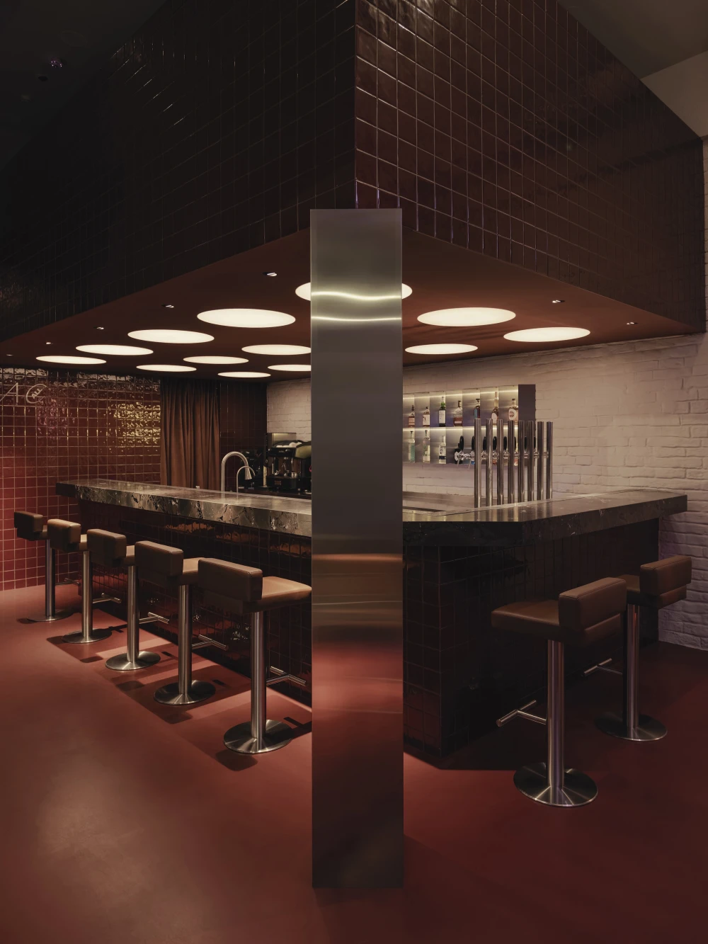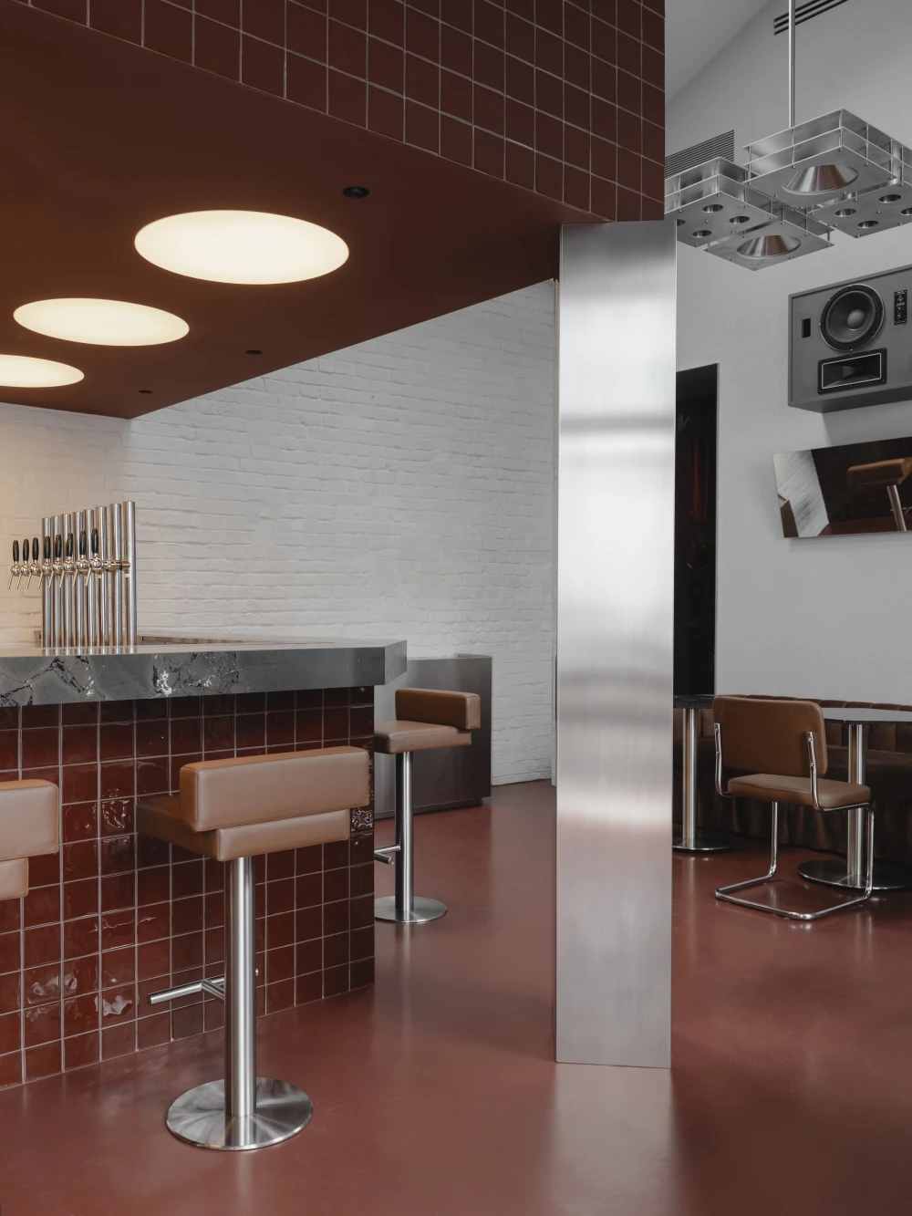 Концепция строится на сочетании классической клубной эстетики и современного дизайна. Первый этаж выполнен в духе традиционных бистро, к которым отсылают глубокие темные тона, обилие дерева, кожаная обивка стульев, диваны с юбочками и каменные поверхности столов. Второй уровень оформлен как лаундж-зона: здесь стоят вельветовые диваны и стулья с подлокотниками, а нуарная атмосфера поддерживается акцентным освещением столов.