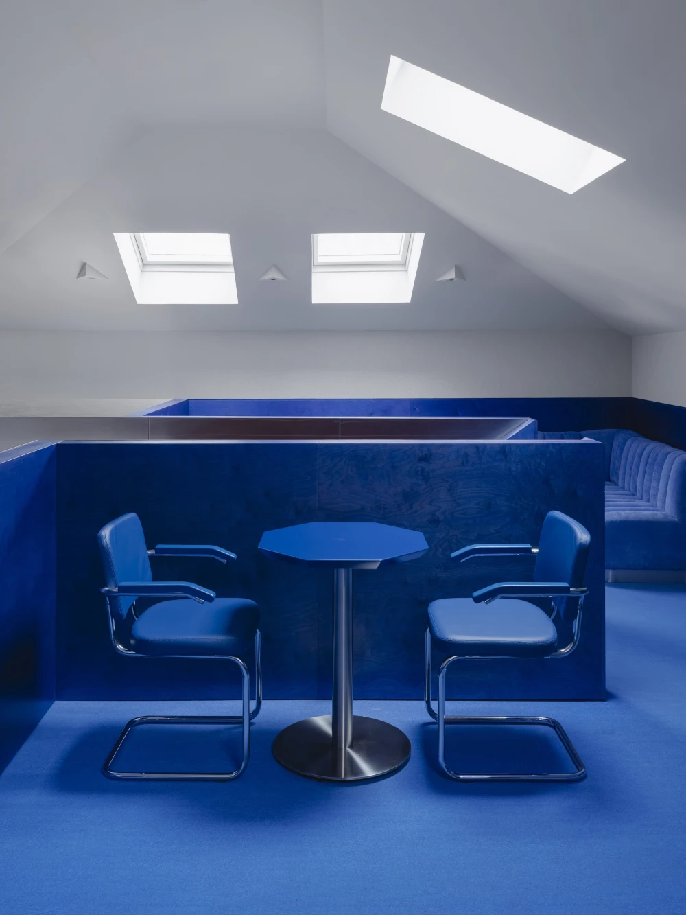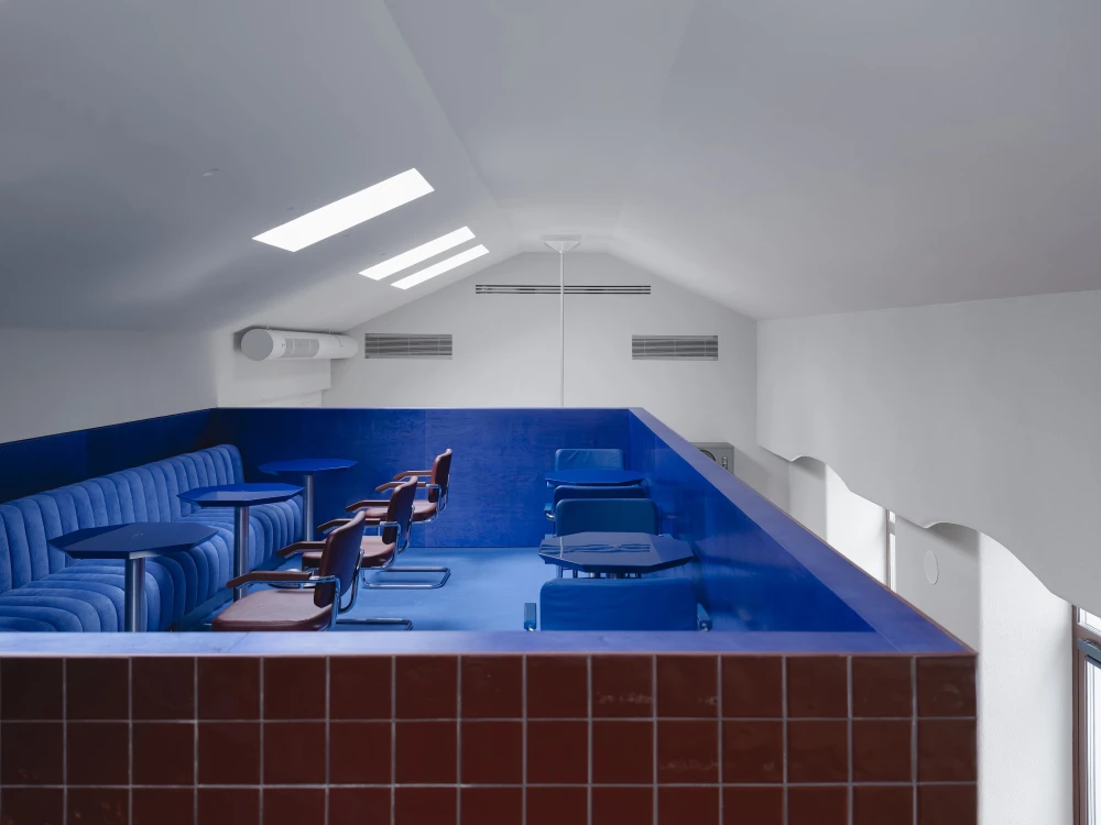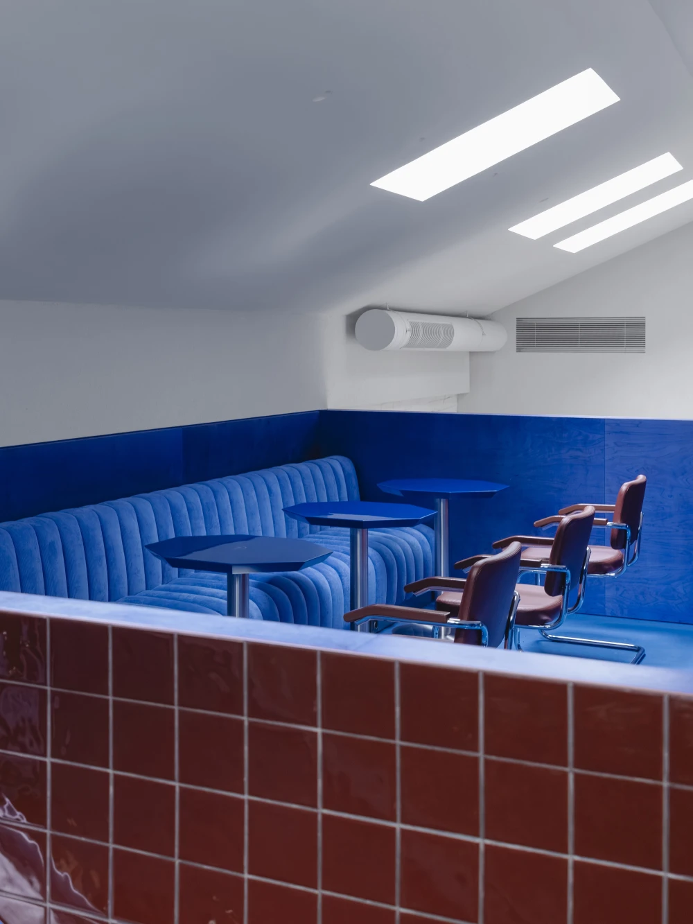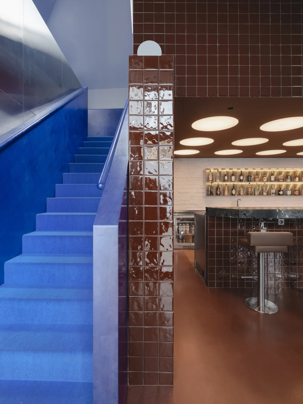 Новый проект бюро .dpt — бар Nightcall — показывает, что охранный статус объекта не является препятствием для смелых решений. Заведение находится во флигеле усадьбы Закревского-Савина XVIII века. Изначально площадь помещения составляла всего 76 кв. метров, но пятиметровые потолки позволили добавить антресоль, увеличив пространство до 104 кв. метров. Конструкция стала частью центрального объема из глянцевой керамики. Он задуман массивным и брутальным, но при этом опирается на стальную колонну, а вокруг него оборачивается синяя лента лестницы, ведущей наверх.