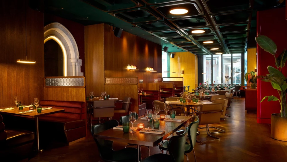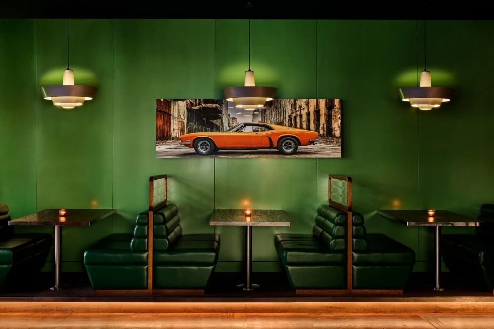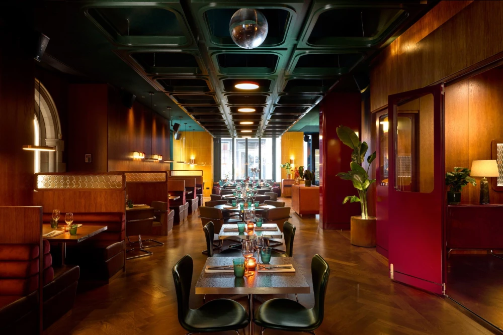 Цветовая палитра — один из ключевых инструментов проекта. По словам дизайнера Сэмюэла Хоскера, команда сознательно ушла от предыдущего облика пространства с отделкой из светлого дуба, которое было «скандинавским» по настроению. Новая версия Motorino стала более камерной: потолок опустили и покрыли темно-зеленымм акустическими панелями, что улучшило пропорции зала — он перестал казаться чрезмерно большим и приобрел некую интимность.