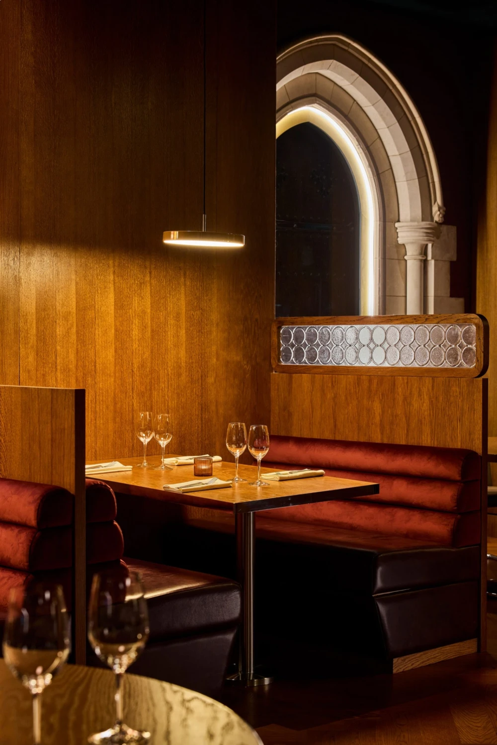 Motorino рассчитан на 150 гостей. Гостей встречает стальной бар с подвесными металлическими светильниками над ним, стены, облицованные деревом, соседствуют с ярко-желтой керамической плиткой и дверями, окрашенными в насыщенный красный. Оформление приватной зоны с облицовкой деревянными панелями вдохновлено студиями звукозаписи 1970-х годов. Одной из самых неожиданных деталей стал проем в стене, открывающий вид на часовню викторианской эпохи, расположенную по соседству — она известна своим золотым интерьером. Когда часовня работает, гости ресторана могут прямо из зала увидеть внутреннее убранство, причудливо контрастирующее с модернистской эстетикой Motorino.