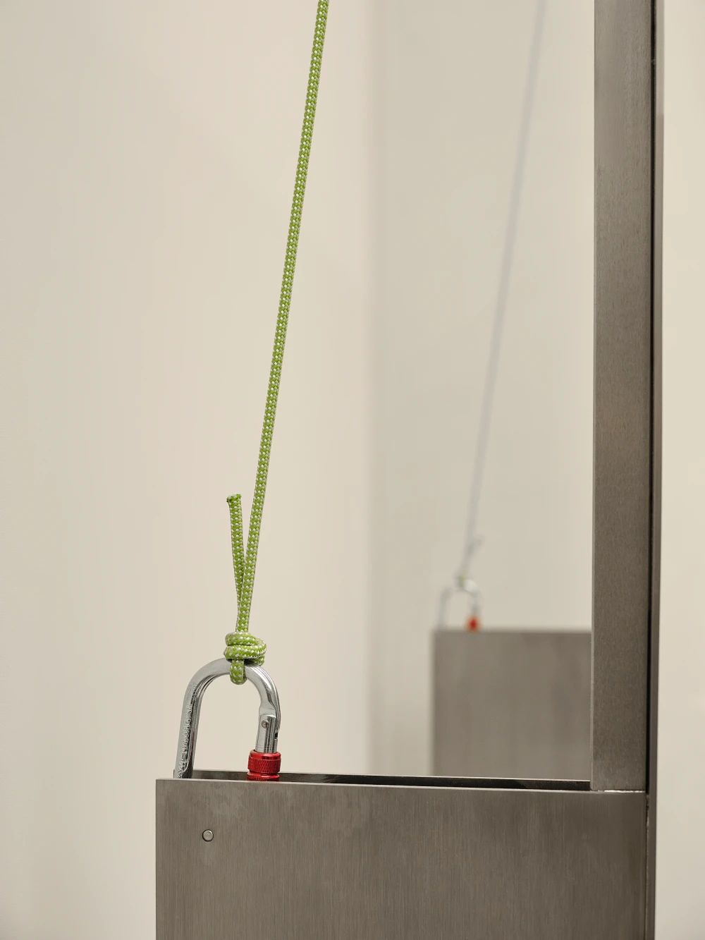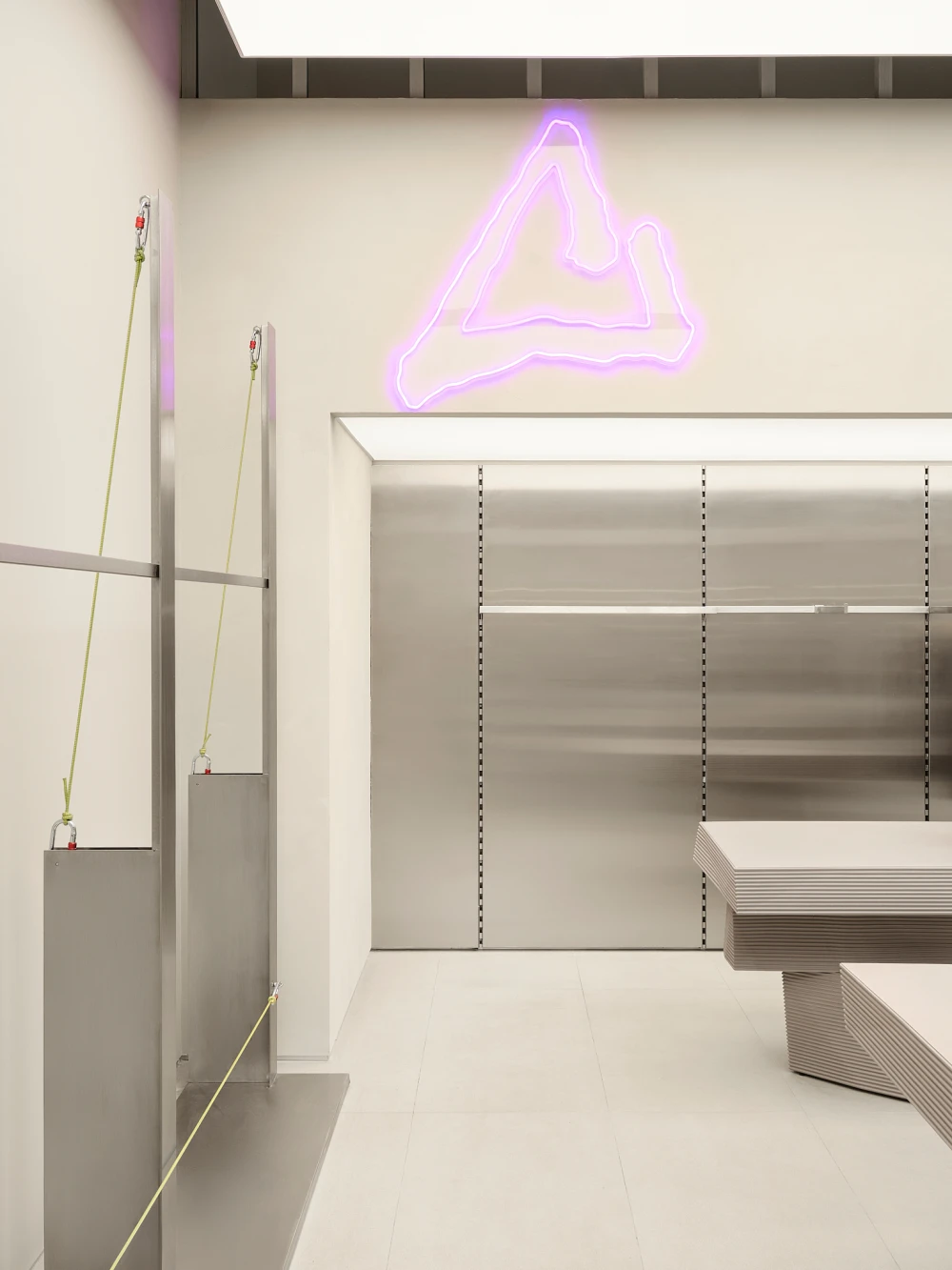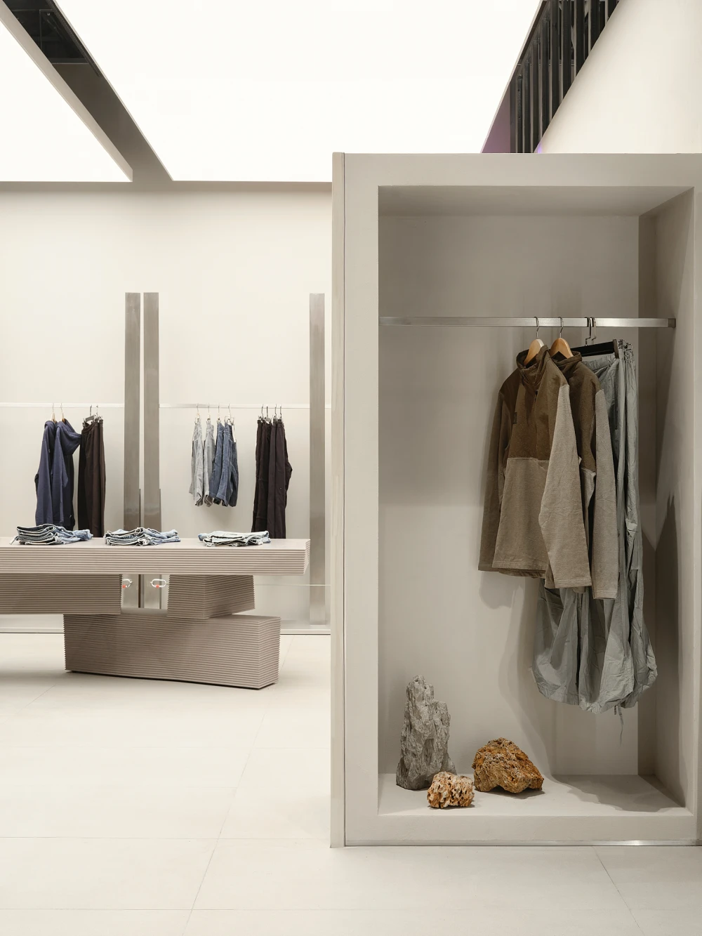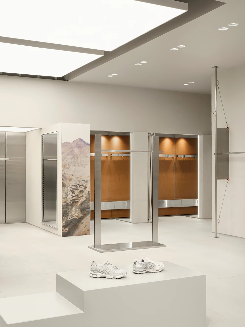 «Основным вызовом проекта стало большое количество товара, который важно показать, не разрушая цельности пространства. Мы исходили из того, что плотность выкладки изменить нельзя, а вот визуальный порядок и ритм — можно. Так появился прием с «лабиринтом», который покупатель будто бы собирает сам, проходя через разные зоны, и стена-трансформер, задающая игру с глубиной и ракурсами. Важным акцентом стал корнер Peak перед примерочными — здесь изменена световая схема и торговое оборудование: крупные лайтбоксы создают ощущение «магазина в магазине», а не просто отдельной секции. Детали — рейлы с карабинами и стропами, тяжелые на вид столы, напоминающие то ли монолитную породу, то ли объект, напечатанный на 3D-принтере, — работают на образ технологичного, но ироничного пространства».