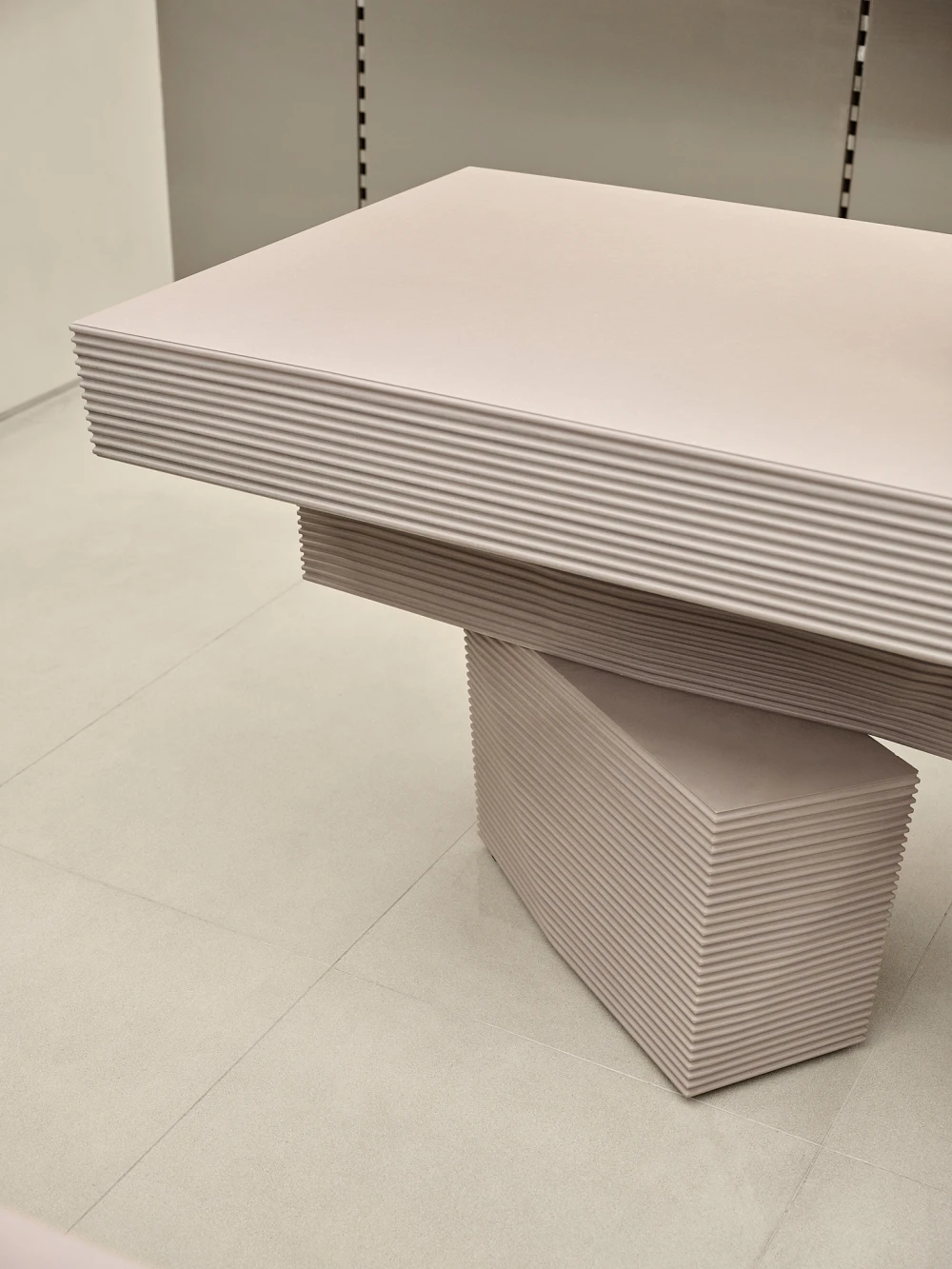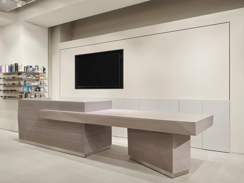 «Важный материал проекта — Valchromat, окрашенный в массе МДФ, использованный для кассовой зоны и столов. Его фрезеровка позволяет получать рельефные «ребристые» поверхности без дополнительных накладных элементов — это одновременно и про тактильность, и про экономию при производстве. В зоне обуви первоначально планировались полностью стальные системы, но решение упростили до лаконичных полок, которые работают благодаря точным пропорциям и ритму. Для экспозиции досок для серфинга команда опиралась на опыт работы с магазином Stadion — часть неиспользованных тогда идей трансформировалась в новые конструкции. Потолок в финальной версии закрыт легкой сеткой: сначала его хотели оставить полностью открытым, но сетчатая структура сделала пространство аккуратнее и яснее, не скрывая при этом промышленную логику ТРЦ».