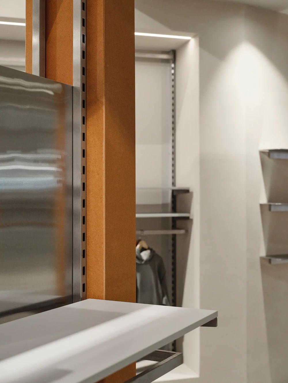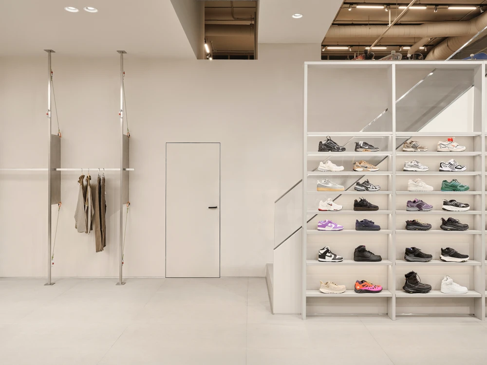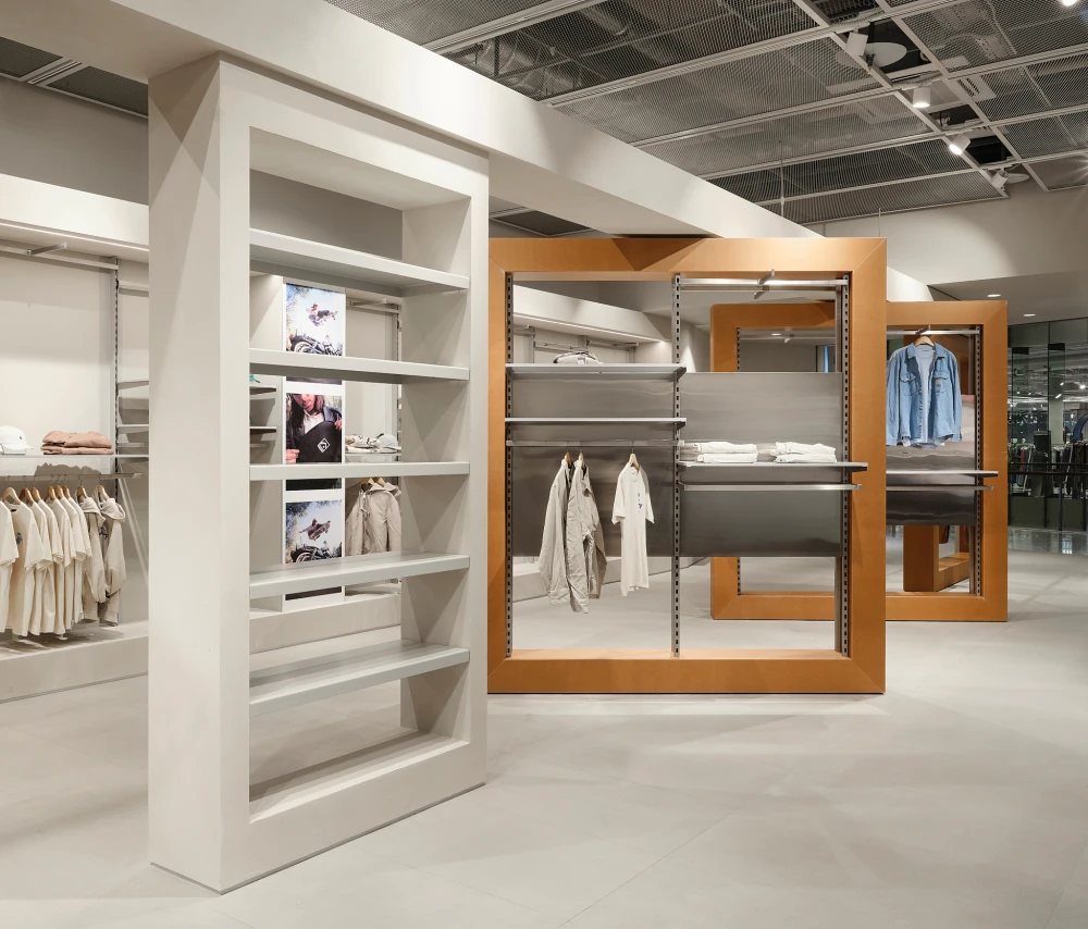 «Вместо попыток бороться с формой помещения мы использовали ее как ресурс. Входная зона стала стартом маршрута — здесь расположена стена-трансформер, меняющая сценарий движения и восприятие магазина. Далее пространство разворачивается в последовательность корнеров и функциональных зон, а в глубине посетителя встречает отдел обуви с удобным островом в центре. Примерочные разместили слева от складского блока — получились просторные и комфортные кабины, работающие как отдельный «карман» внутри общего потока».
