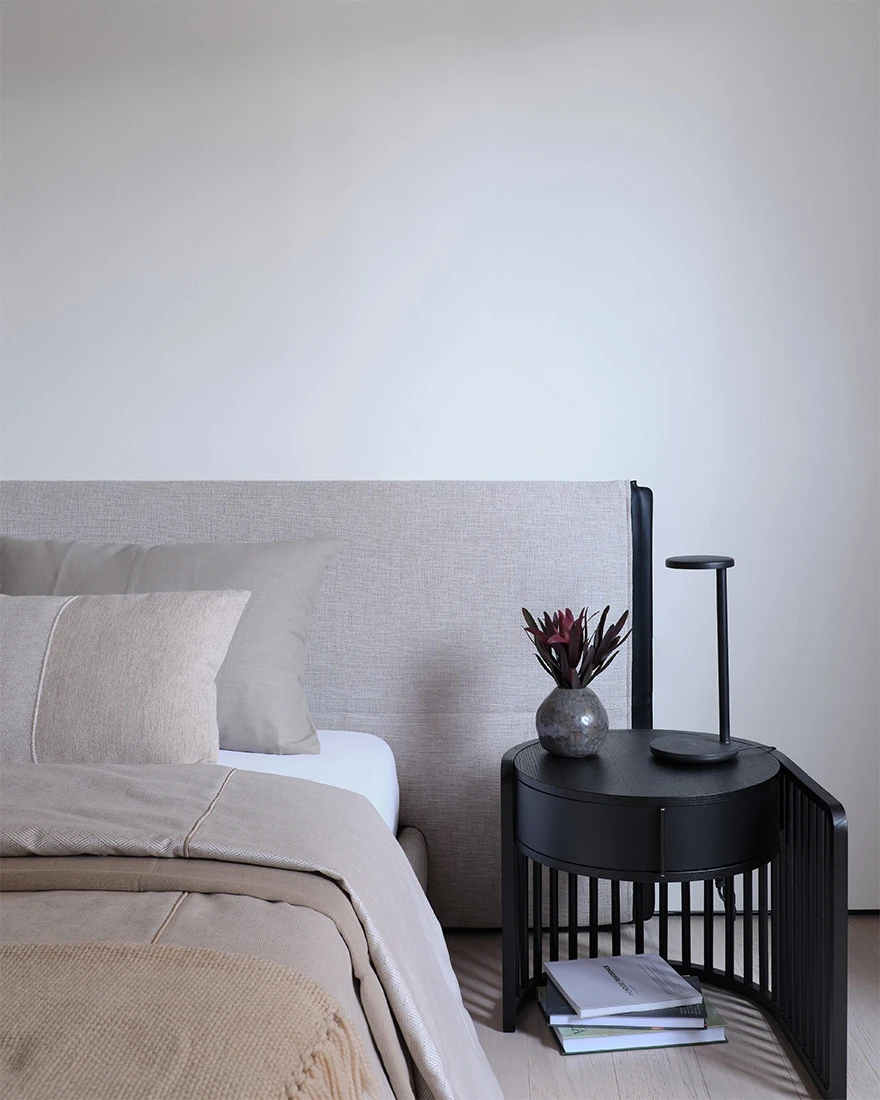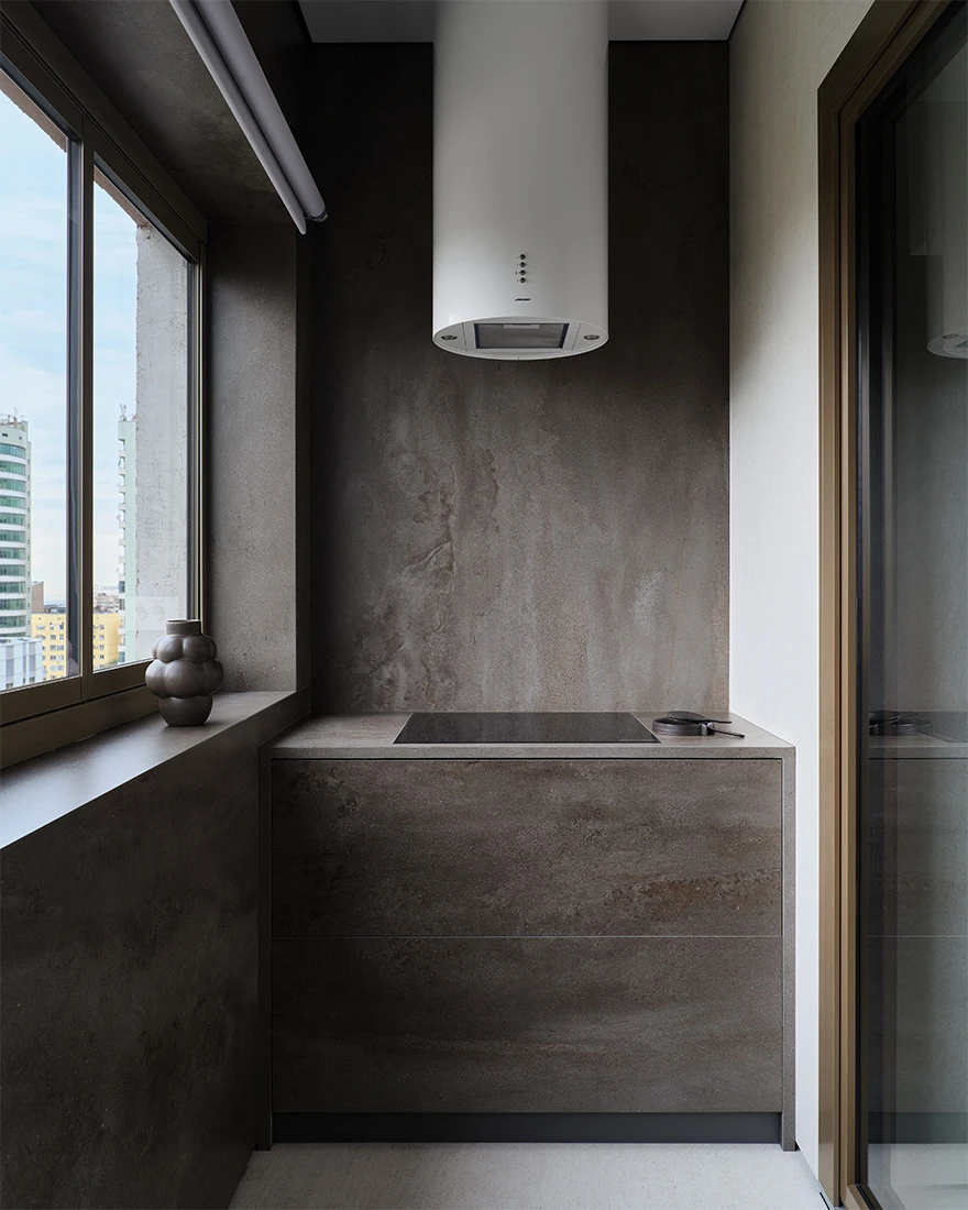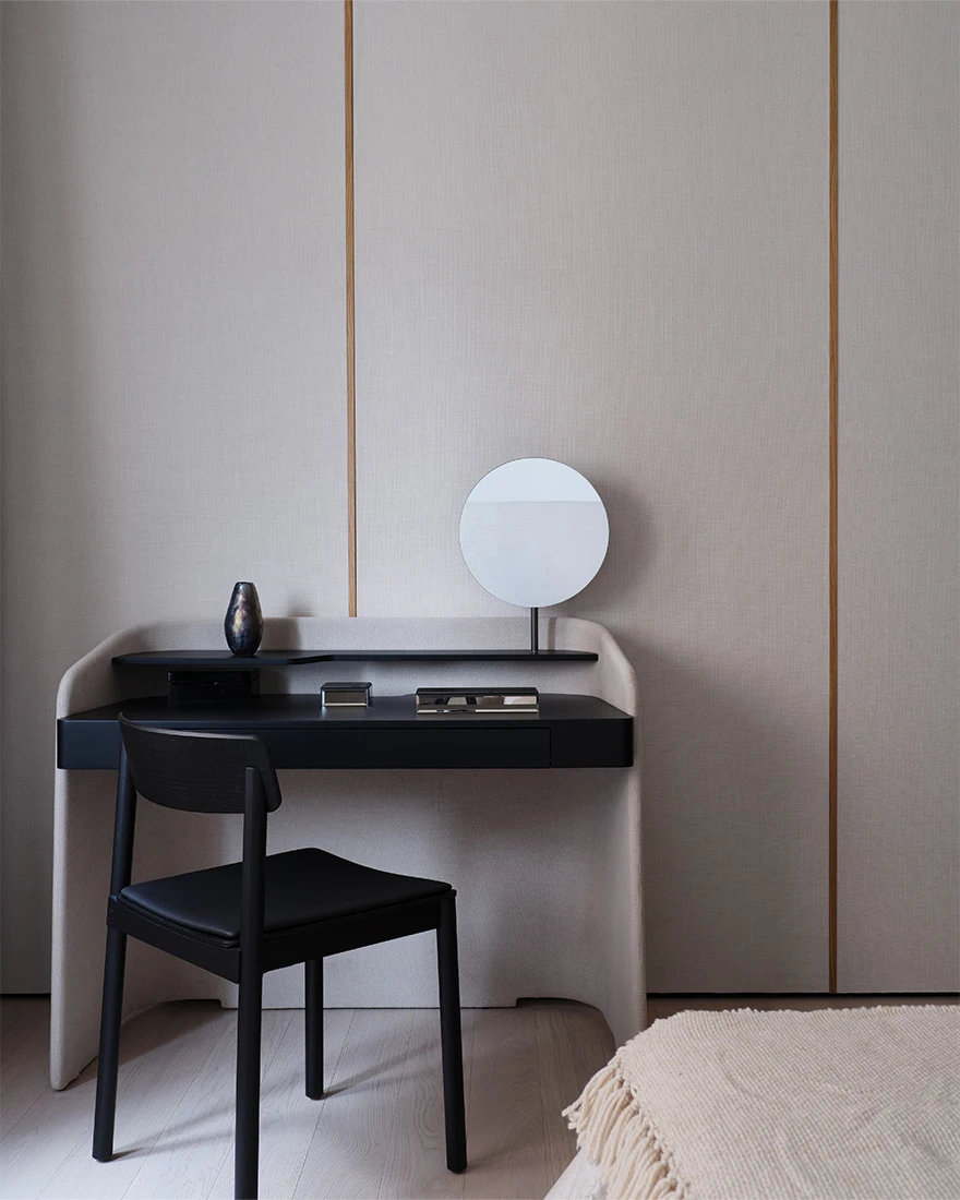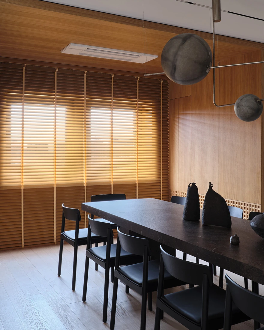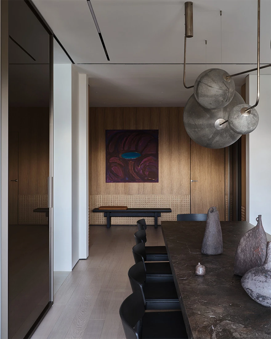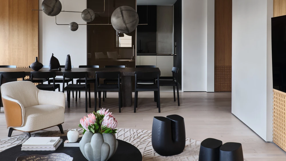 Интерьер выдержан в естественных нейтральных тонах, подчеркивающих фактуры материалов и панораму за окном. Мебель подбиралась по принципу вневременности и скульптурной выразительности. Центр притяжения — монументальный обеденный стол на 14 персон. Архитектурную строгость смягчают радиусный диван и изогнутый торшер, а выразительный светильник над столом, «напоминающий скопление астероидов», выступает главным арт-акцентом.