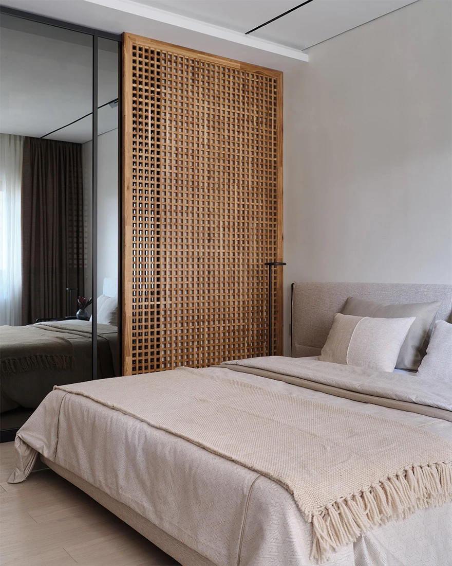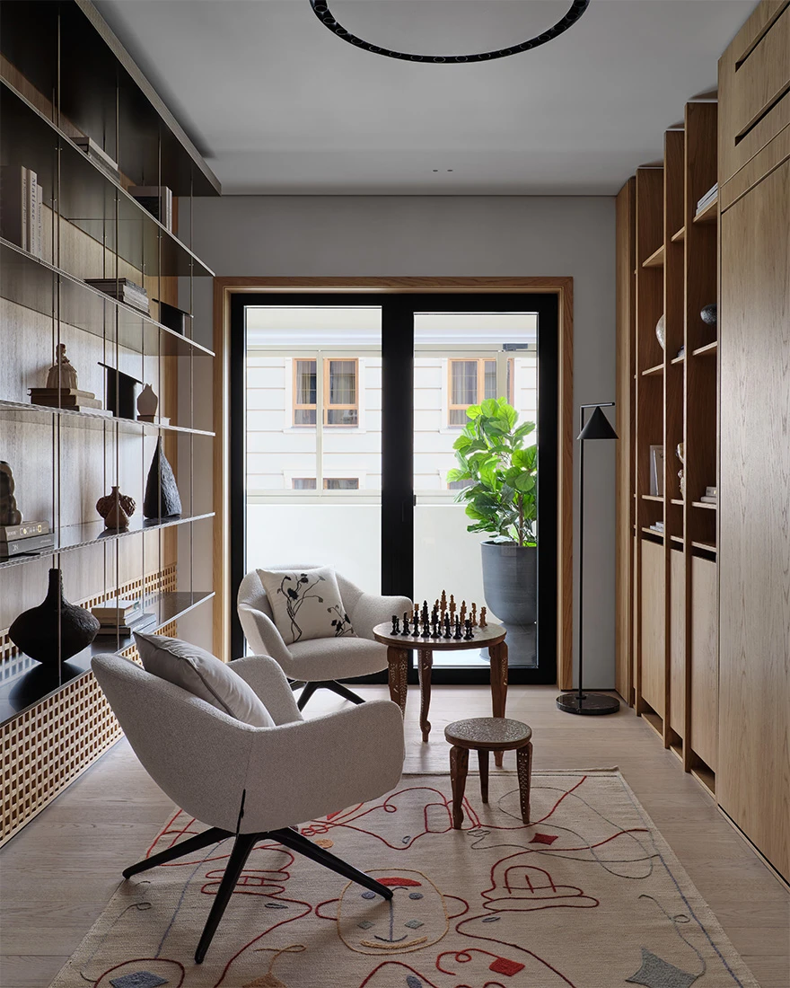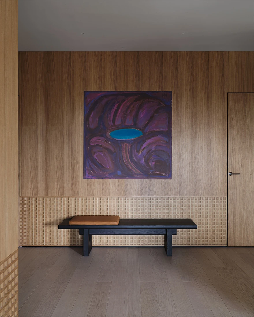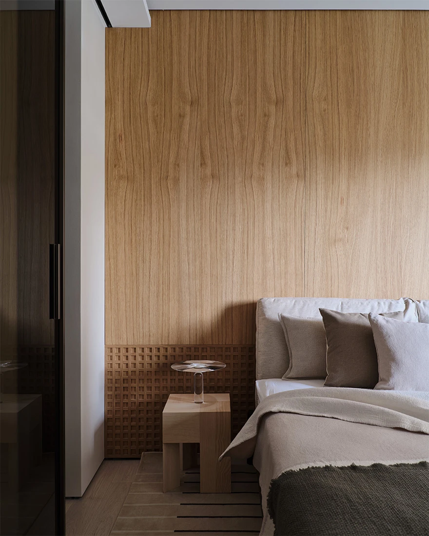 Сложная геометрия пространства была скорректирована: проведена перепланировка с выделением полноценного гостевого блока с гардеробной, санузлом и системами хранения для комфортного длительного пребывания родственников. Идея родового гнезда воплощена через современную эстетику без ретро-цитат. Строгий минимализм бюро дополнило мягкостью и теплом натуральных материалов. Ключевой элемент — дубовые панели со сложным рисунком, которые визуально выравнивают пространство и создают уют.