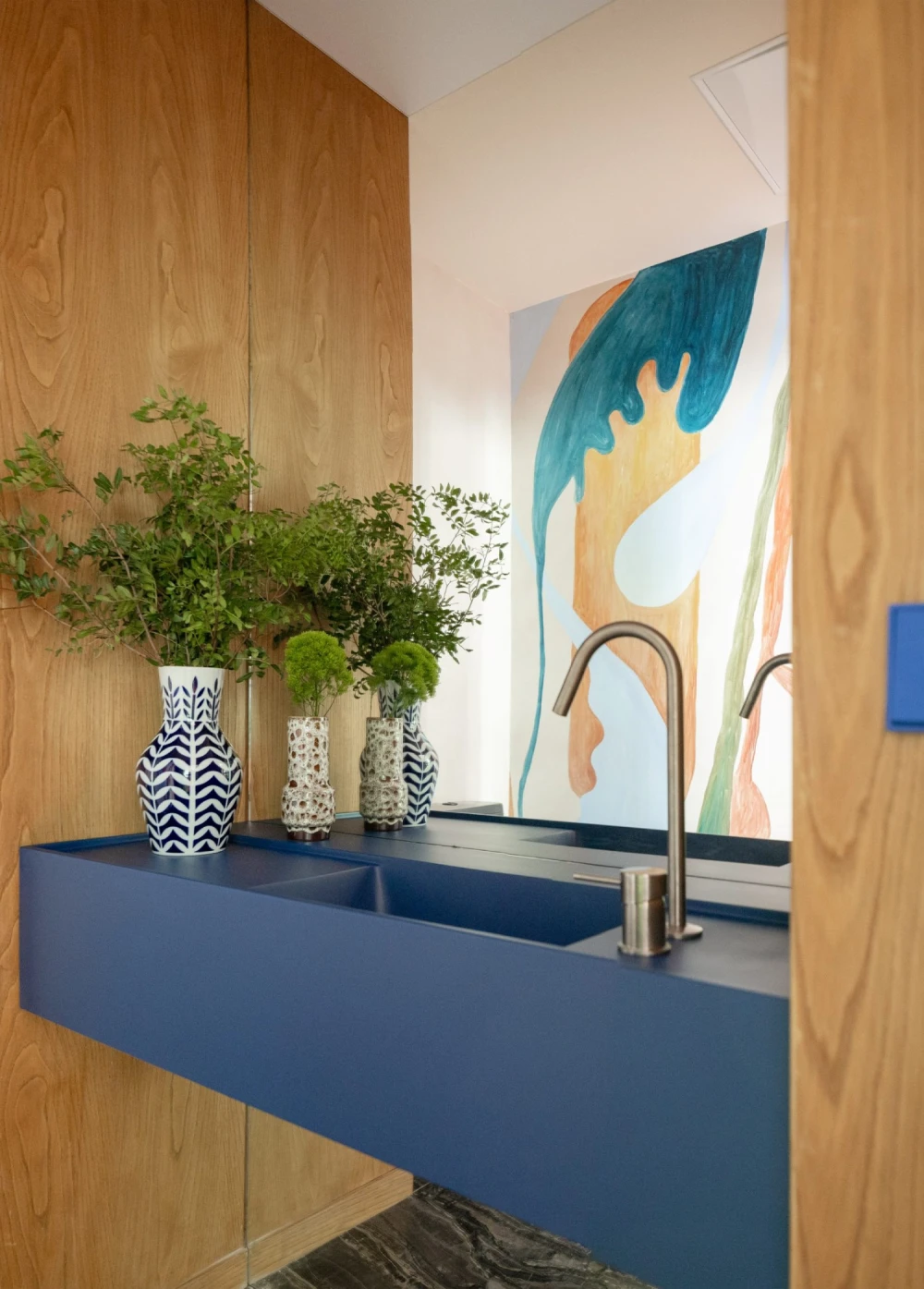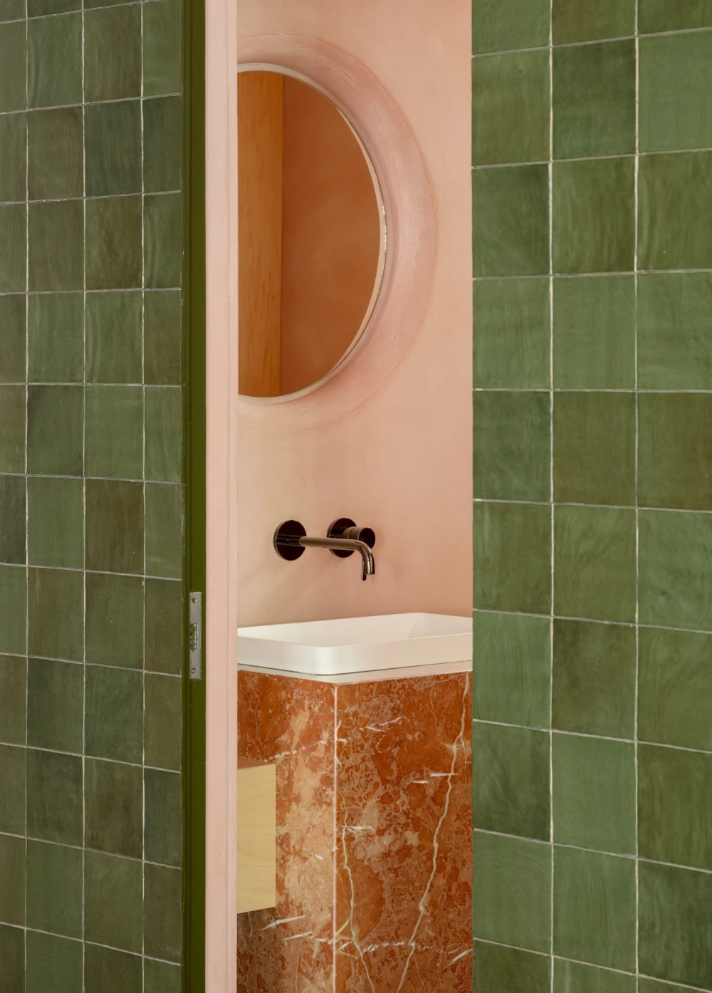 Санузлы также стали частью экспозиции: здесь демонстрируются различные типы отделки и сантехнические решения, доступные клиентам студии. Они скрыты за стеной из глазурованной плитки с потайными дверями. Глубокий зеленый цвет плитки — один из фирменных оттенков Tabula Studio, отсылающий к природе и горам Страны Басков. Входная зона оформлена лакированными зелеными панелями во всю высоту, за которыми спрятаны инженерные решения. Перегородка у входа обтянута текстилем с растительным орнаментом от Arte International — это еще одна аллюзия к природе.