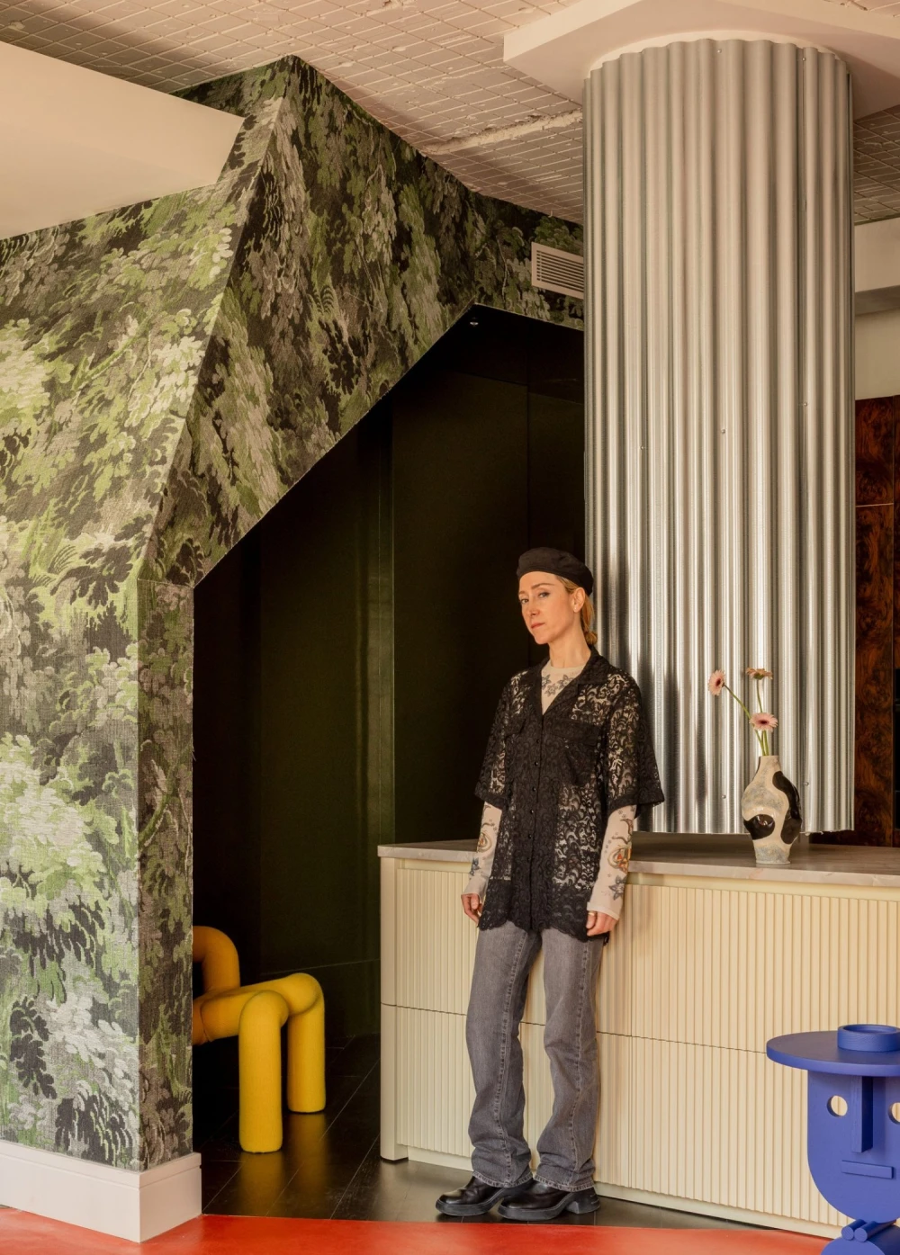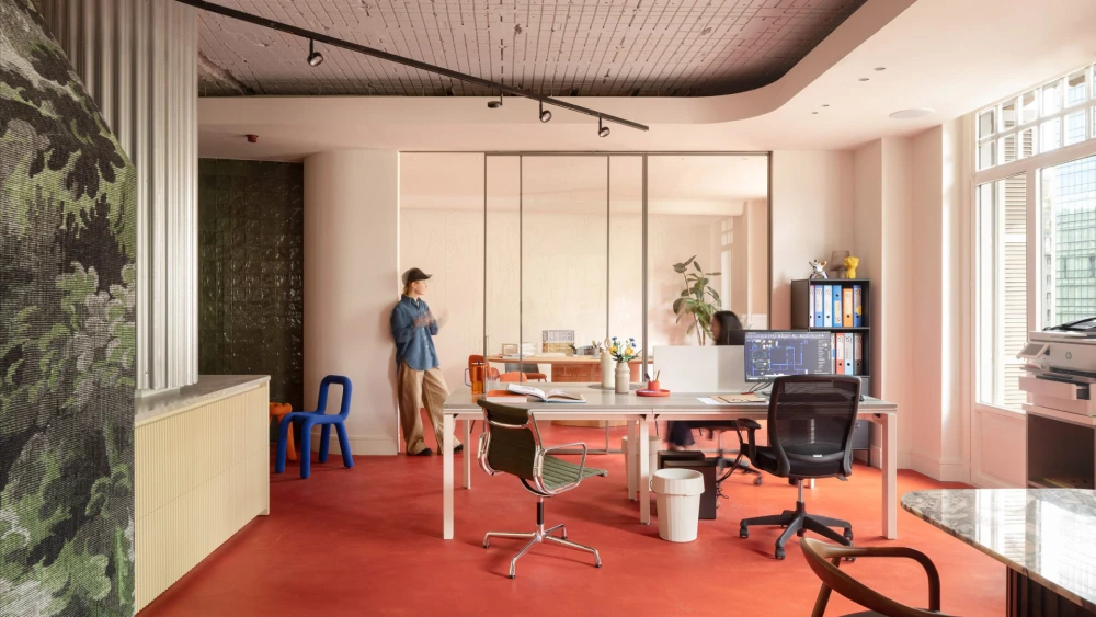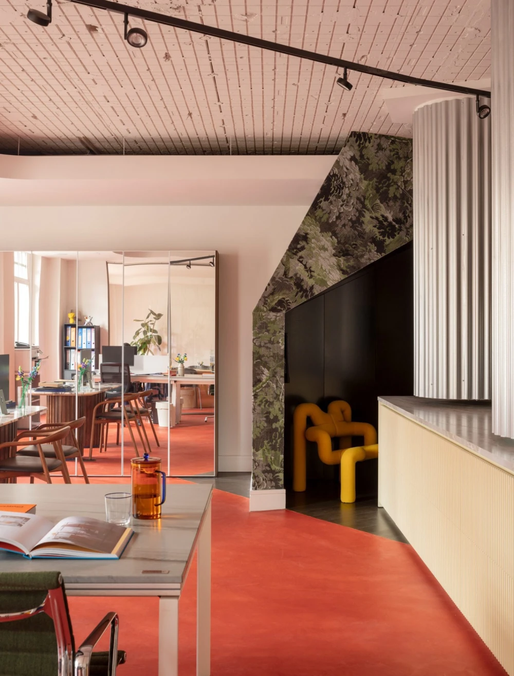 Планировку изменили: вместо разрозненных помещений появилось открытое пространство с пятью рабочими местами и переговорной, отделенной стеклянной перегородкой. Объединяющим элементом выступает наливной пол красного цвета. По словам Апрайс, этот оттенок символизирует «чистую энергию» — теплую, активную и наполняющую пространство жизнью.