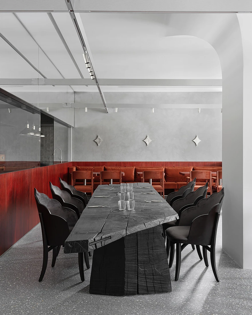 Вся мебель выполнена на заказ. «Наиболее примечательными предметами являются, безусловно, стулья. Их спинки вдохновлены силуэтами кокошников — изогнутые, резные, они продолжают линию образов сказочных героинь. Это визуальный акцент, создающий цельный фольклорный образ, — рассказывает Елена. — Также ключевым объектом стала большая общая столовая группа из черного дерева для второго зала. Ее сложная форма требовала индивидуальной работы — к ее созданию мы даже привлекали художника, который специализируется на таких масштабных объектах».