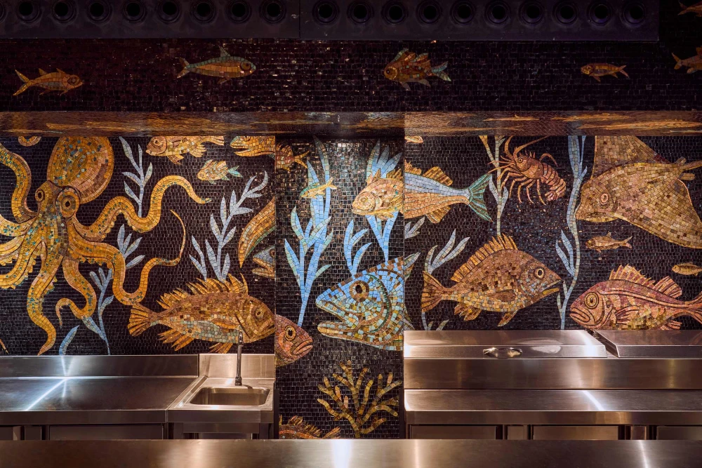 Главным акцентом стало сверкающее мозаичное панно с морским мотивом. Его созданием занимались мастера компании SICIS совместно с Bureau Lacroix. Мозаика переливается в зависимости от освещения и вносит необходимый элемент динамики.