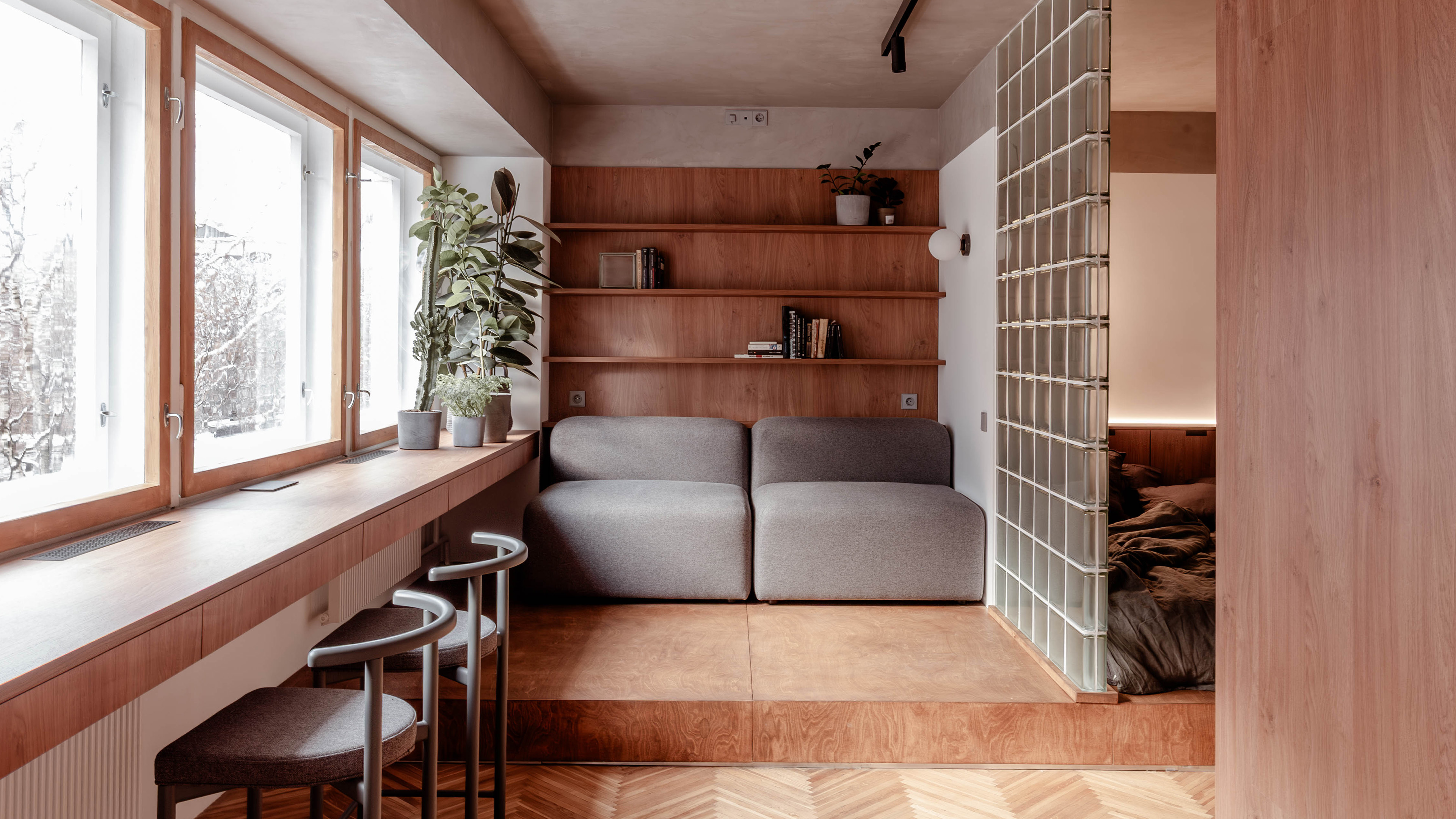 Архитекторы полностью демонтировали перегородки, создав открытую планировку. Гостиная и спальня объединились общим деревянным подиумом, а стена из стеклоблоков обеспечивает приватность спальне, но не «глушит» пространство. Микроцемент на полу и потолке формирует монолитный фон и подчеркивает деревянные акценты. «Вдоль панорамных окон проходит длинная рабочая столешница. Она служит и местом для работы, и баром для быстрых завтраков», — отмечают Дарья и Александр.