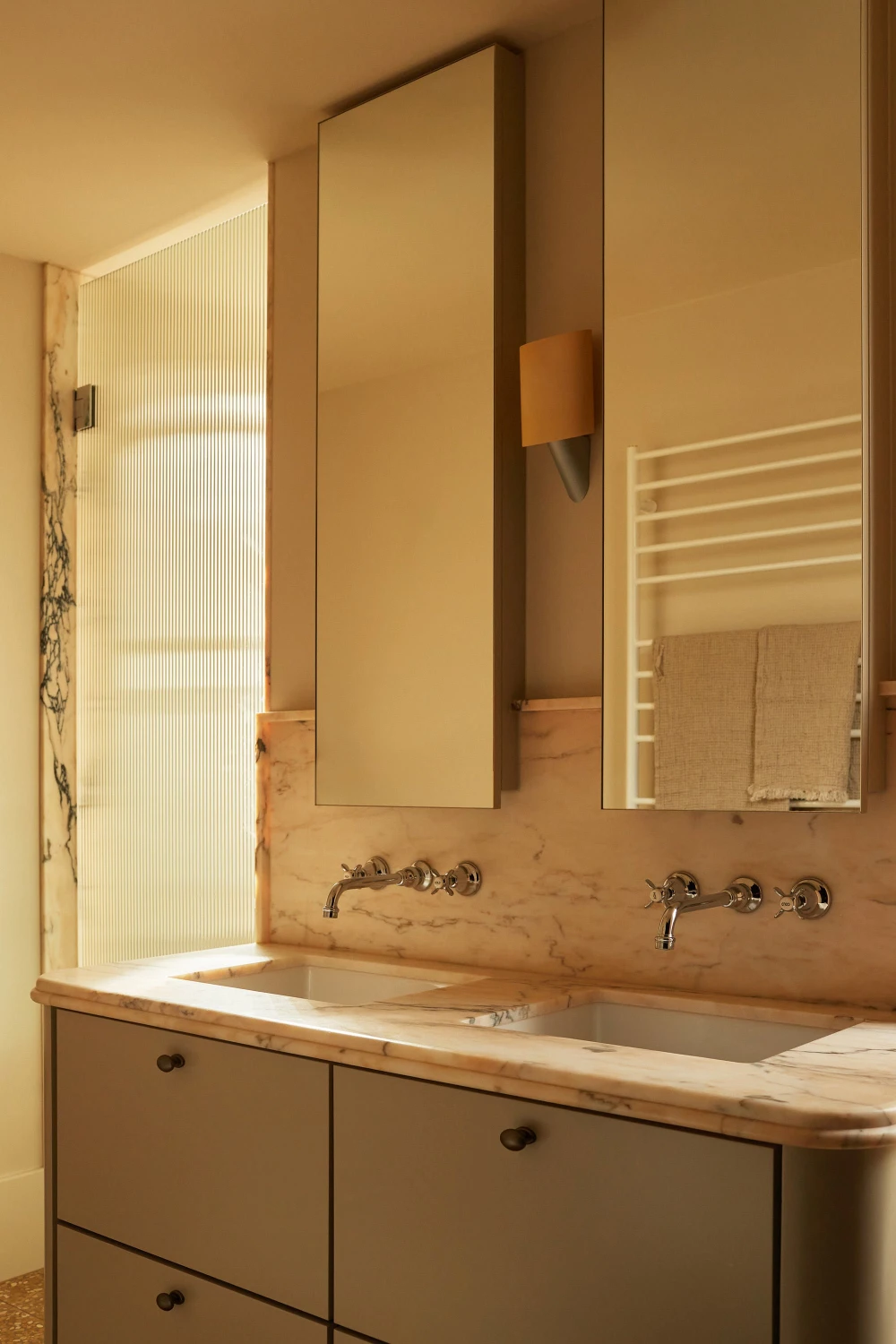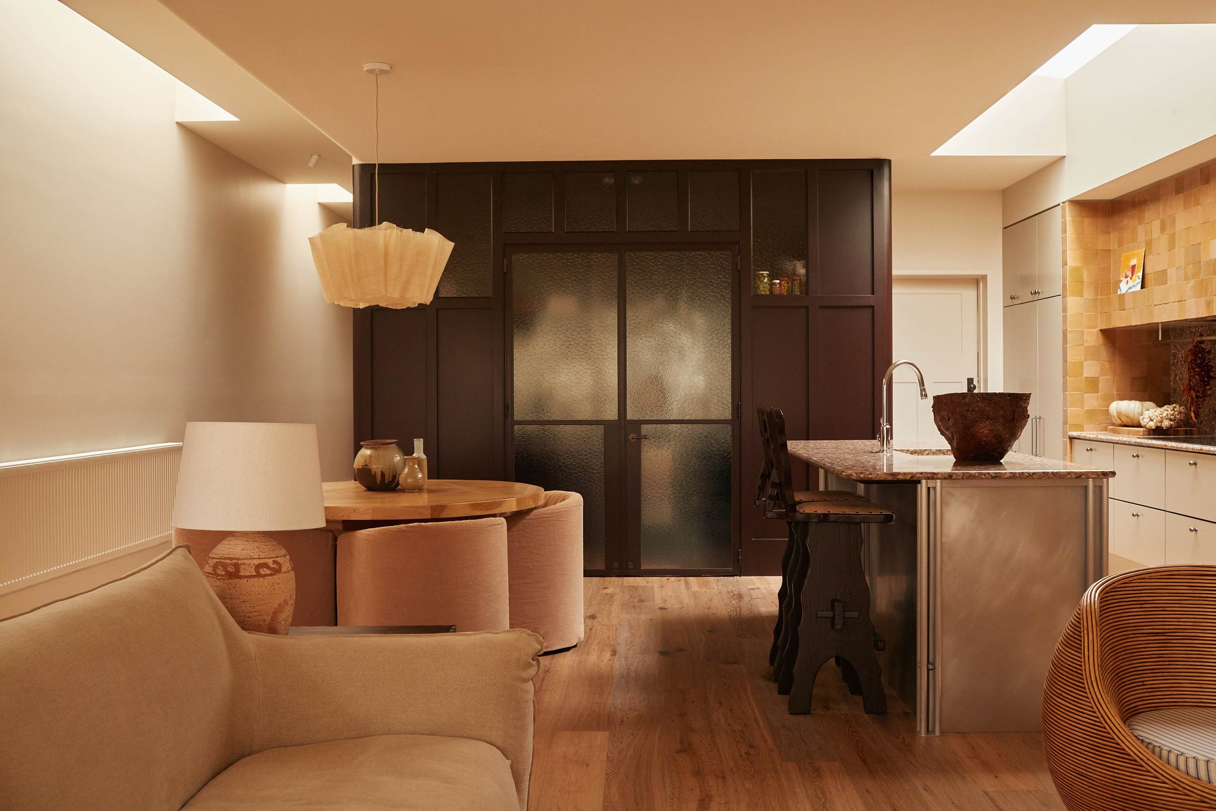 «Оригинальные передние комнаты несут в себе всю тяжесть эдвардианского стиля, — объясняет дизайнер. — Здесь он усилен: богато украшен, текстурирован, детализирован. Но по мере того, как вы продвигаетесь вглубь дома, это наследие постепенно растворяется в чем-то более спокойном. Вместо резкого перехода происходит просто изменение плотности».