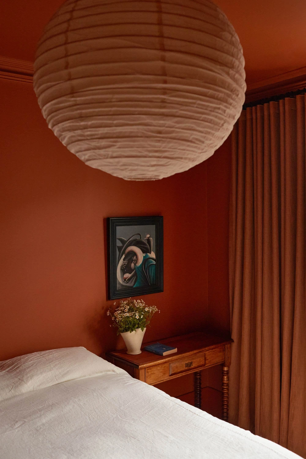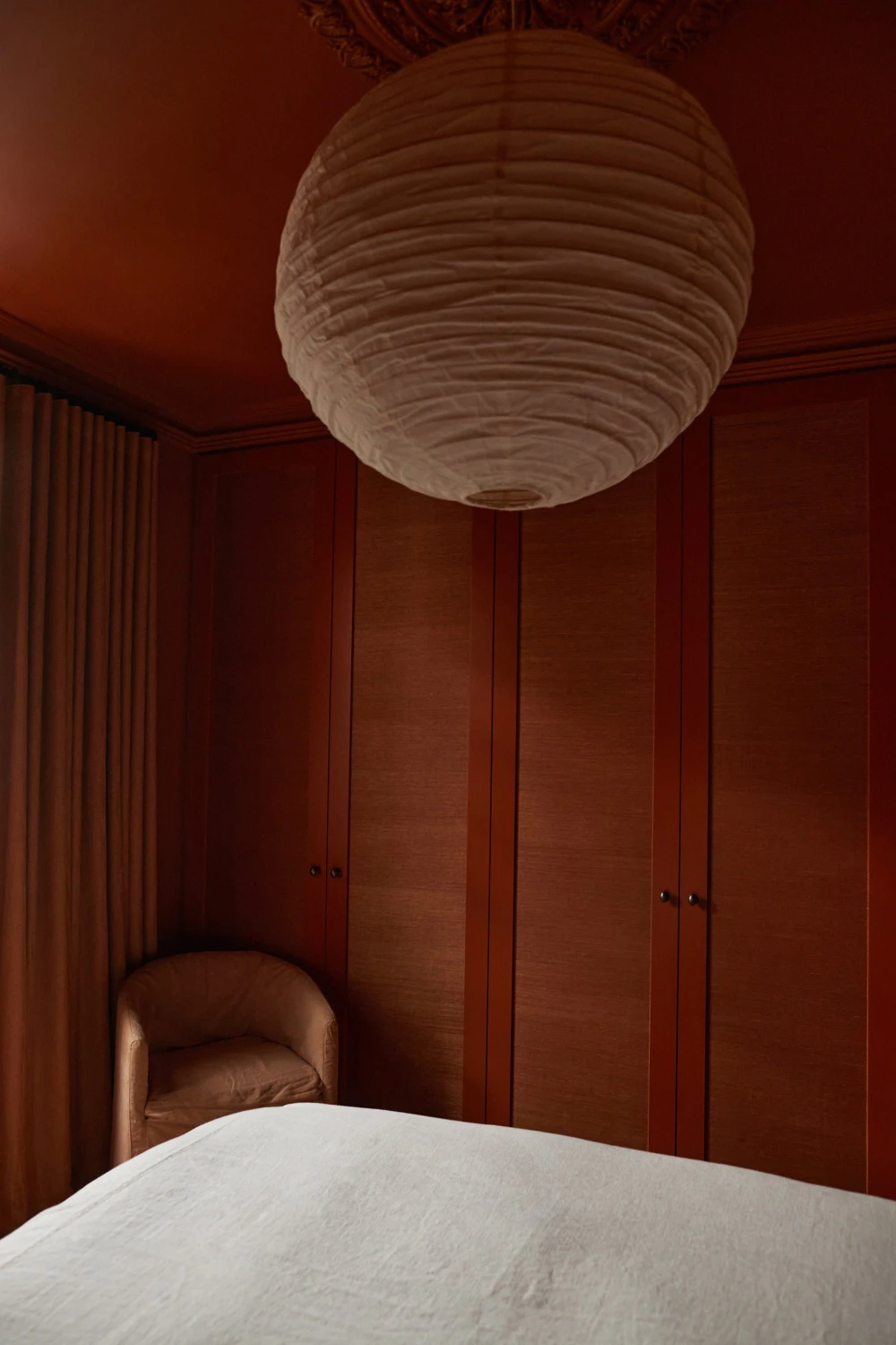 На втором этаже светлые спальни контрастируют с основной зоной, где использованы глубокие насыщенные оттенки и выразительные текстуры. Гостевая комната на первом этаже, решенная в красных тонах, подчеркивает любовь хозяев к гостеприимству. «Здесь чувствуется атмосфера хорошего отеля, — продолжает дизайнер. — Мы сознательно наполнили комнату цветом и создали в ней определенное настроение, чтобы гости чувствовали себя особенными».