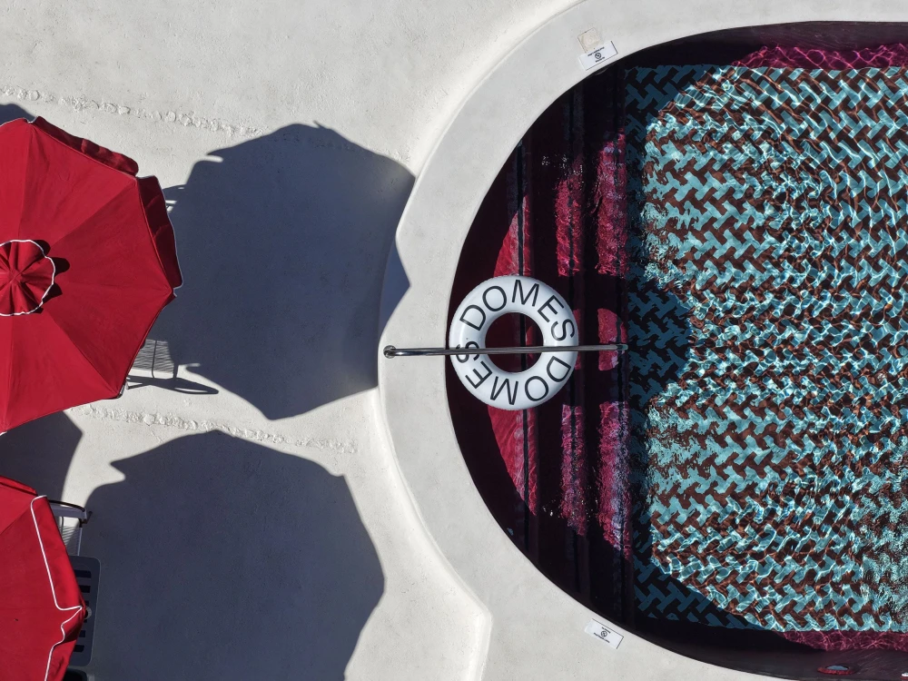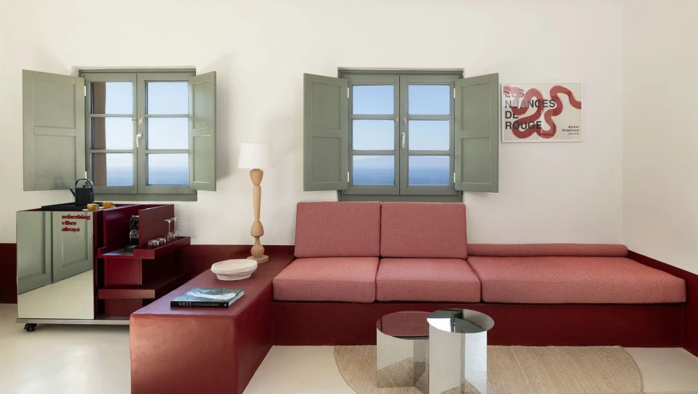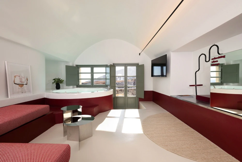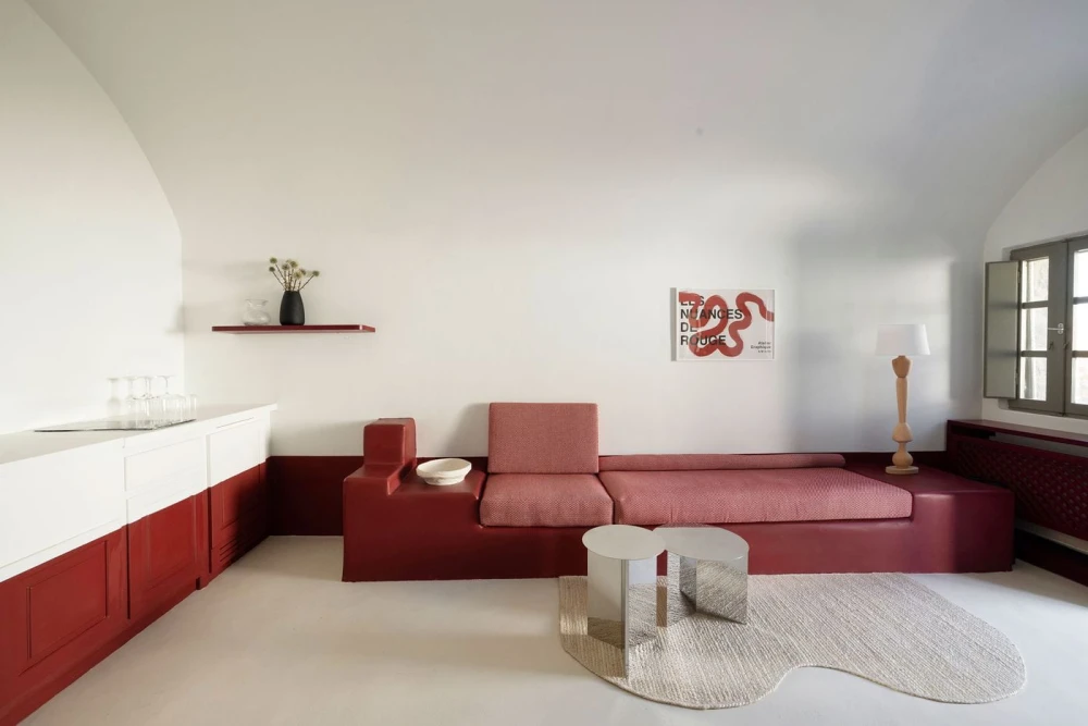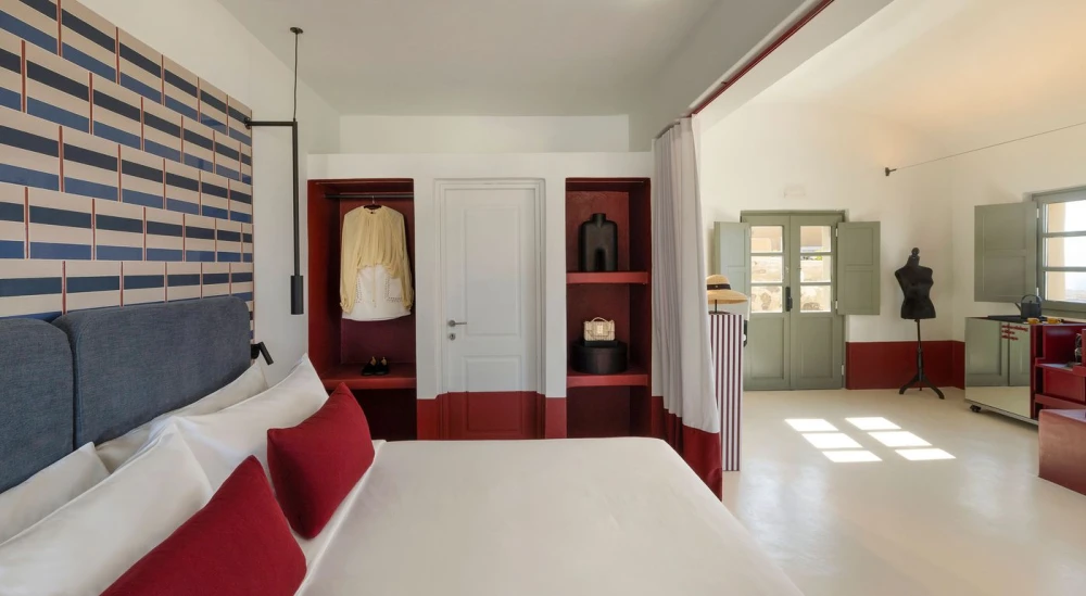 В отеле 16 номеров, многие из них оборудованы кухнями, а три премиальных сьюта дополнены джакузи. Высокие своды, арочные проемы и гладкие белые поверхности отсылают к традиционной кикладской архитектуре. Внутри разворачивается более смелый интерьерный сценарий. Красный цвет появляется в виде своеобразного «пояса», оживляющего светлую базу в песочных и землистых тонах — на встроенной мебели, нижних частях стен, в нишах. Полосы, геометрические узоры, текстиль с винтажными отсылками формируют настроение греческих курортов 1950–60-х годов, транслируя ощущение беззаботного лета, пропущенное через современную дизайнерскую оптику. Внимание привлекают детали, отсылающие к моде: манекены, туалетные столики в стилистике гримерных, низкие подиумы, напоминающие об эстетике бутиков одежды.