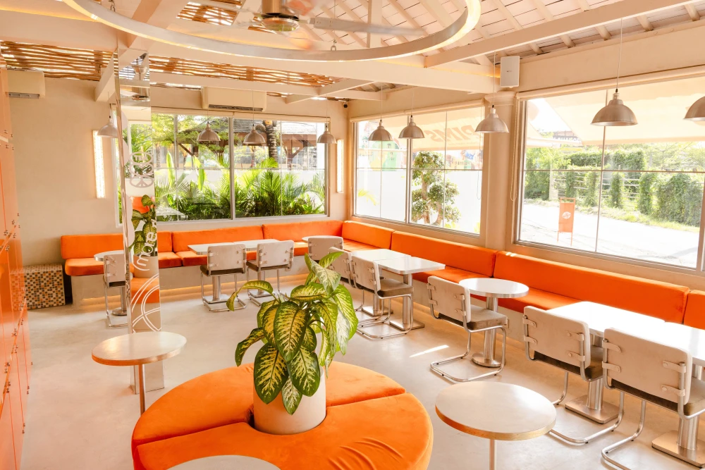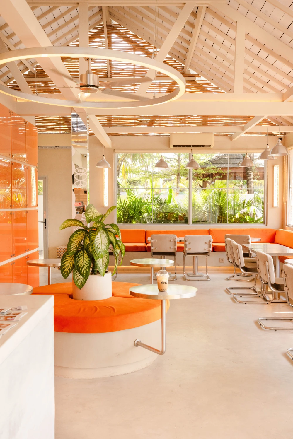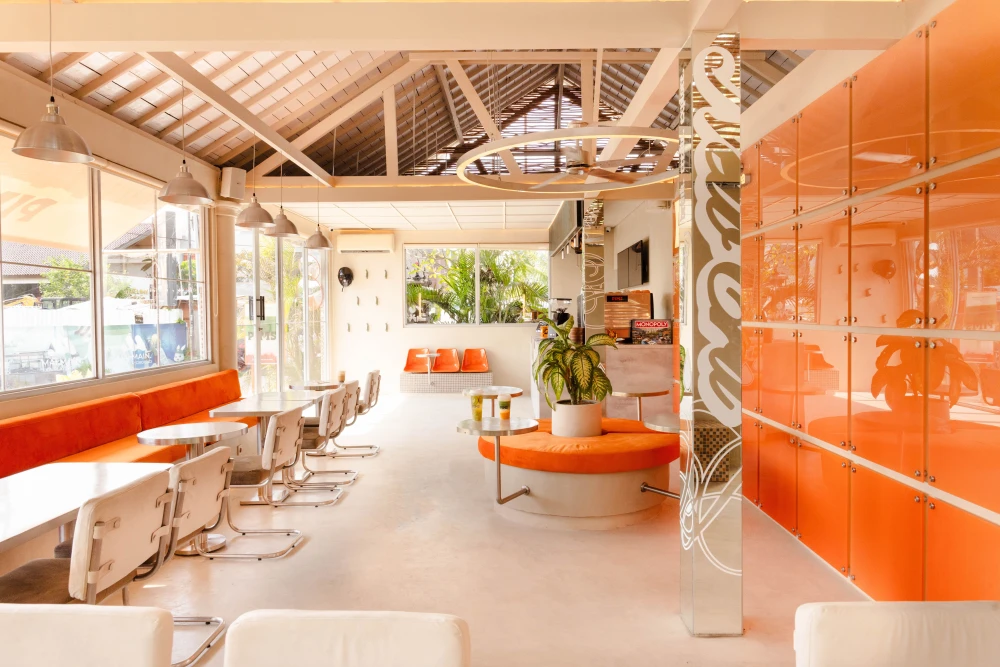 Пространство площадью 98,4 кв. метра рассчитано на 30 гостей, и еще 10 посадочных мест организованы на улице. Концепция основана на дизайн-коде бренда, который был адаптирован под специфику и климат региона. Его влияние считывается в фирменной оранжевой палитре и акцентных деталях, например, дорожных знаках, дополняющих фотозону снаружи, и держателях для шлемов, предусмотренных у входа в кафе.
