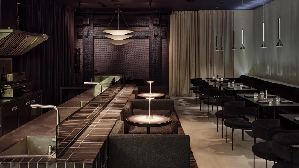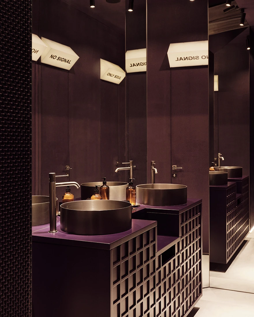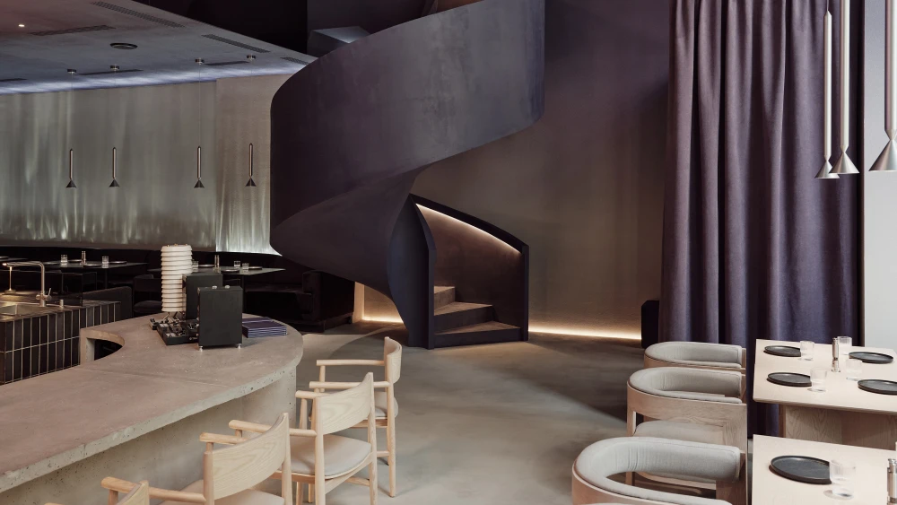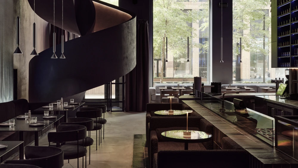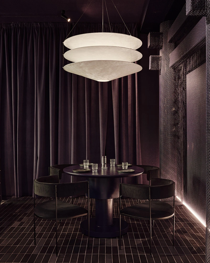 Большая часть мебели выполнена на заказ. Фактурная кирпичная кладка открытой кухни имитирует аутентичную керамику, а бетонный фасад бара с естественными порами и подтеками придает интерьеру живой характер. «Огромное значение в проекте мы уделили освещению. Каустические узоры на стенах первого этажа создают эффект дымки, стальные лампы Pholc Apollo контрастируют с люстрами Floatation из японской бумаги, а динамический лайтбокс бара меняет атмосферу в зависимости от времени суток», — говорит дизайнер.