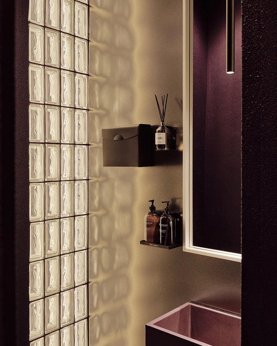 «Главным композиционным «героем» стала винтовая фиолетовая лестница из микроцемента. Она расположена прямо напротив входа, и это первое, что видит посетитель, попадая в лаундж. Она как будто приглашает рассмотреть не только основную посадку первого этажа, но и подняться на второй», — завершает дизайнер.