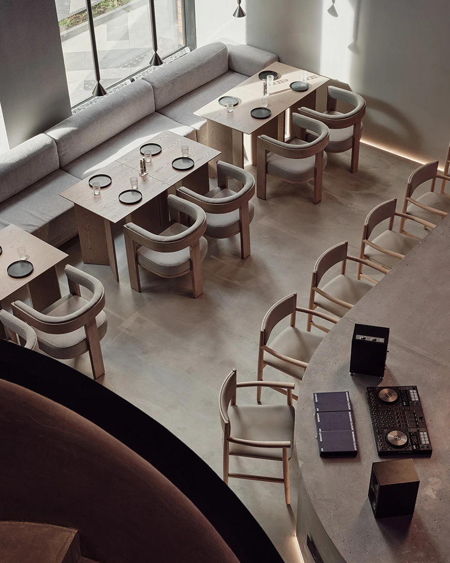 Исходное бетонное помещение было простым: одноэтажное, с высоким потолком в семь метров. Дизайнер добавила второй уровень, увеличив полезную площадь. «Мы разделили пространство на две функциональные зоны и добавили приватность там, где она необходима. На первом этаже находится общая ресторанная посадка с контактным баром, за которым на выходных можно послушать dj-сеты, а на втором этаже расположены пять отдельных закрытых зон для отдыха и работы»