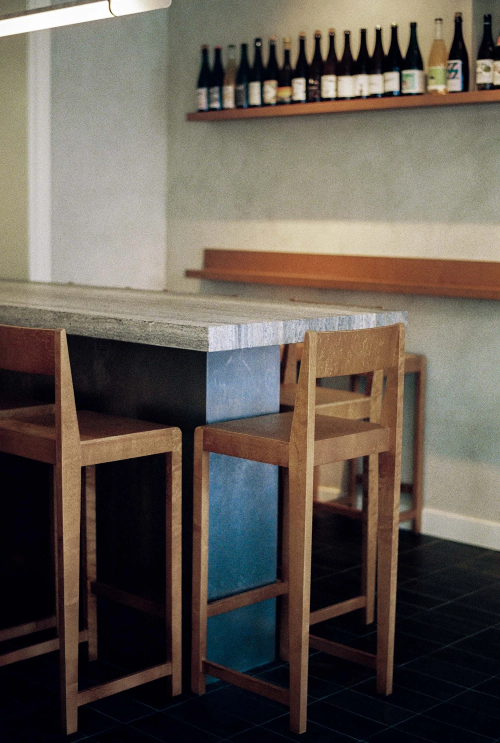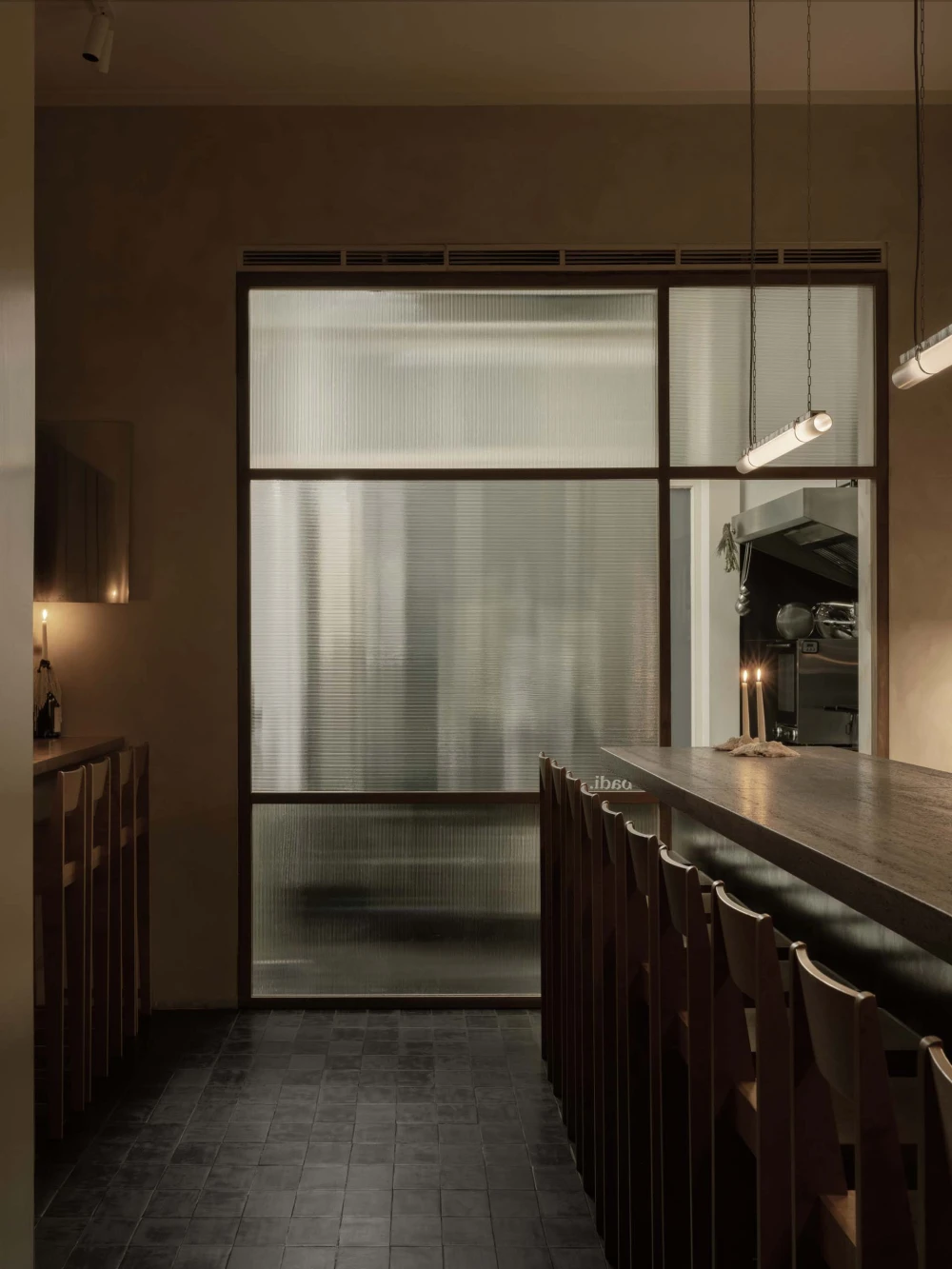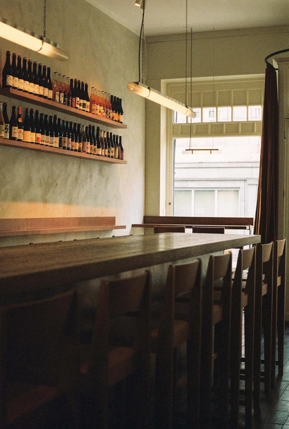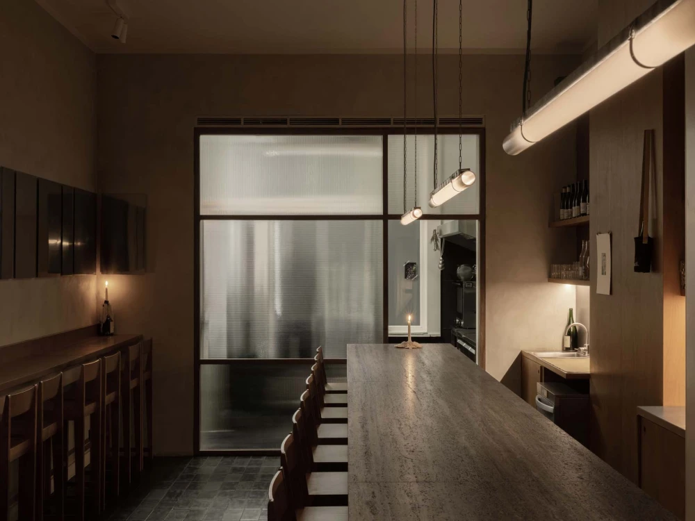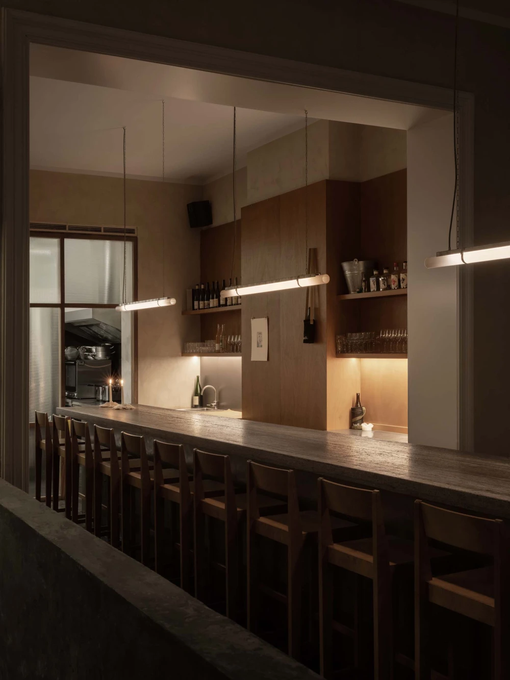 Пространство ресторана организовано вокруг большой центральной стойки, которая предлагает гостям разделить трапезу, — это решение было подсказано опытом работы дуэта в Японии. В интерьере также присутствуют предметы бельгийского дизайна: так, здесь можно заметить светильники Barbier Bouvet и стулья FRAMA. Камерное и интимное пространство отражает подход владельцев к кухне и работе с продуктами, предлагая посетителям новый гастрономический и эстетический опыт.