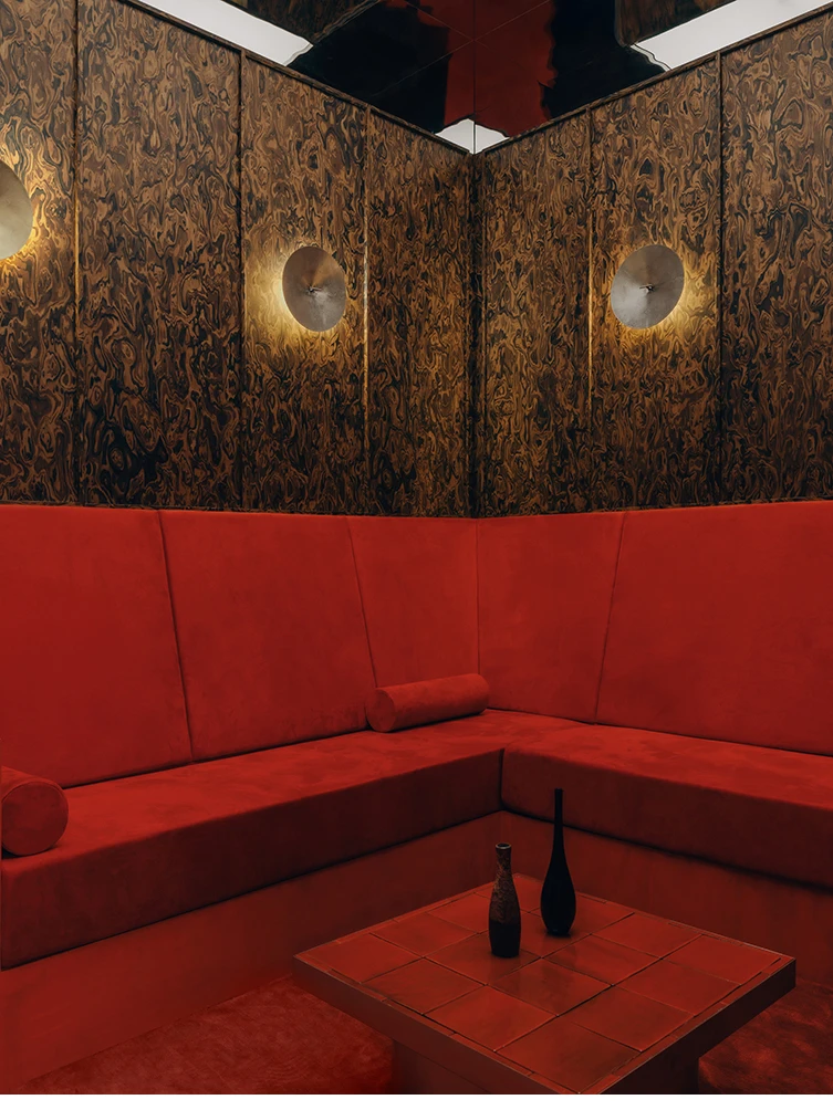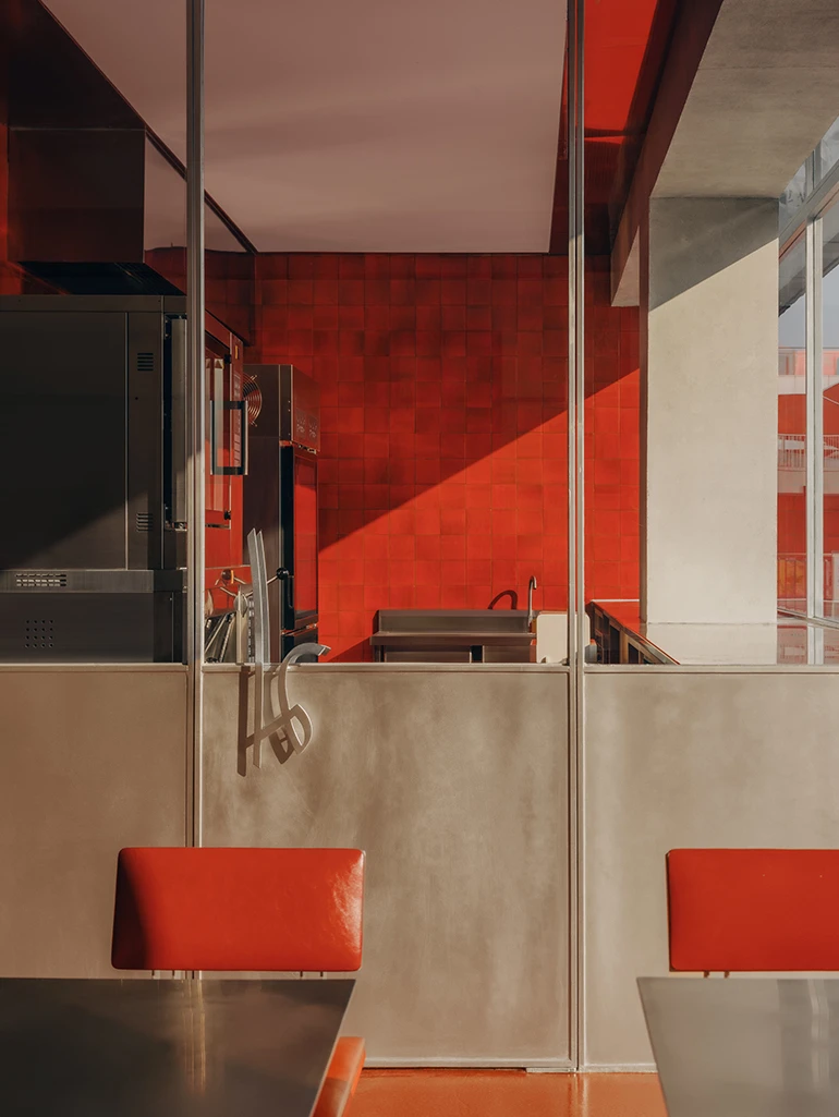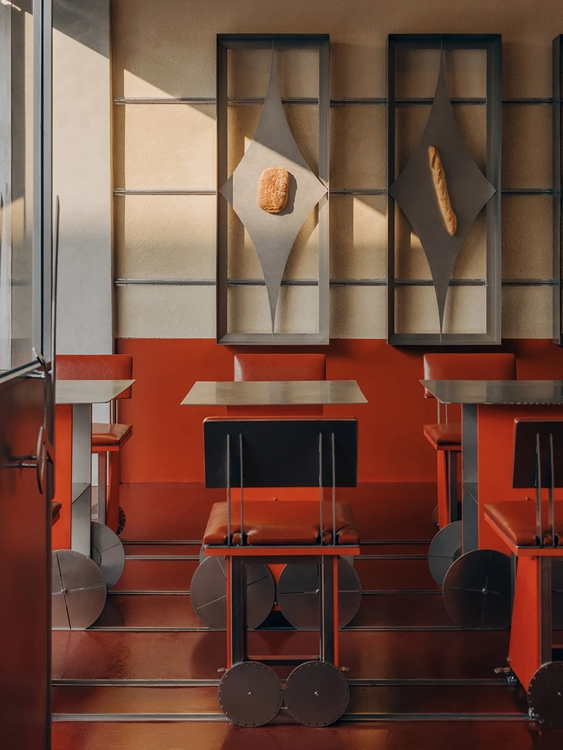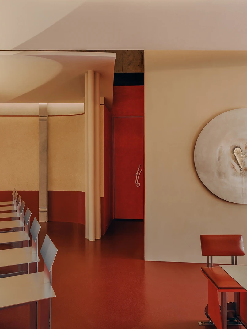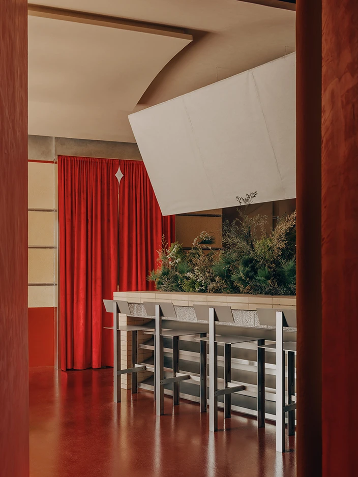 Архитектурный язык строится на повторяющемся наборе геометрических элементов: динамичные кривые, круги и четырехконечные «звезды» используются в разных масштабах и материалах, связывая графическую айдентику с обликом интерьера и фасада. Авторы проекта работали с двумя разными контекстами. Фасад, выходящий на оживленную коммерческую улицу, сформирован рядом полых полуцилиндрических объемов. Они создают полузакрытую «оболочку» пространства, которая минимизирует визуальную перегруженность, одновременно формируя узнаваемый ритм. Встроенные горизонтальные поверхности можно использовать как скамейки. Противоположный фасад открывается в сторону парковой зоны. Здесь используется прозрачная раздвижная перегородка, благодаря которой стирается граница между интерьером и экстерьером.
