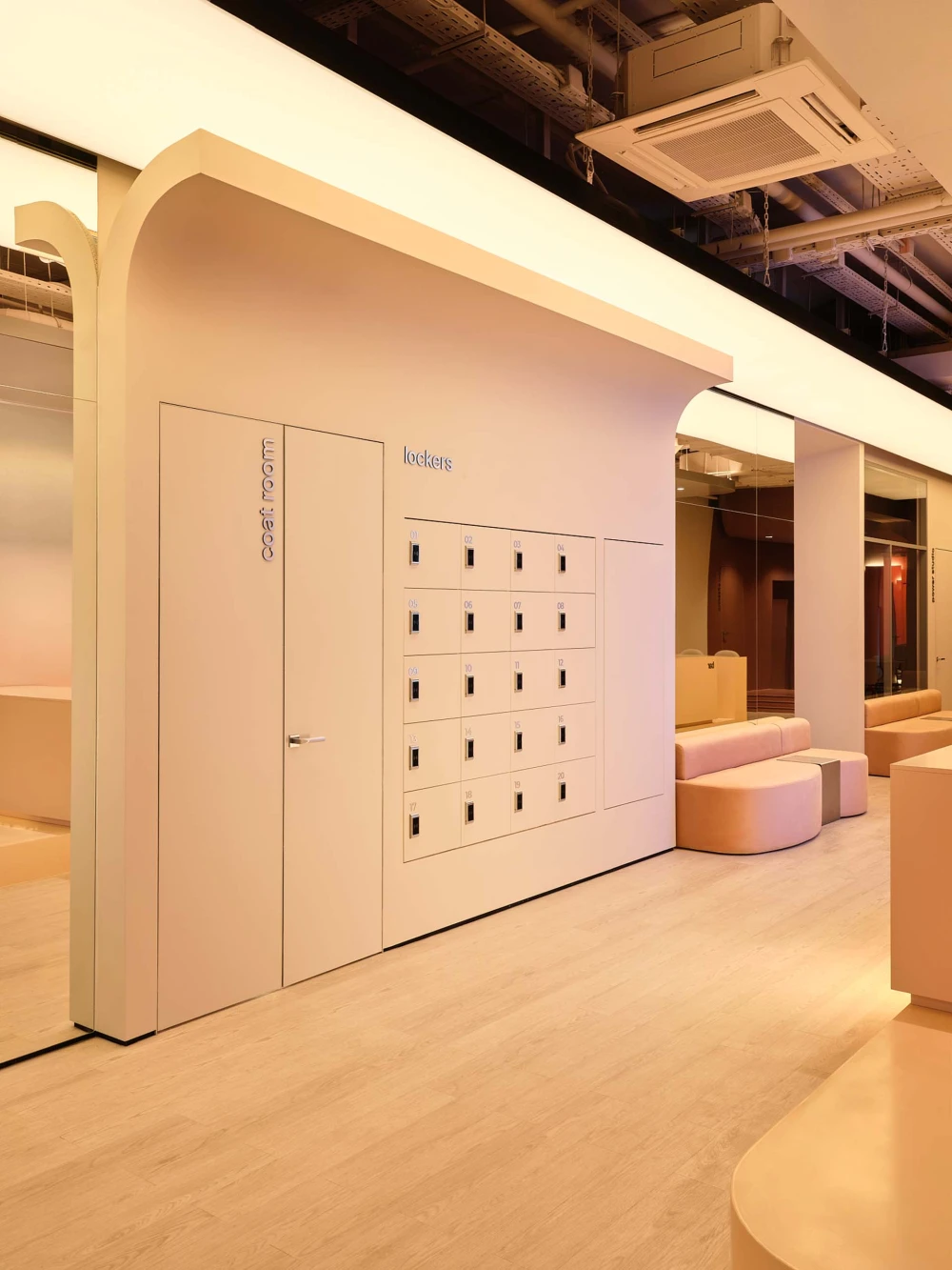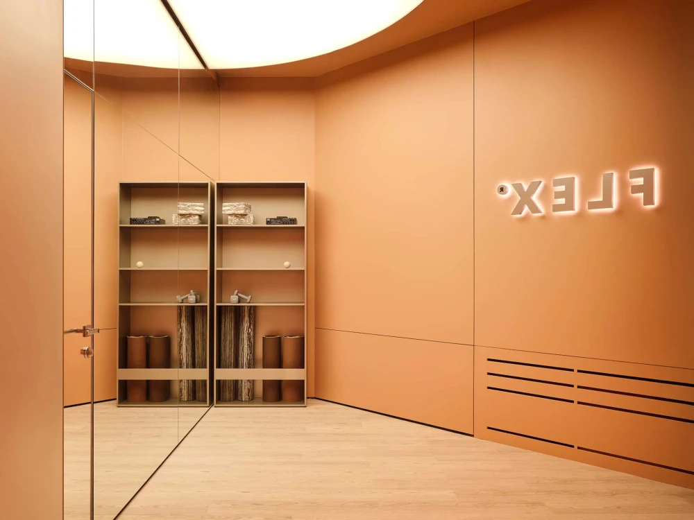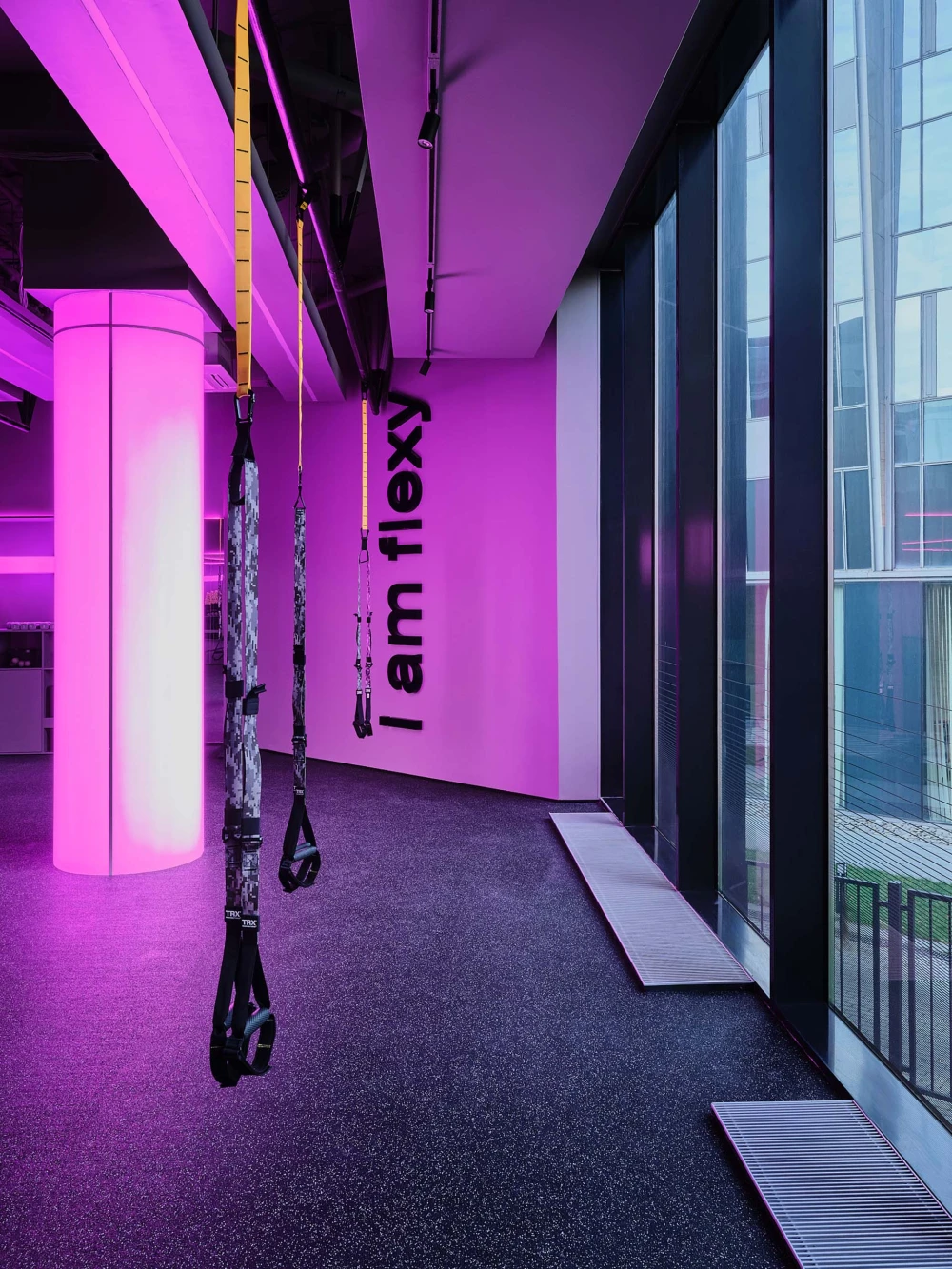 Не меньше внимания уделили функциональности: The Flex — это полноценный фитнес-клуб, где каждая зона должна быть удобной, эргономичной и логично устроенной. Тренажеры и оборудование удалось интегрировать так, чтобы сохранить визуальную легкость пространства. Кастомные лайтбоксы, навесные конструкции и различные сценарии света сформировали ритм интерьера. Для «мягких» направлений выбраны теплые оттенки, а для активных — яркий свет с возможностью менять цветовую гамму, усиливая энергию тренировки. Освещение также решает важную психологическую задачу: взаимодействие с зеркалами в фитнес-клубе неизбежно, и грамотно настроенный свет должен давать ощущение уверенности. Яркие акценты появляются только там, где это оправданно — в гардеробной, офисе продаж и отдельных элементах брендинга.