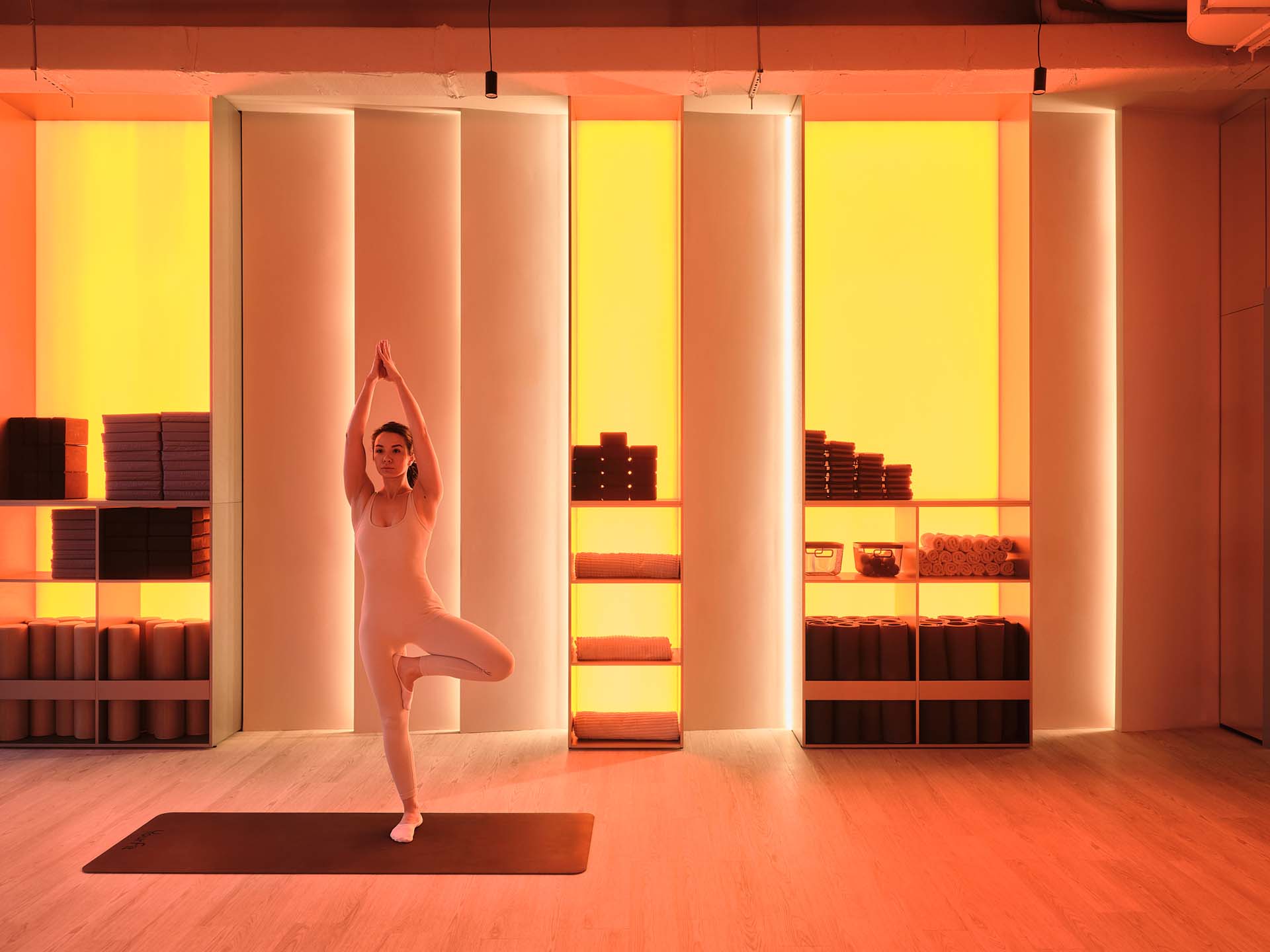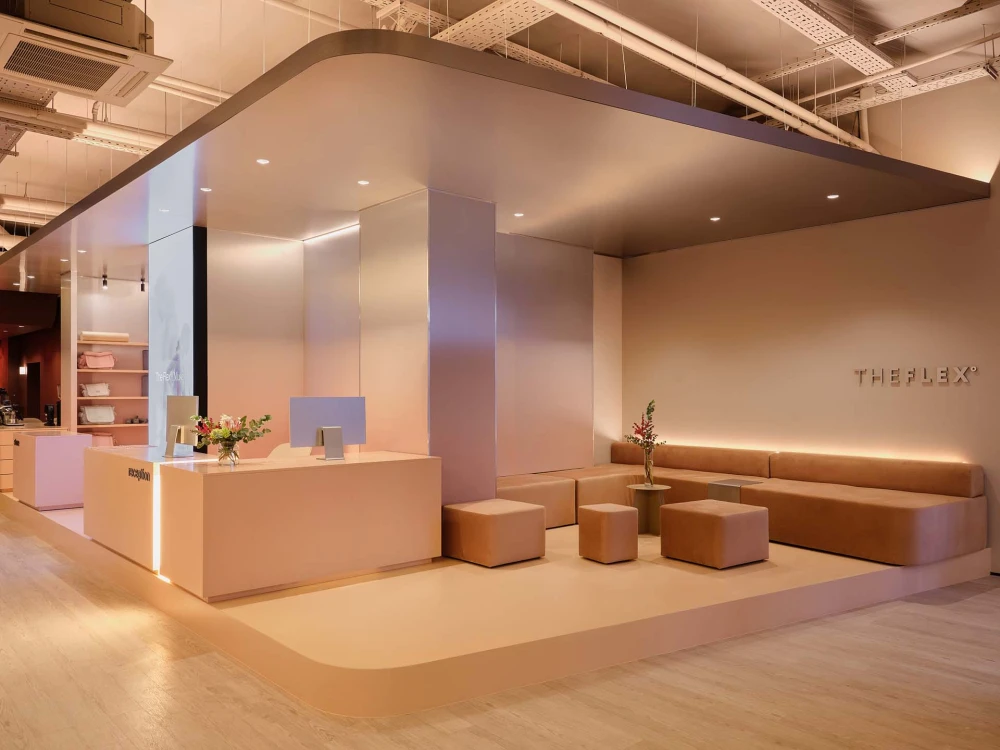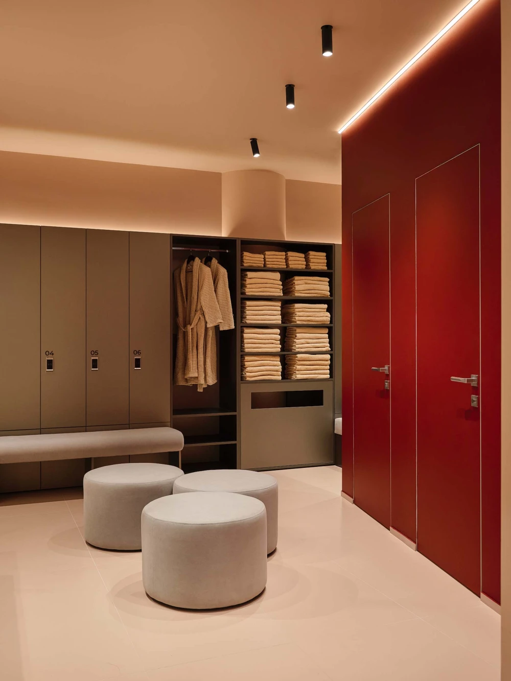 Не меньше внимания уделили функциональности: The Flex — это полноценный фитнес-клуб, где каждая зона должна быть удобной, эргономичной и логично устроенной. Тренажеры и оборудование удалось интегрировать так, чтобы сохранить визуальную легкость пространства. Кастомные лайтбоксы, навесные конструкции и различные сценарии света сформировали ритм интерьера. Для «мягких» направлений выбраны теплые оттенки, а для активных — яркий свет с возможностью менять цветовую гамму, усиливая энергию тренировки. Освещение также решает важную психологическую задачу: взаимодействие с зеркалами в фитнес-клубе неизбежно, и грамотно настроенный свет должен давать ощущение уверенности. Яркие акценты появляются только там, где это оправданно — в гардеробной, офисе продаж и отдельных элементах брендинга.