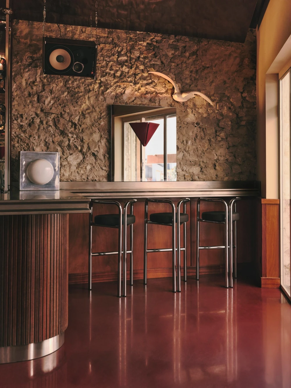 Выполненный из смолы глубокого бордового оттенка пол отражается в лакированном потолке, массивные бра красного цвета обеспечивают мягкое теплое освещение, усиливая ощущение глубины. Кухня расположена на уровне выше основного зала и скрыта за атласными шторами от пола до потолка. Такое решение позволяет визуально отделить рабочую зону, не нарушая целостности пространства. Одним из ключевых элементов интерьера стала барная стойка из цинка и дерева, расположенная перед стеллажом с полками из дымчатого стекла со скругленными краями.