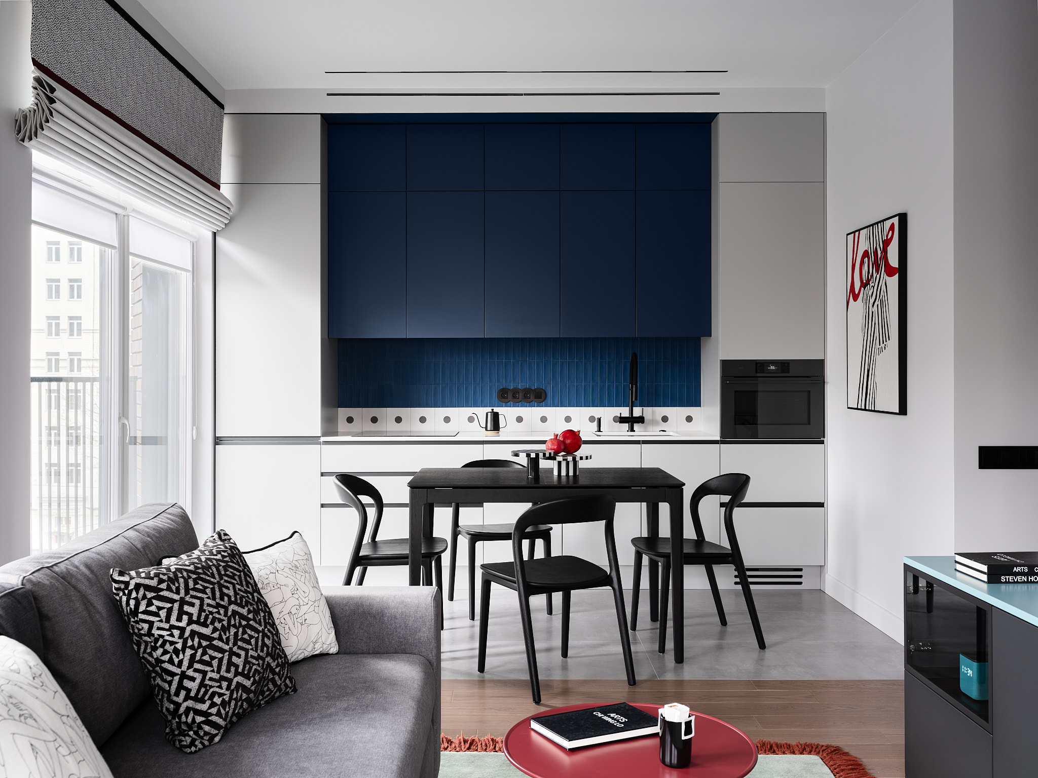 Отделка максимально простая: все стены под покраску, на полу —керамогранит и инженерная доска. Никакой лепнины и декоративных покрытий. В основном пространстве внимание привлекает кухня с синими навесными шкафами и фартуком в тон, сделанным их двух разных коллекций плитки. Нижний ряд выполнен из белой плитки с черными кругами, этот мотив повторяется в виде круглых ручек на стеллаже в гостиной и крючков для вещей в прихожей.