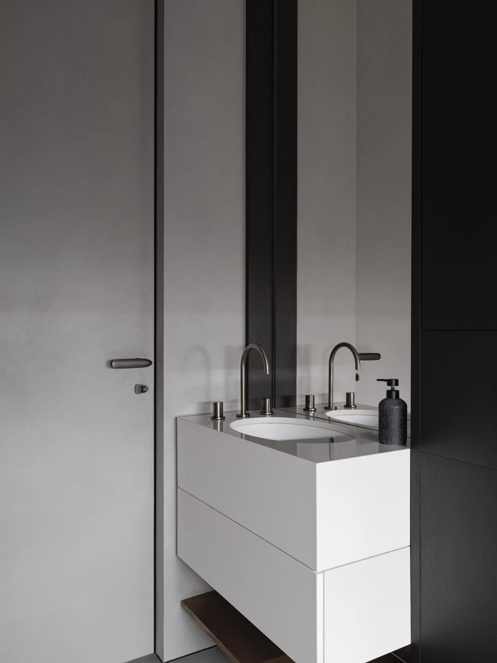 «Кухня, гостиная, прихожая и гостевая спальня организованы как большое свободное пространство с монументальным темным кубом из шпона в центре. Это решение позволило создать вариативные сценарии для передвижения по квартире. К одной из граней куба примыкает визуально легкая кухня с функциональным островом для хранения. С одной стороны от кухни организован эффектный кофепоинт с мягкой подсветкой, а с другой — функциональные закрытые шкафы-колонны. Гостевая спальня с радиусной стеной примыкает к гостиной. При желании ее можно изолировать с помощью раздвижных перегородок с бронзовыми ручками. Приватные комнаты — главная спальня с гардеробом и детские — отделены от кухни-гостиной парадным холлом и арочными дверьми».