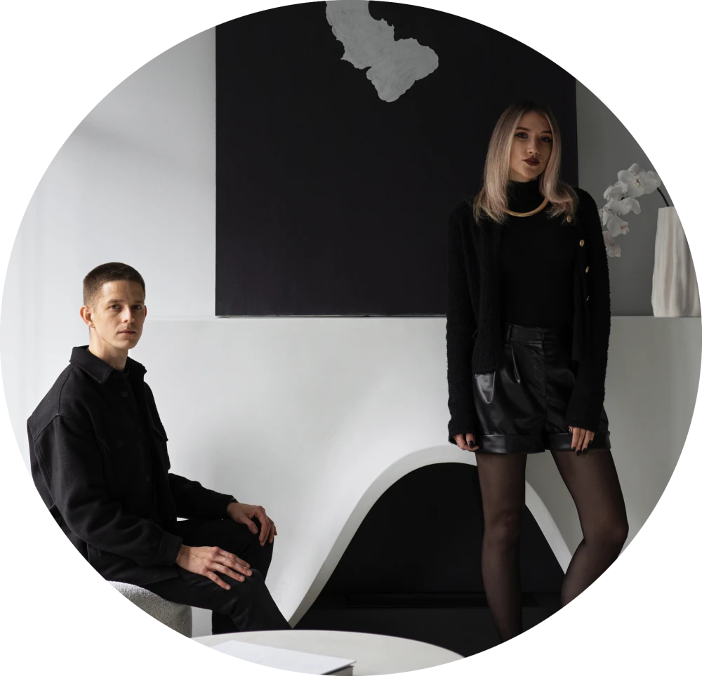 «Основой стала светлая чистая палитра, на которой в качестве монументальных контрастов — глубокий темный шпон. Особый парадный блеск интерьеру придают бронза и кварцит Patagonia, использованные на кухонных поверхностях. Многоцветный узор камня перекликается со всей гаммой оттенков в пространстве. Гармония, построенная на сочетаниях фактур тканей и материалов, связывает предметы между собой в единую визуальную и тактильную композицию. Все элементы повторяют и отсылают к формам друг друга. Так, например, белой аморфной форме на холсте Виктора Алимпиева вторит скульптура от Анны Глазовой на журнальном столе».
