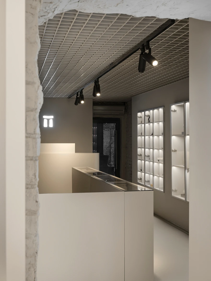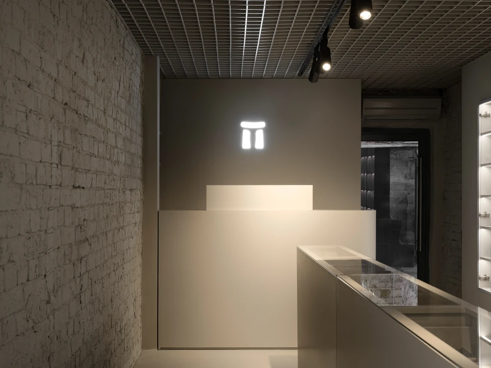 «У компании уже есть магазины, и они хорошо понимали сценарий работы и свои удобства и неудобства в связи с ней, — говорят авторы проекта. — Было несколько четких требований: оставить открытый потолок со сводами и кирпичом, использовать мягкое напольное покрытие, чтобы камни не разбивались при падении, организовать зону для подбора и презентации мелких камней, проработать освещение, жизненно важное для демонстрации минералов, и избежать музейности — нужен был современный, живой интерьер, который работает как фон».