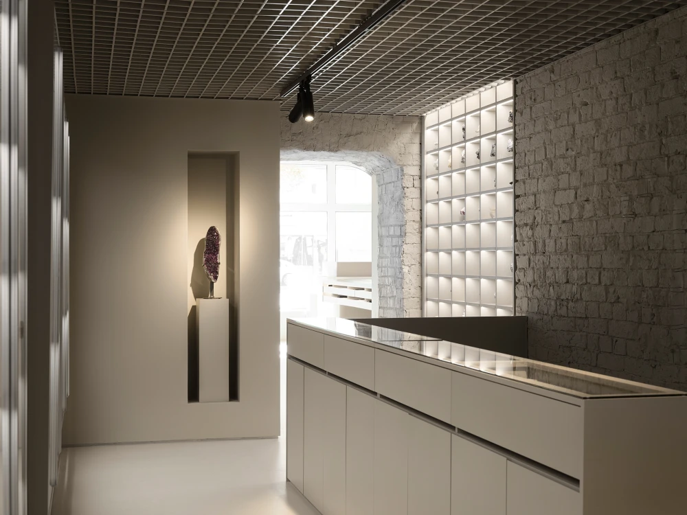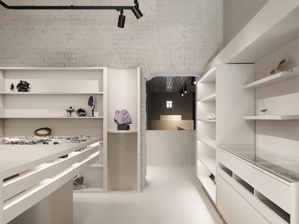 Архитекторы предложили построить интерьер на контрасте двух миров. Первый этаж — светлый, монохромный, открытый и «для всех». Подвал — темный, камерный, почти «пещерный», где хранятся сокровища, который легко трансформируется в лекционный зал. «В магазине более 500 наименований товара, — продолжают авторы проекта, — от крупных минералов до мелких образцов, часть под стеклом, часть открыта. Мы создавали четкую систему: строгий ритм витрин и стеллажей, разные форматы выкладки, монохромный фон, чтобы ничего не спорило с фактурой камня. Одной из задач была работа с весом товара — крупные экспонаты весят по 100–150 кг. Мы разрабатывали усиленные полки совместно с конструкторами мебели. Один экспонат настолько тяжелый, что во время съемки его не смогли сдвинуть — для этого бы потребовались несколько грузчиков».