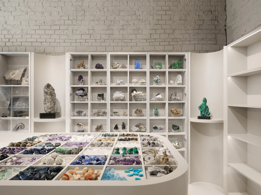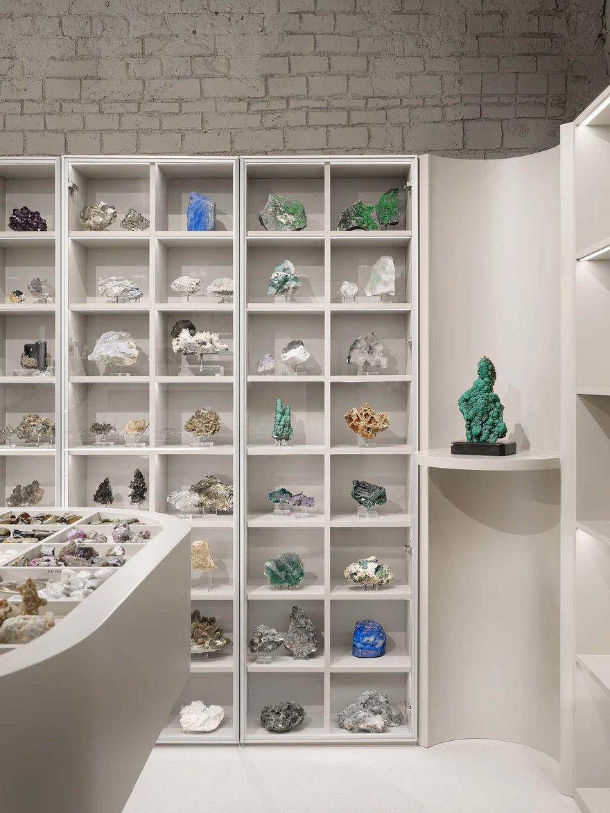 «Обычно минералы показывают либо в ультрамузейной среде, либо в хаотичных витринах, — резюмируют архитекторы. — Мы создали выразительный современный интерьер, который работает как фон, подчеркивает ценность экспонатов, собирает людей, формирует культурное пространство вокруг бренда. По сути, это не просто магазин, а аккуратно выстроенный опыт погружения в тему минералов».