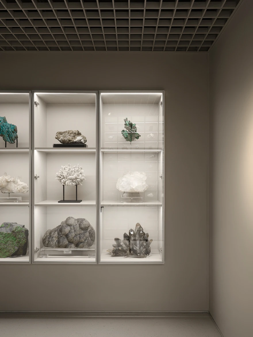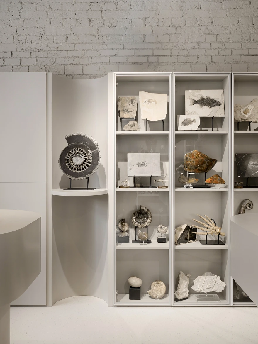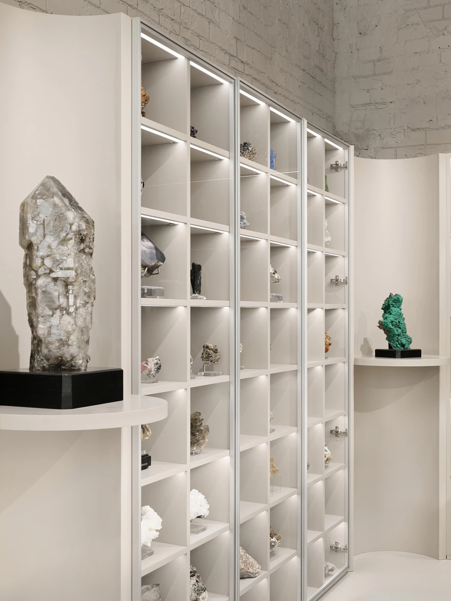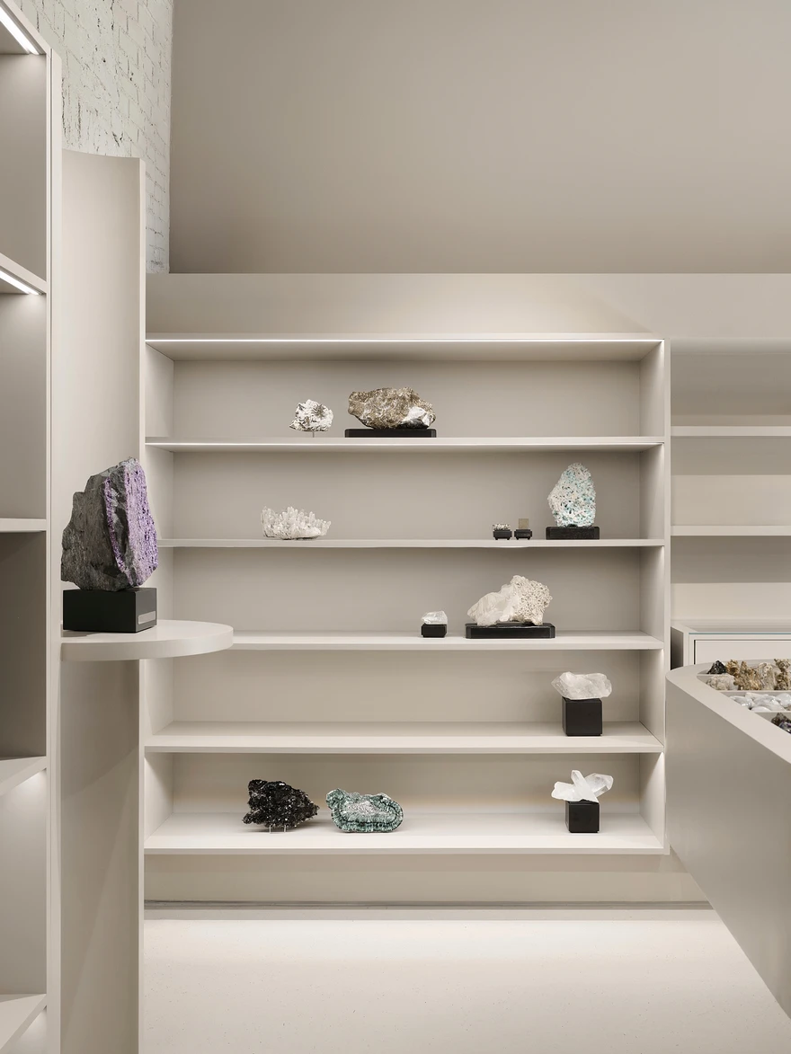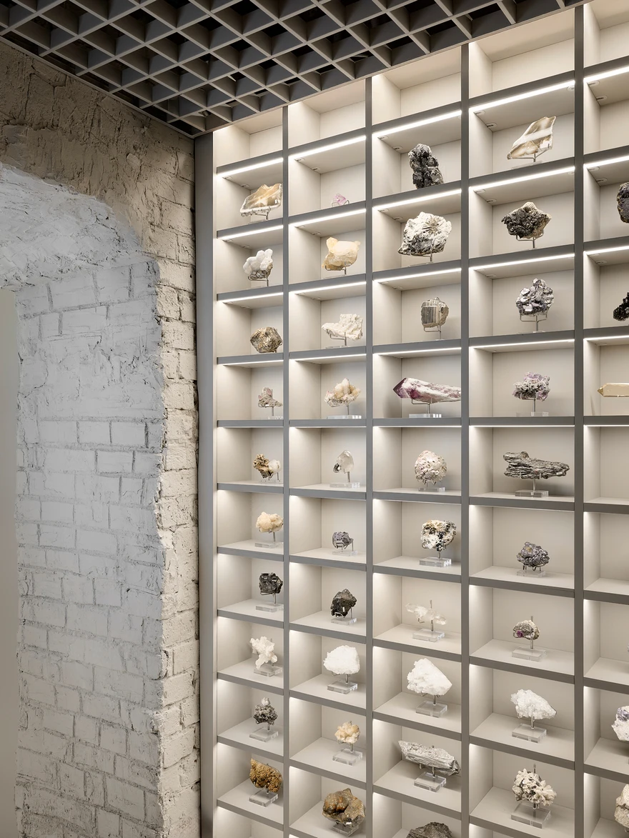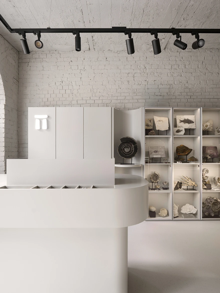 «Заказчик — настоящий фанат своего дела, геолог по образованию, — рассказывают архитекторы. — Он организует экспедиции в отдаленные уголки мира, где ищет уникальные минералы, метеориты, окаменелости. Вокруг него уже сложилось активное комьюнити: они ездят в экспедиции, ходят на лекции, собираются вместе и изучают удивительный мир камней. Магазин стал для них не просто точкой продаж, а пространством для встреч, обмена опытом и погружения в тему».