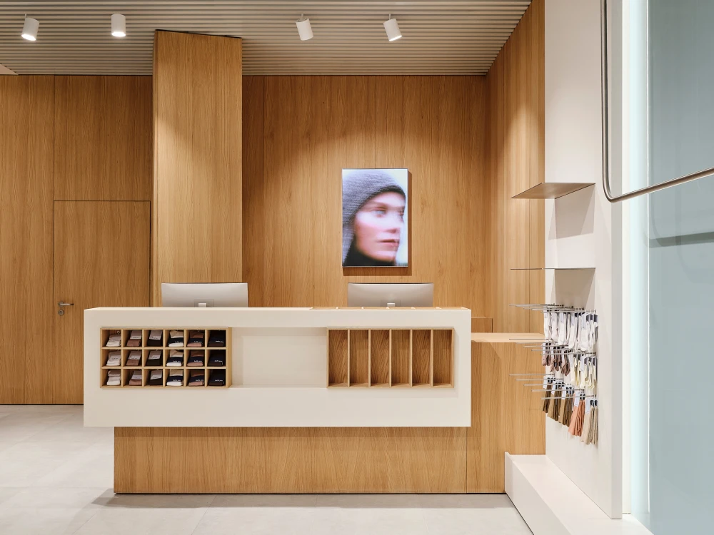 В работу архитекторам досталась стандартная торговая ячейка в ТРЦ «Павелецкая Плаза» с колонной в центре. Ее команда отделала шпонированными панелями, сделав органичной частью кассовой зоны. Дерево сочетается с молочным и зелено-голубыми оттенками, создавая теплую, расслабляющую атмосферу.